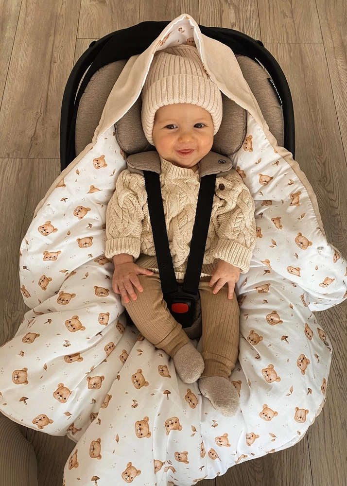 Kocyk otulacz do fotelika z kapturkiem MUŚLINOWY ocieplany
