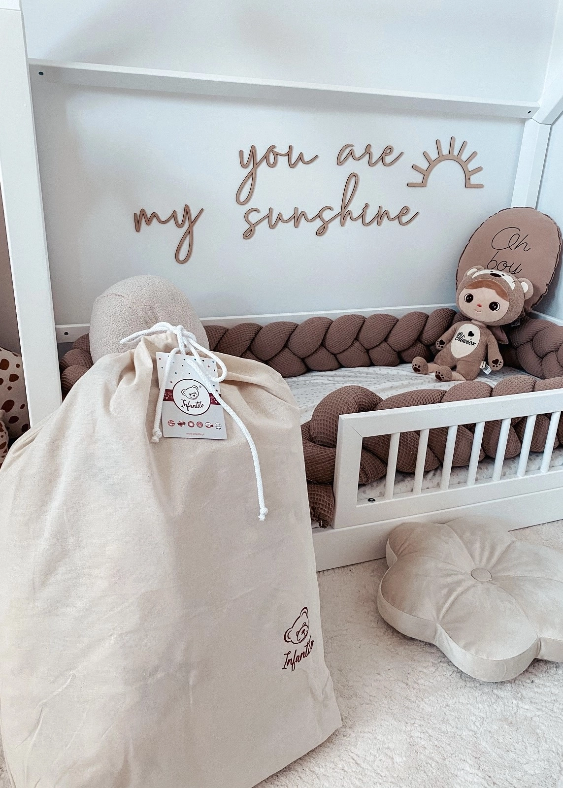 - Pojemny worek (50×70 cm) – uszyty z bawełny o naturalnej strukturze, idealny do przechowywania pościeli lub jako torba przedszkolna.