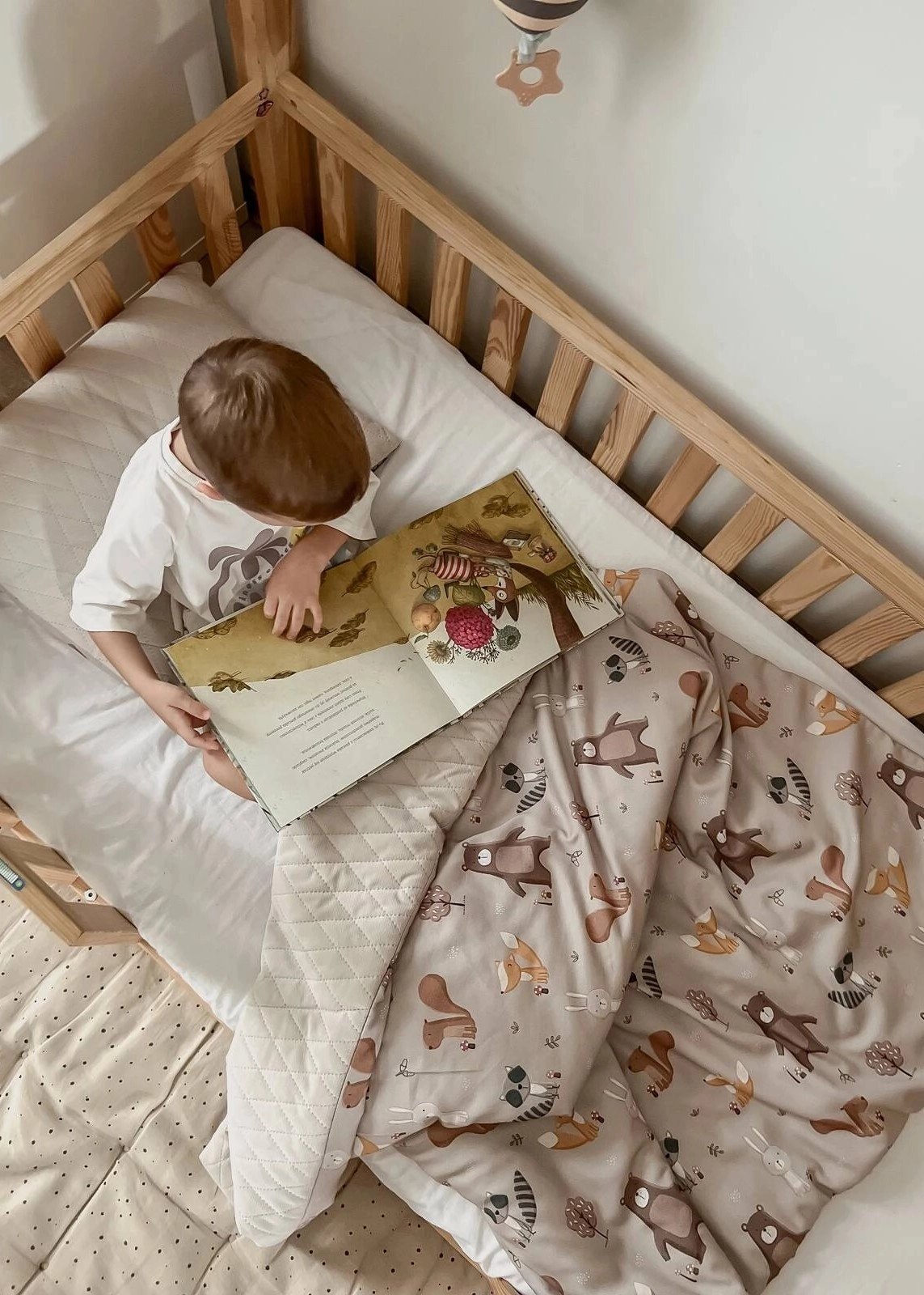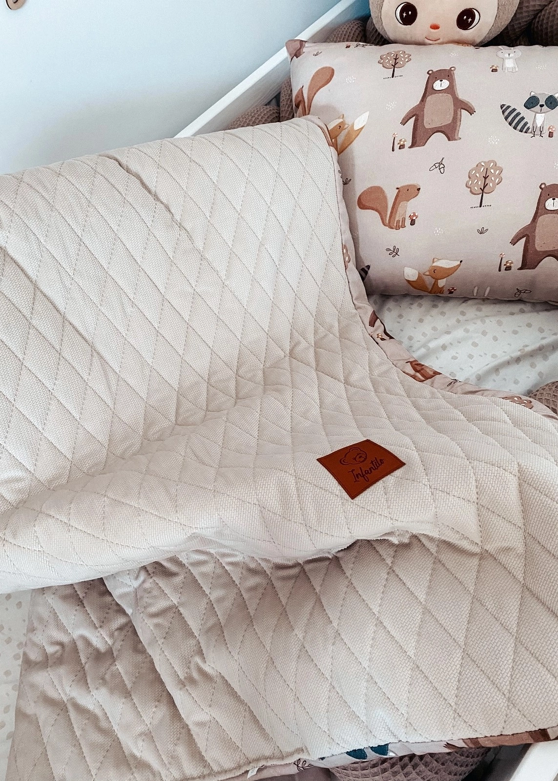 - Duży kocyk (100×135 cm) – z jednej strony miękki velvet pikowany, z drugiej oddychająca bawełna w pięknych, dziecięcych wzorach.