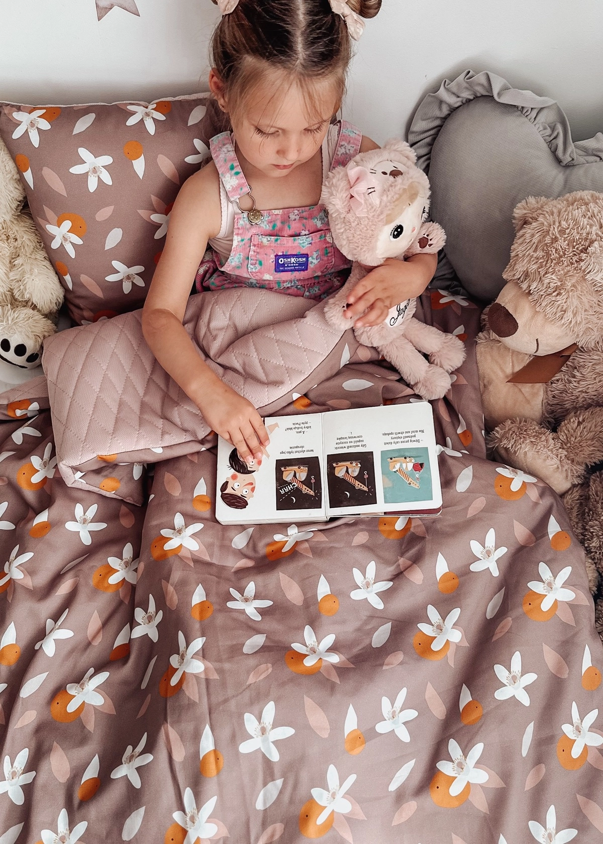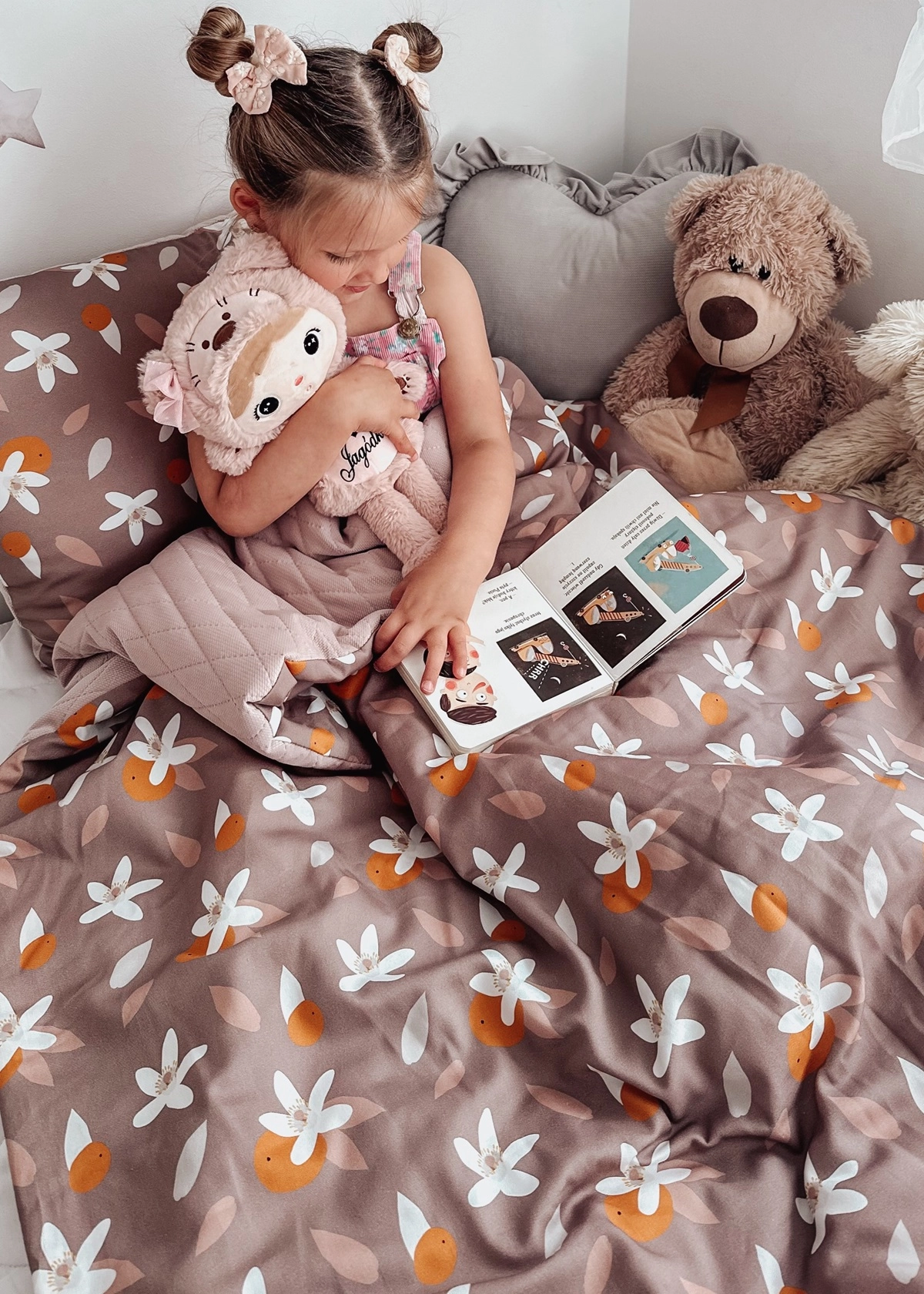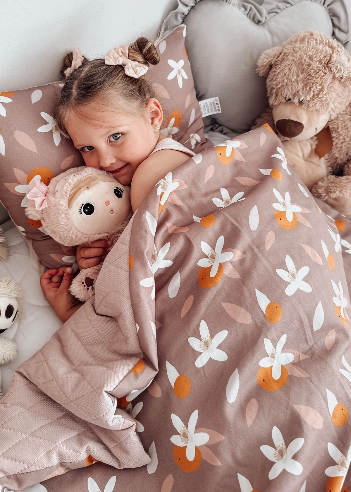 - Duży kocyk (100×135 cm) – z jednej strony miękki velvet pikowany, z drugiej oddychająca bawełna w pięknych, dziecięcych wzorach.