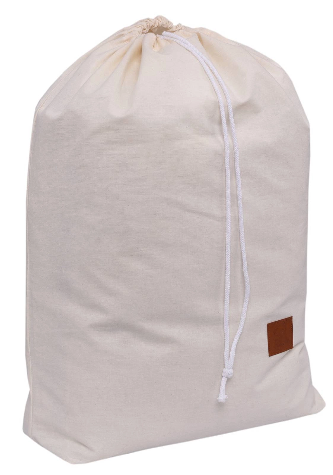 - Pojemny worek (50×70 cm) – uszyty z bawełny o naturalnej strukturze, idealny do przechowywania pościeli lub jako torba przedszkolna.