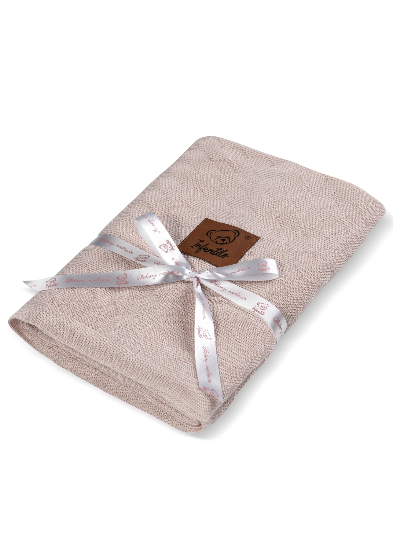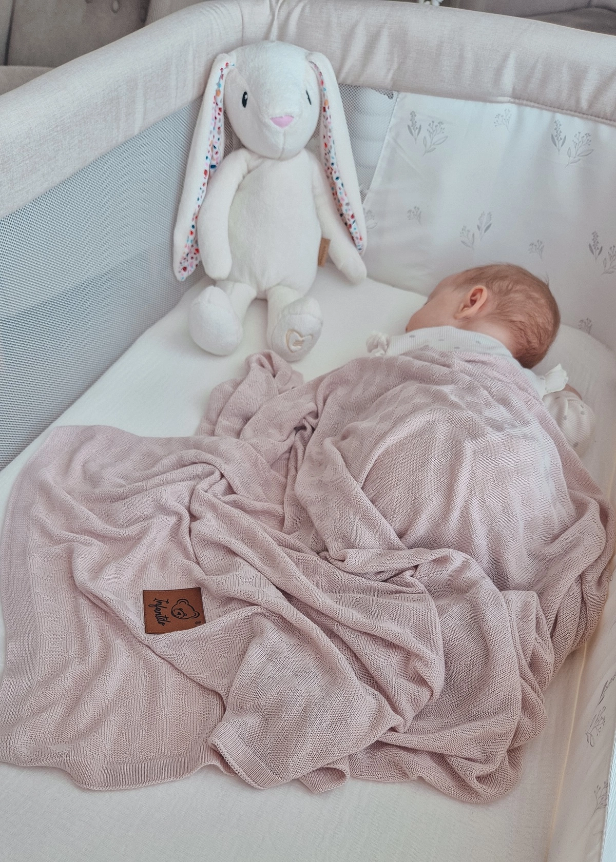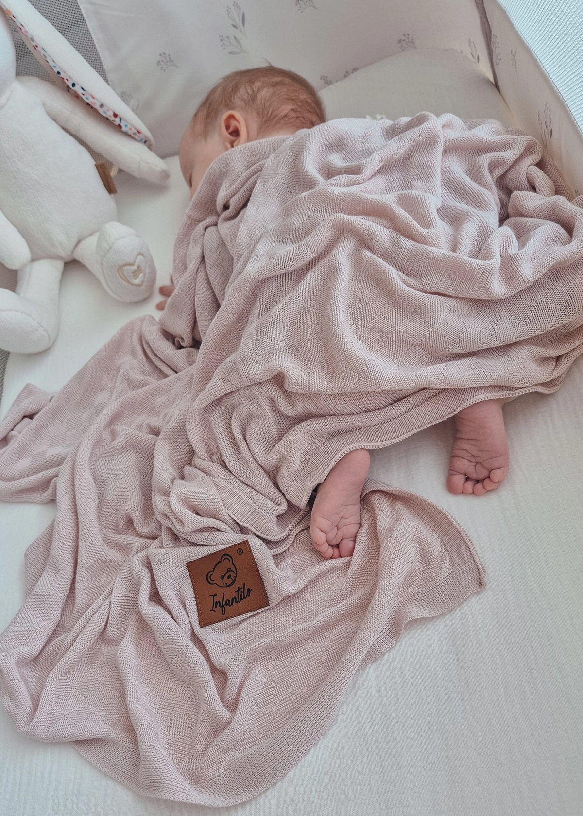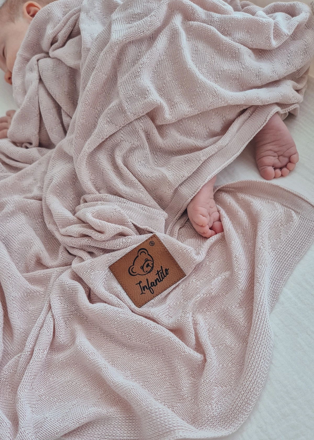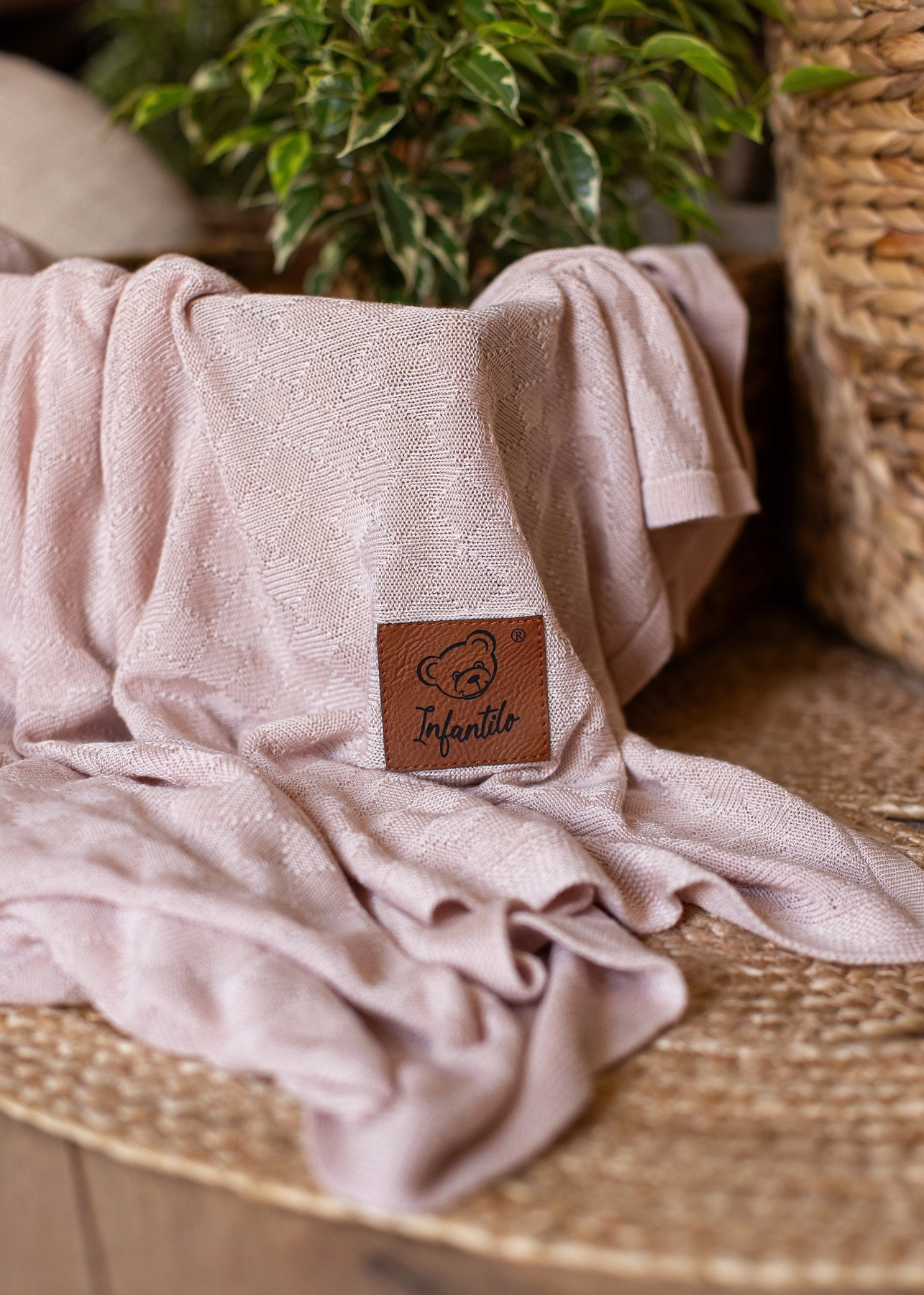 Ten kocyk to nie tylko piękny dodatek do dziecięcej wyprawki – to bezpieczna i przemyślana otulinka na każdą porę roku. Uszyty w 100% z bambusowej przędzy o wyjątkowym splocie małych rombów. Otulacz dziany jest bardzo delikatny i lekki jak chmurka. Użyty materiał posiada niezwykłe właściwości termoregulacyjne, dzięki czemu możemy z niego korzystać przez cały rok