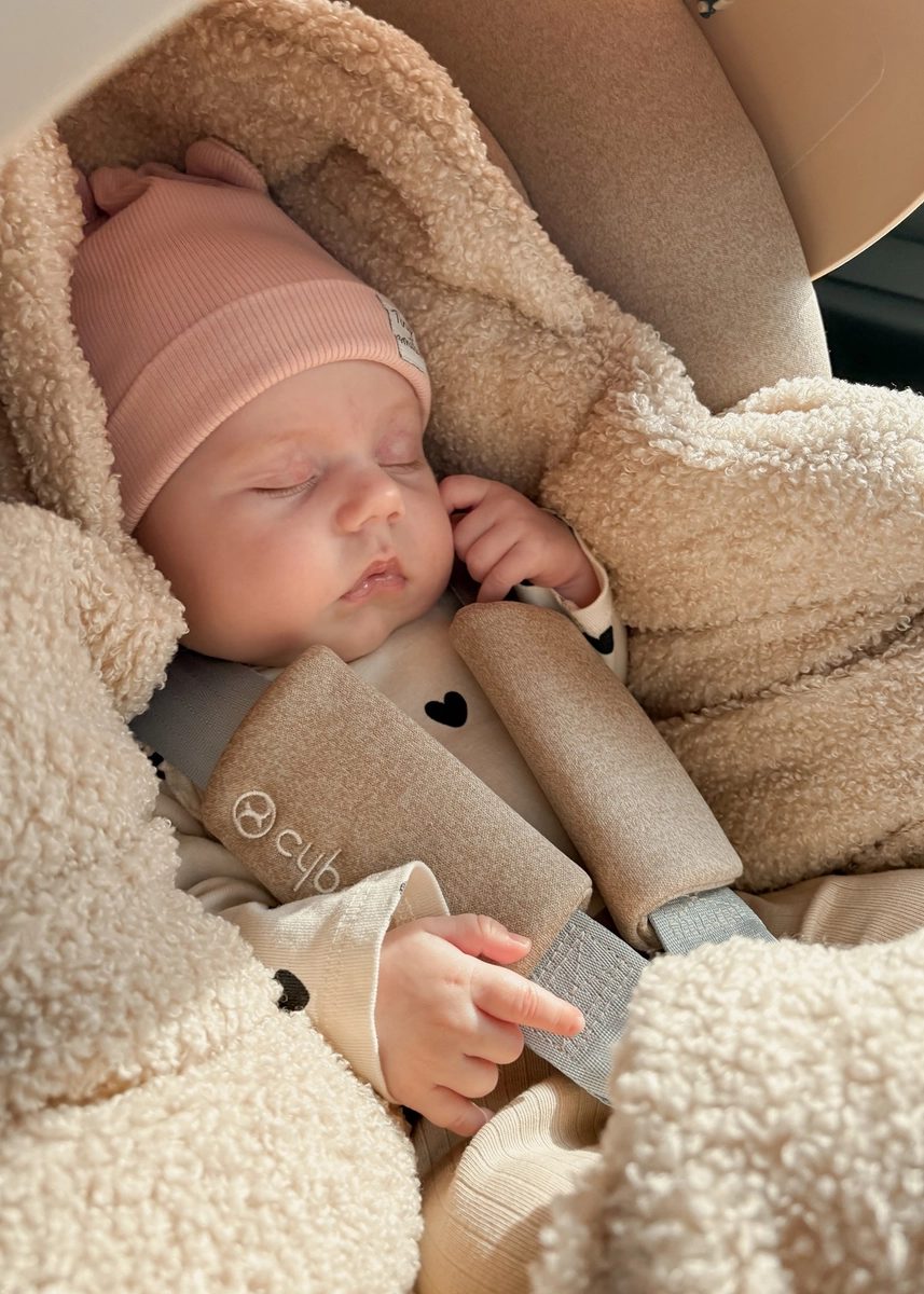Model wyposażony jest w otwory na pasy bezpieczeństwa (dopasowane do 3- i 5-punktowych pasów), co pozwala bezpiecznie używać go w nosidełku, foteliku samochodowym czy wózku. Otwory zostały wykonane specjalistyczną dziurkarką, co gwarantuje ich trwałość i estetyczne wykończenie.