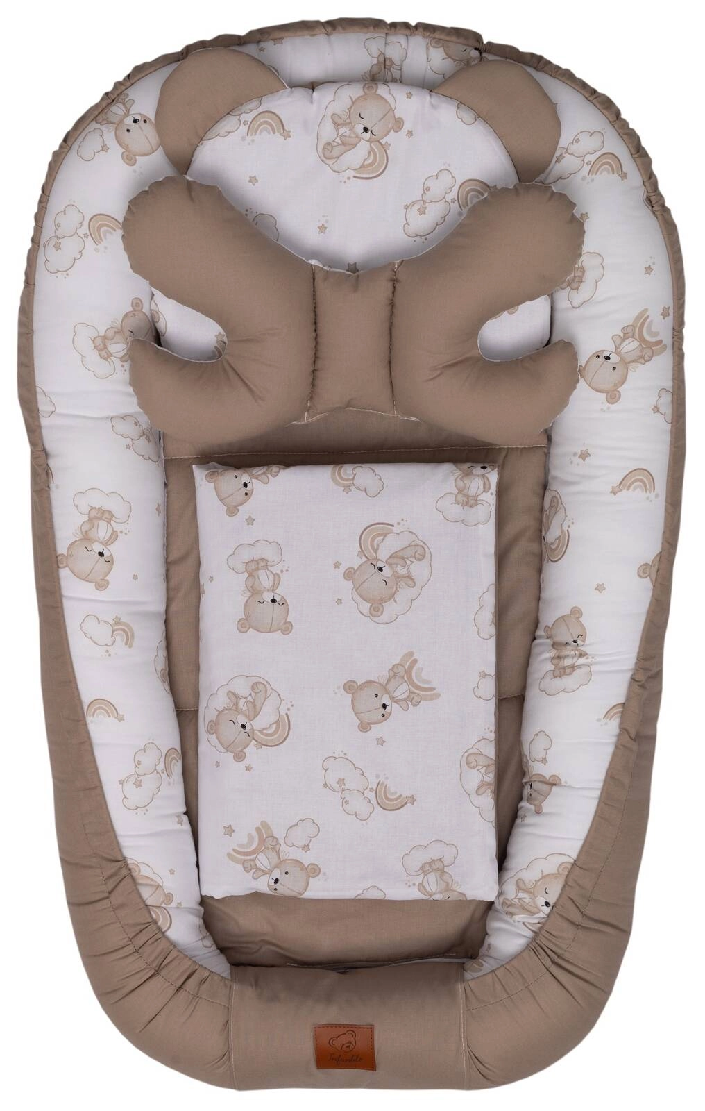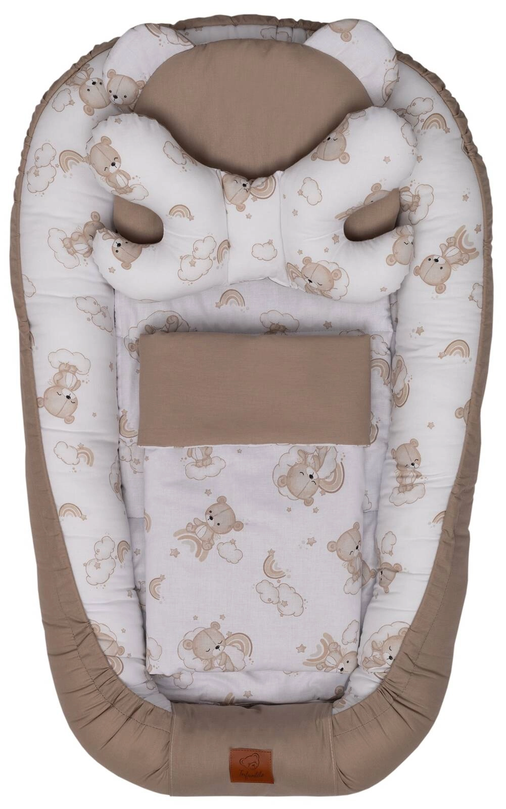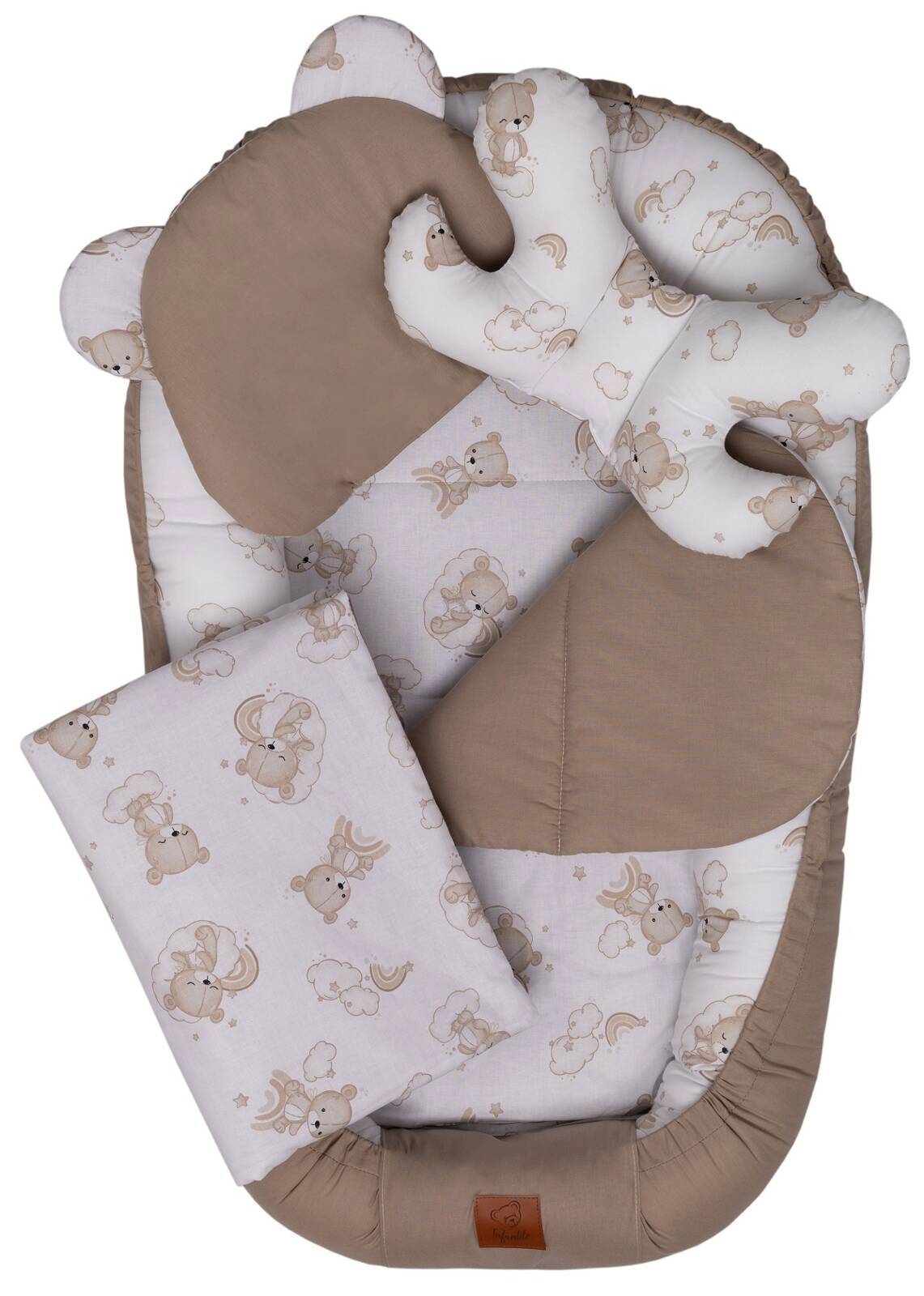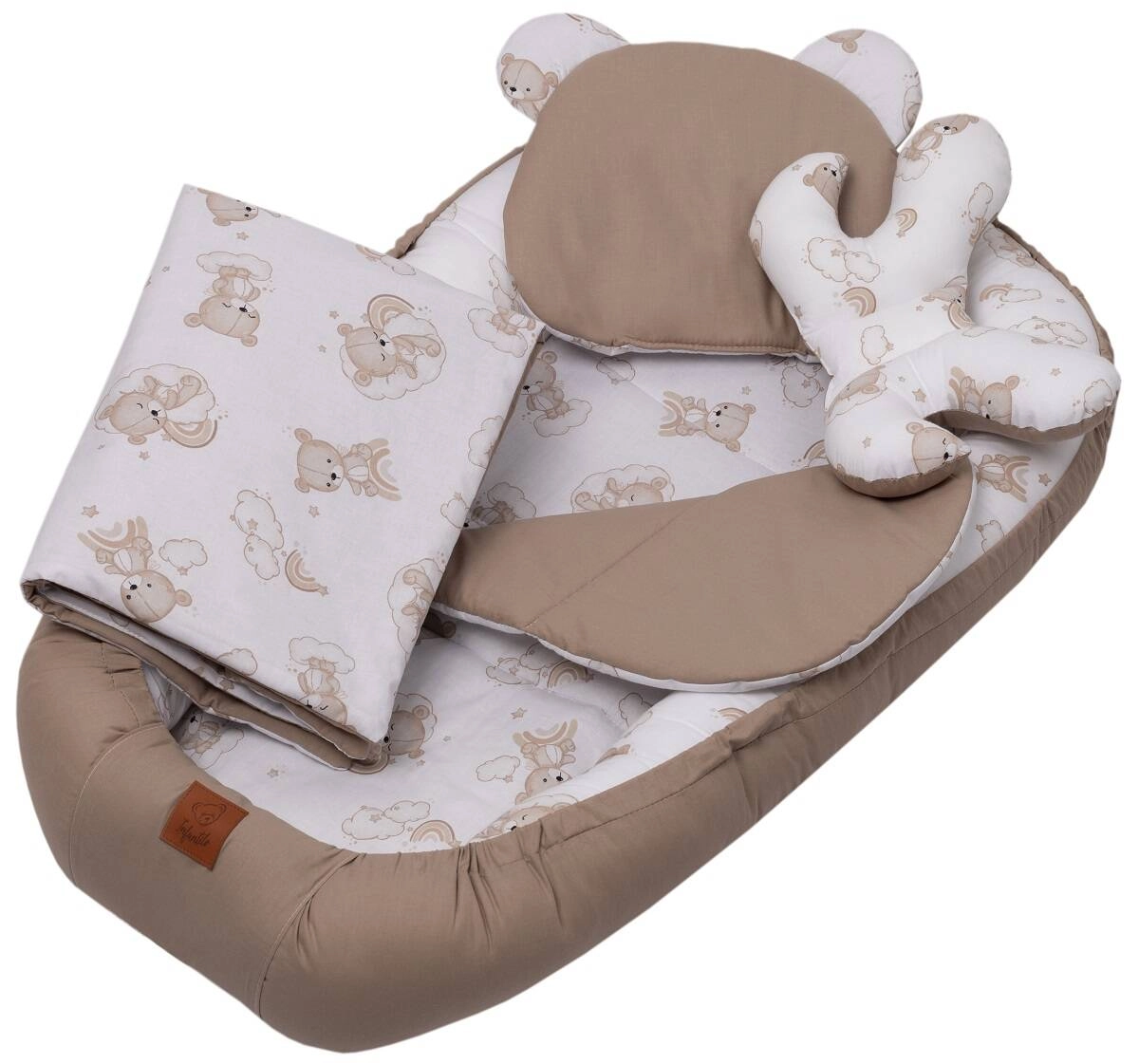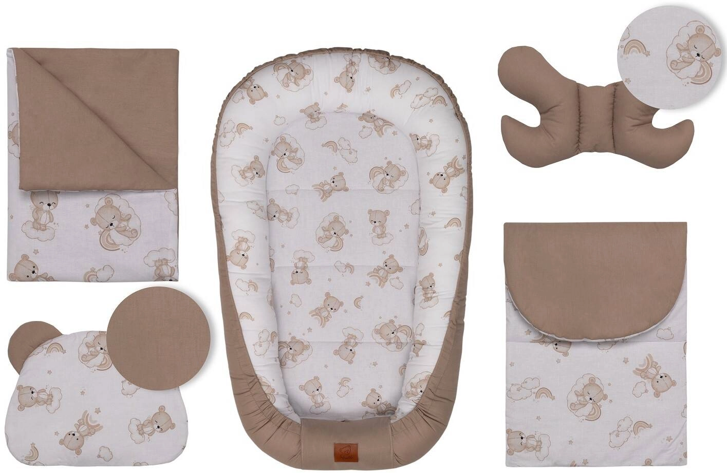 Zestaw składa się aż z pięciu elementów: kokonu, wyjmowanego materacyka, poduszki w kształcie misia, poduszki motylka oraz kołderki. Wszystkie produkty są dwustronne. Z jednej strony uszyte z gładkiej bawełny, z drugiej z ciekawym dziecięcym wzorem.