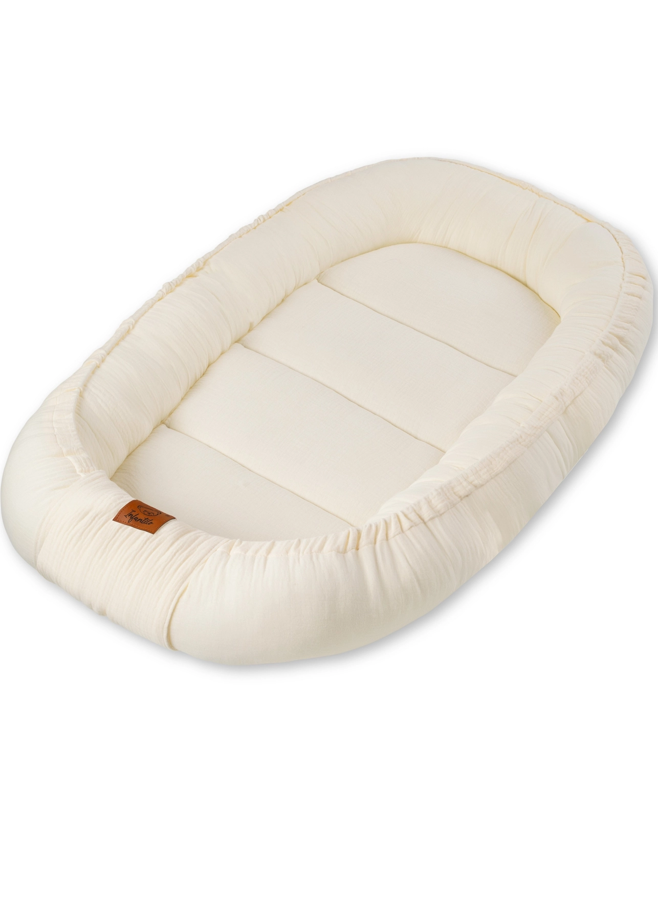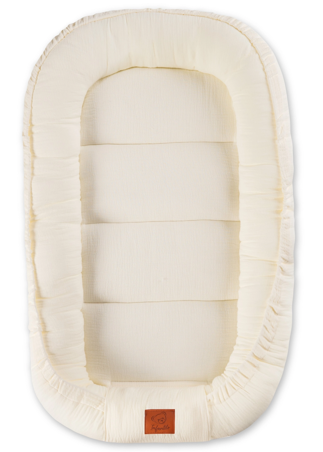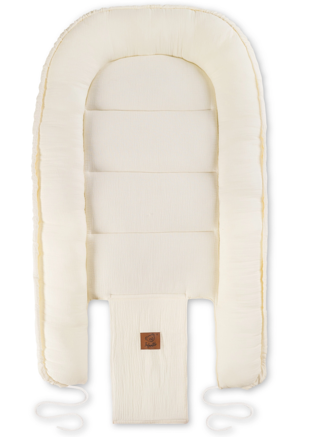 Nasz kokon niemowlęcy został wykonany z najwyższej jakości 100% bawełny muślinowej double gaze, co gwarantuje jego wyjątkową miękkość, przewiewność oraz bezpieczeństwo dla delikatnej skóry dziecka. Elegancki design sprawia, że kokon stanowi nie tylko praktyczne, ale i stylowe uzupełnienie pokoju dziecięcego. Kokon został tak stworzony aby zapewnić dziecku bezpieczeństwo i komfort użytkowania. Dodatkowa klapa zabezpieczająca sznurki zapewnia, bezpieczne wykończenie całej konstrukcji.