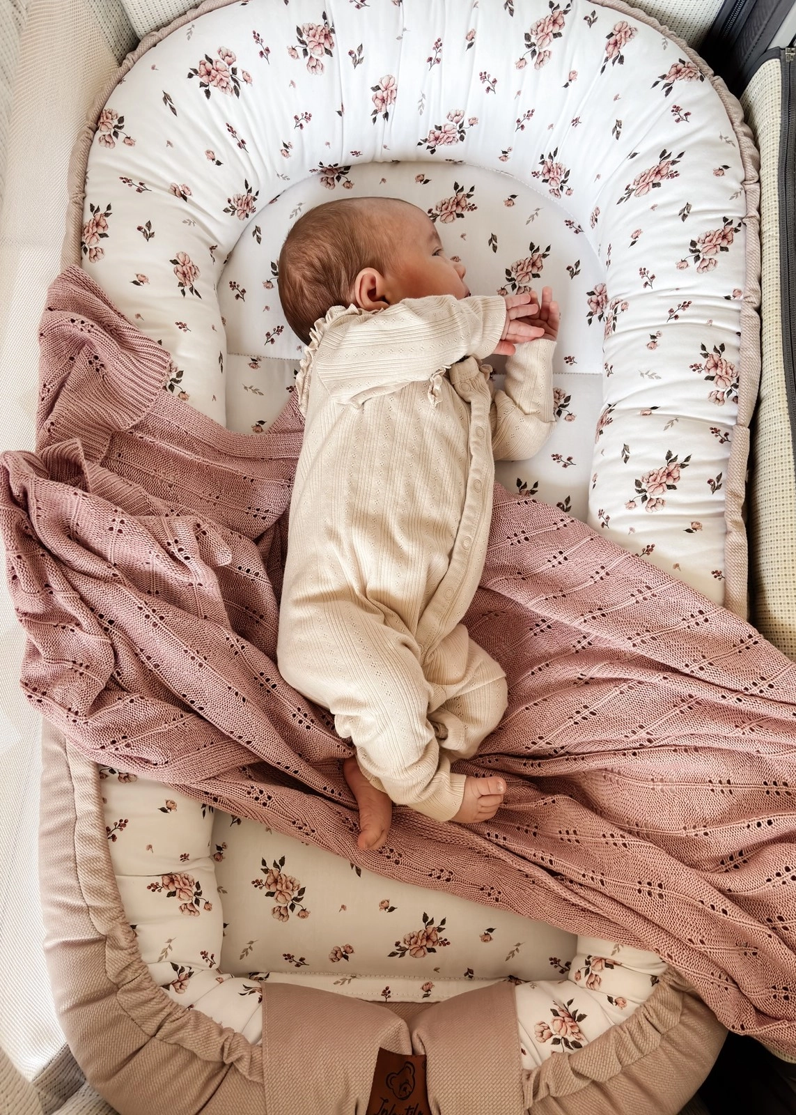 Bawełna satynowa to luksusowy, gładki i przewiewny materiał, idealny dla delikatnej skóry niemowlęcia. Velvet dodaje miękkości i sprawia, że kokon jest jeszcze bardziej przytulny.