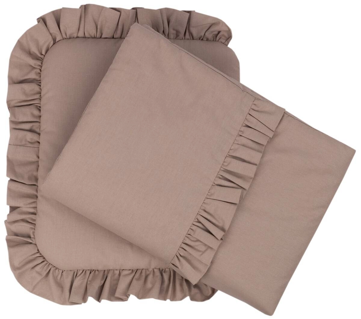 - Pościel do wózeczka, składająca się z dwóch elementów - poduszki i kołderki, wykończona dekoracyjną falbanką.