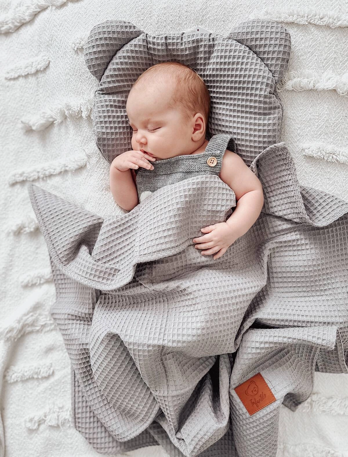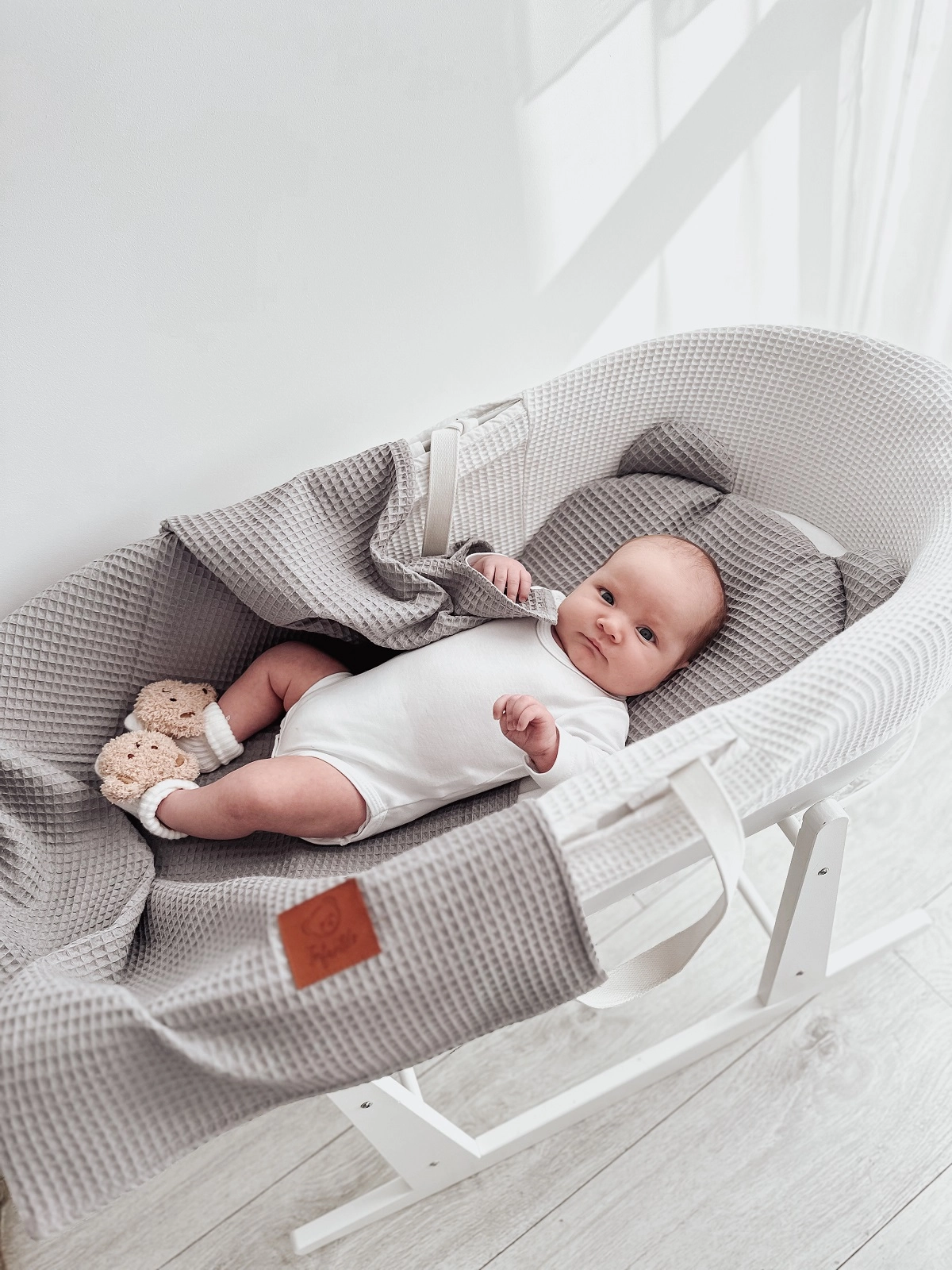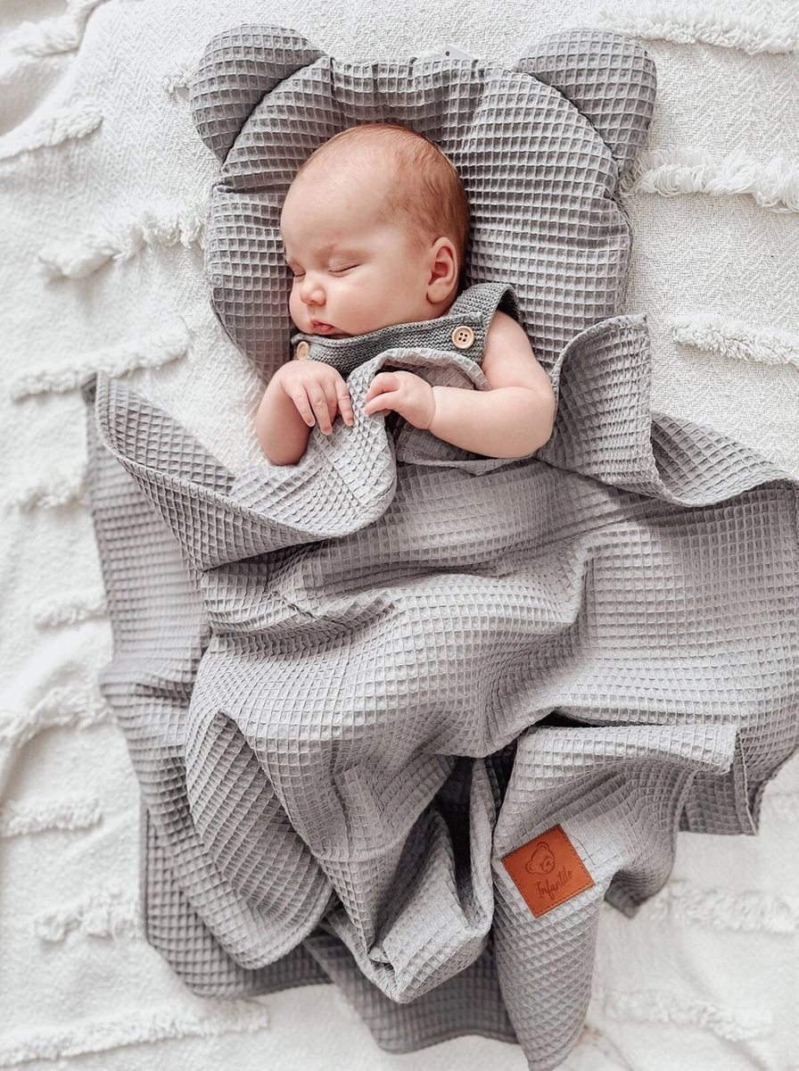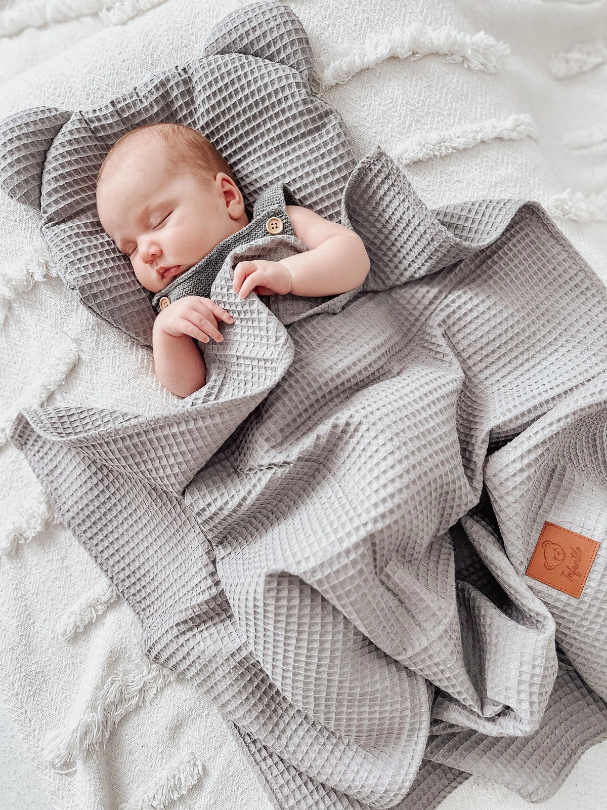 Ciekawy splot bawełny powoduje, że komplet "WAFFLE" pełni również funkcję ozdobną pokoiku oraz wózka dziecięcego.