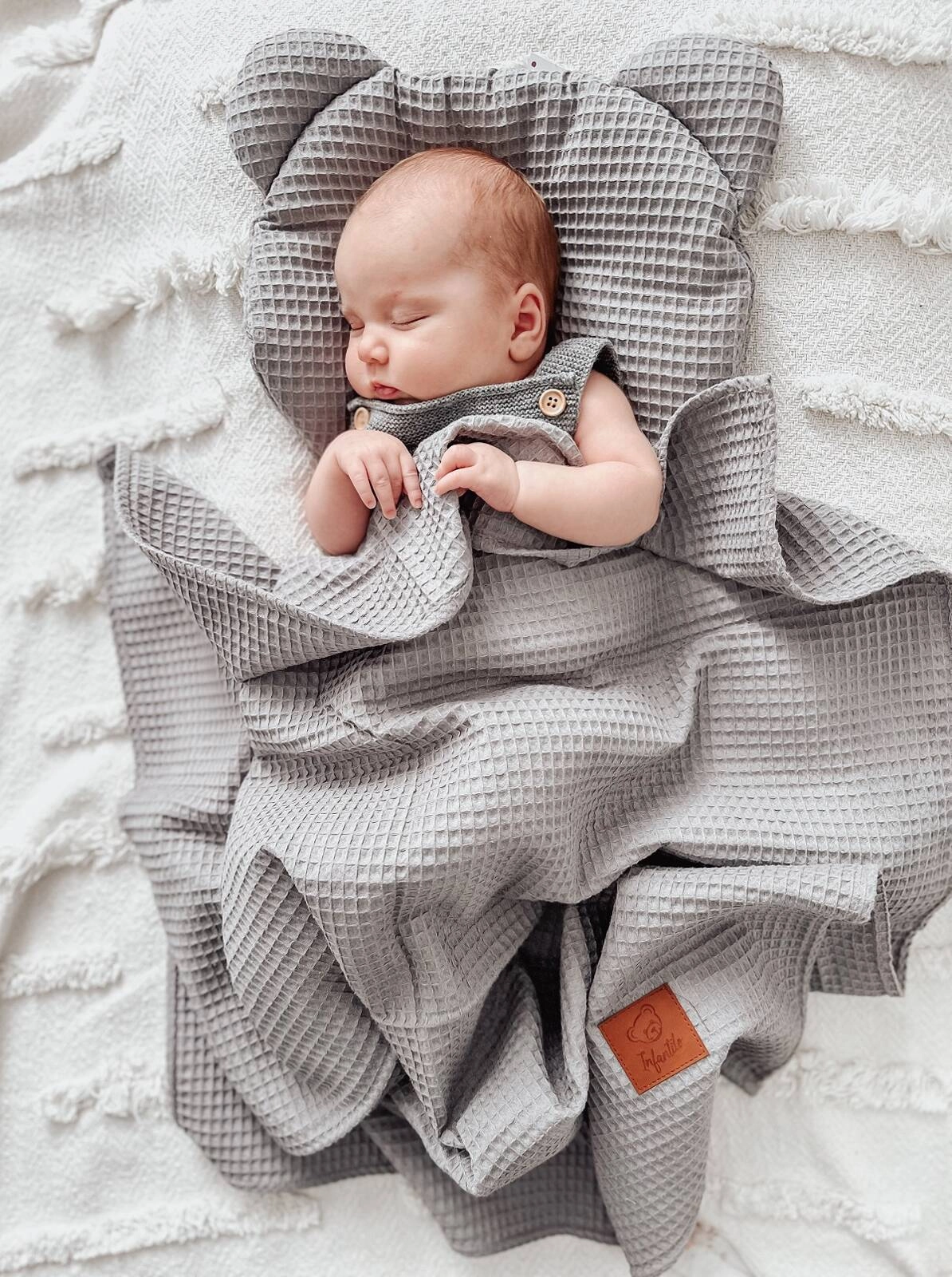 - Ciekawy splot bawełny powoduje, że komplet "WAFFLE" pełni również funkcję ozdobną pokoiku oraz wózka dziecięcego