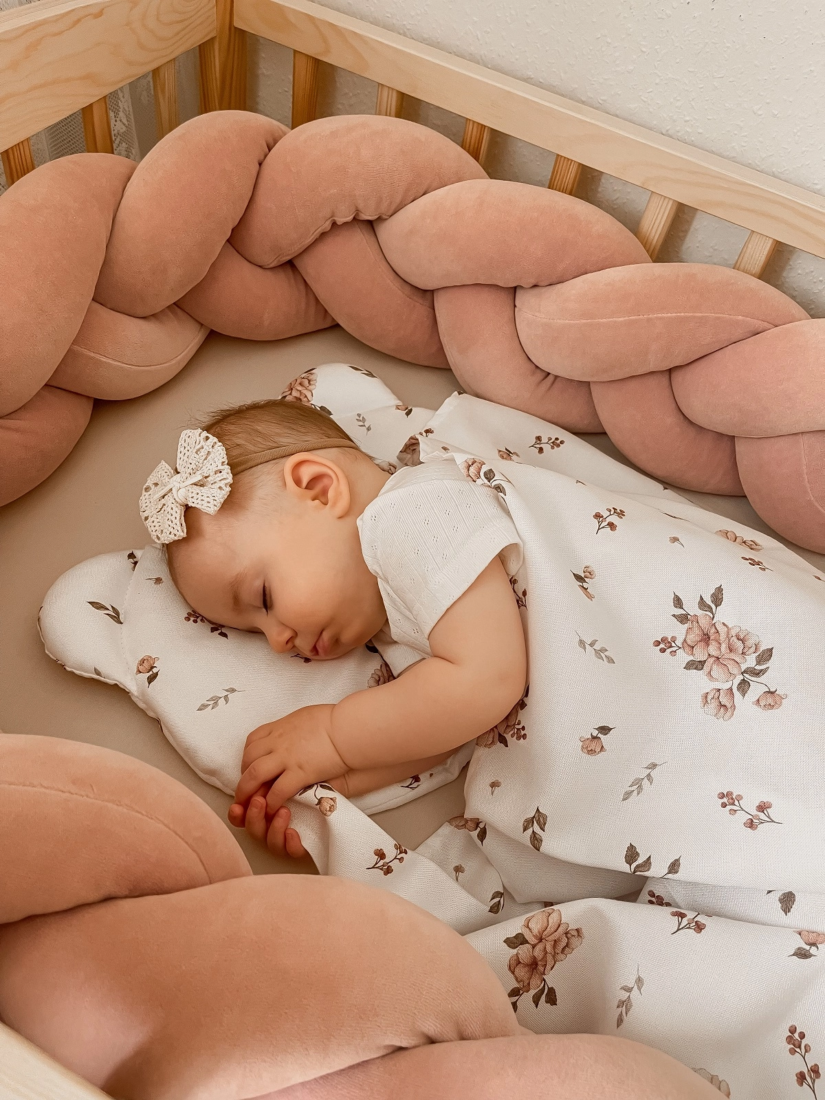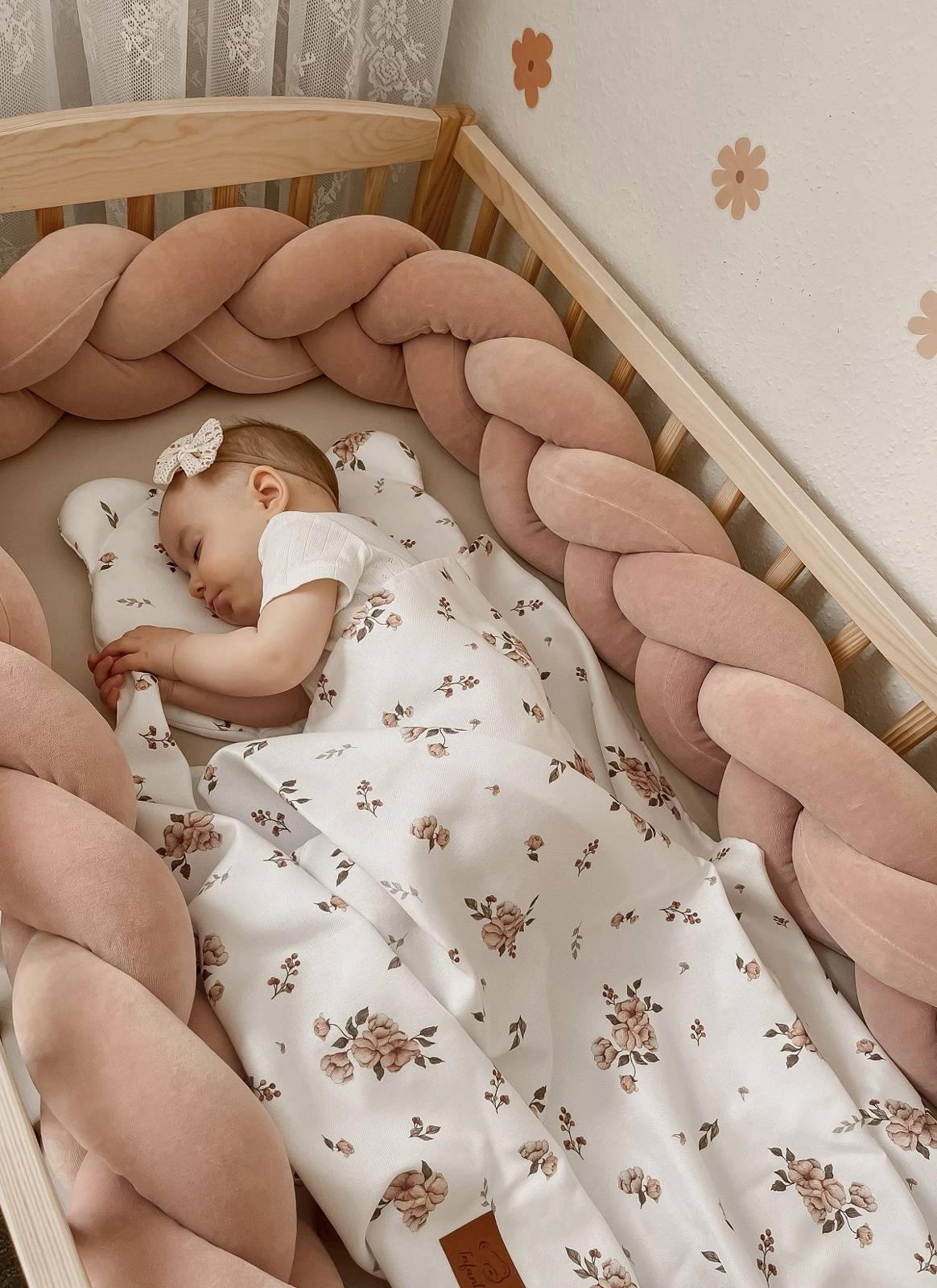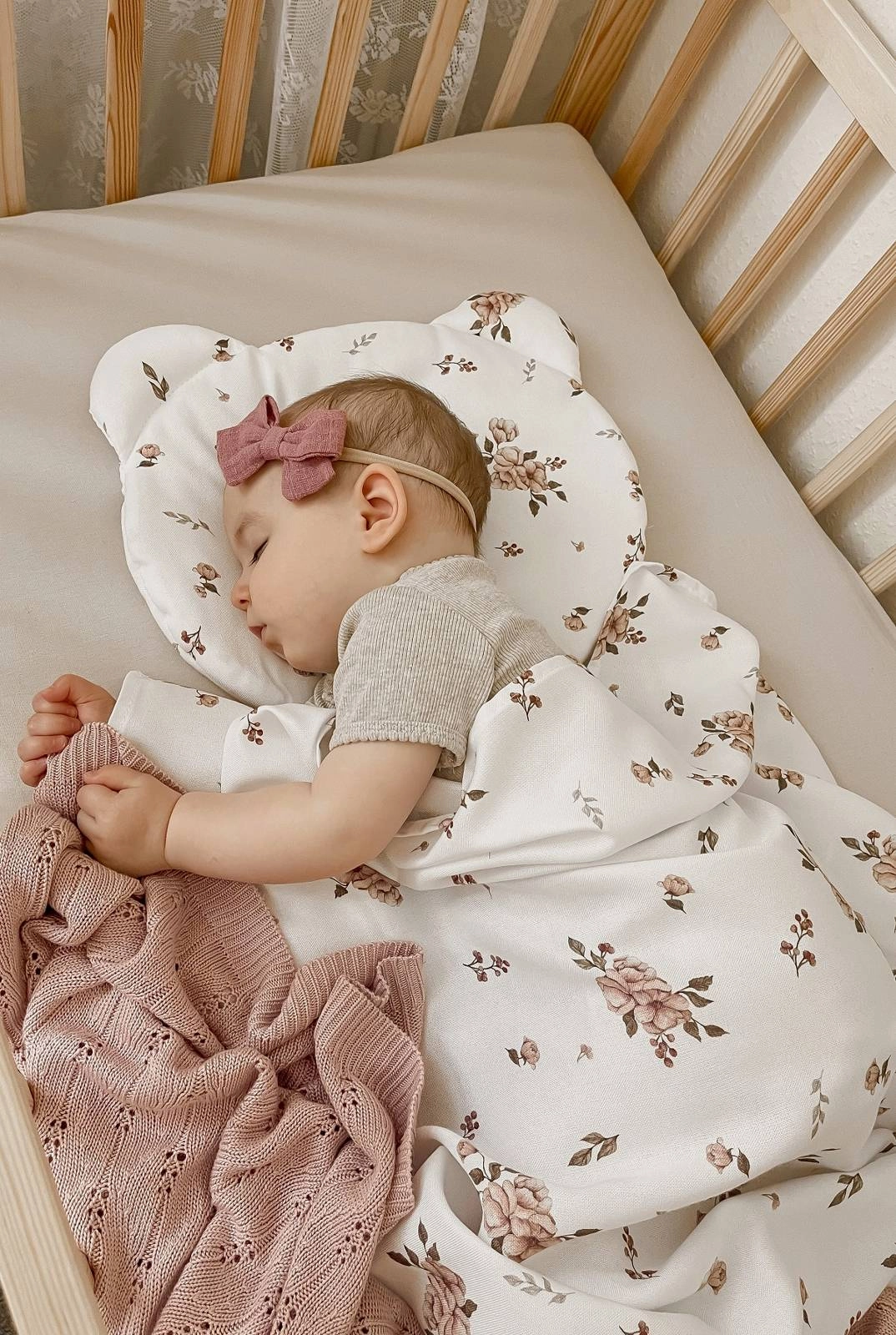 Poduszka wypełniona jest delikatną antyalergiczną włókniną silikonową. Włóknina wszyta jest w szew co powoduje, że nie przesuwa się podczas użytkowania bądź prania. Poduszeczka w zestawie jest płaska - ok. 2cm wysokości, stworzona specjalnie dla niemowląt.