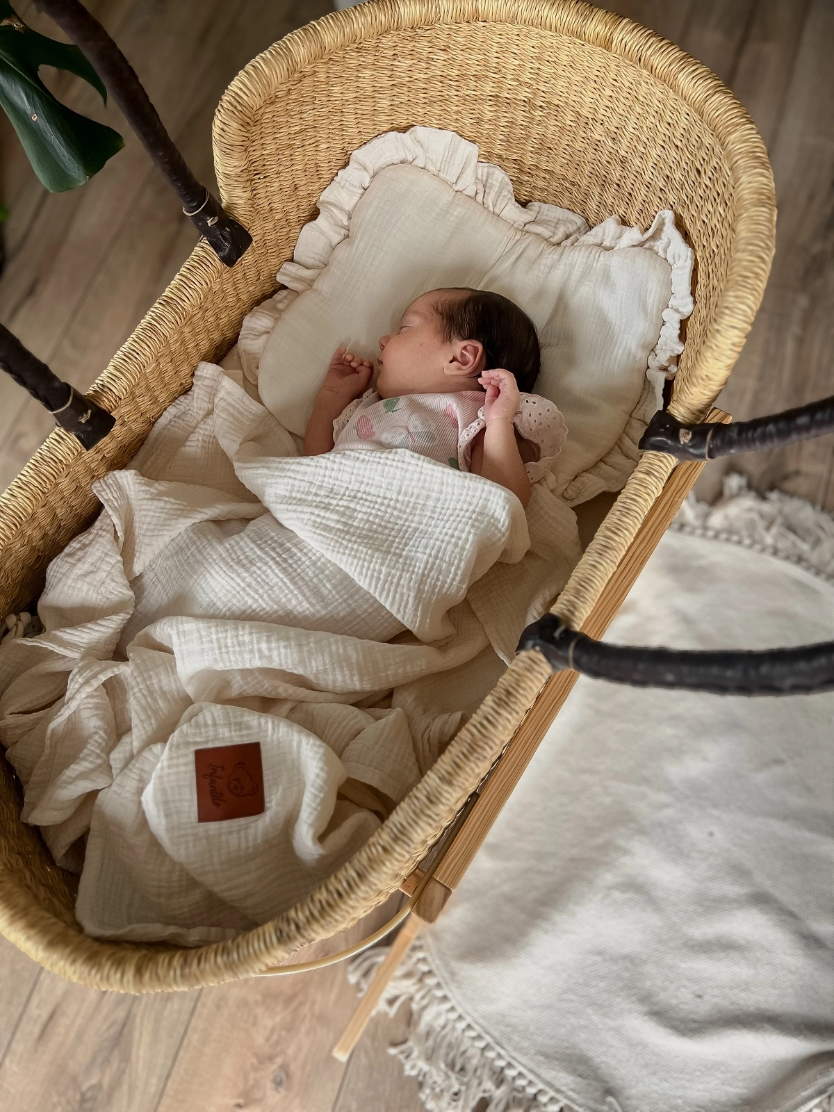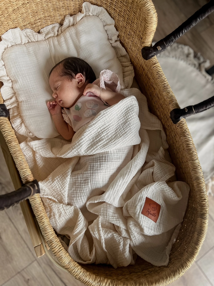 - Uszyty z najwyższej jakości muślinu bawełnianego double gaze. Tkaniny miękkiej i delikatnej, dedykowanej dla skóry niemowląt i dzieci.