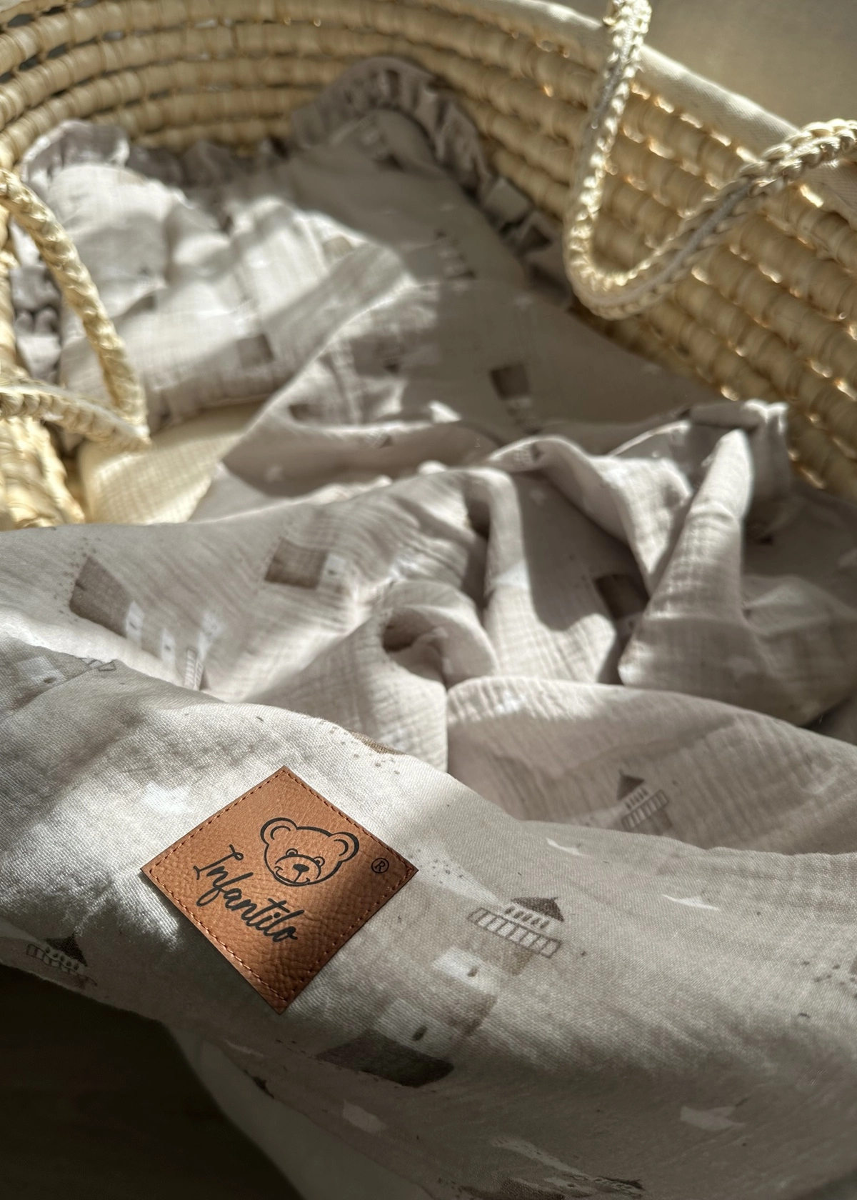 - Uszyty z najwyższej jakości muślinu bawełnianego double gaze. Tkaniny miękkiej i delikatnej, dedykowanej dla skóry niemowląt i dzieci.