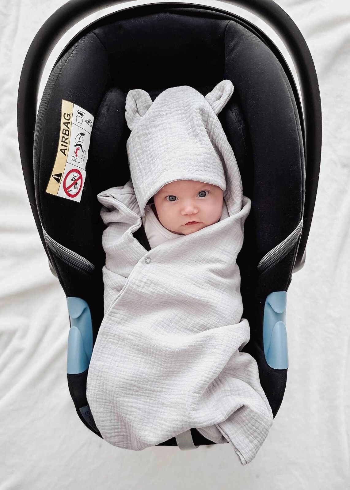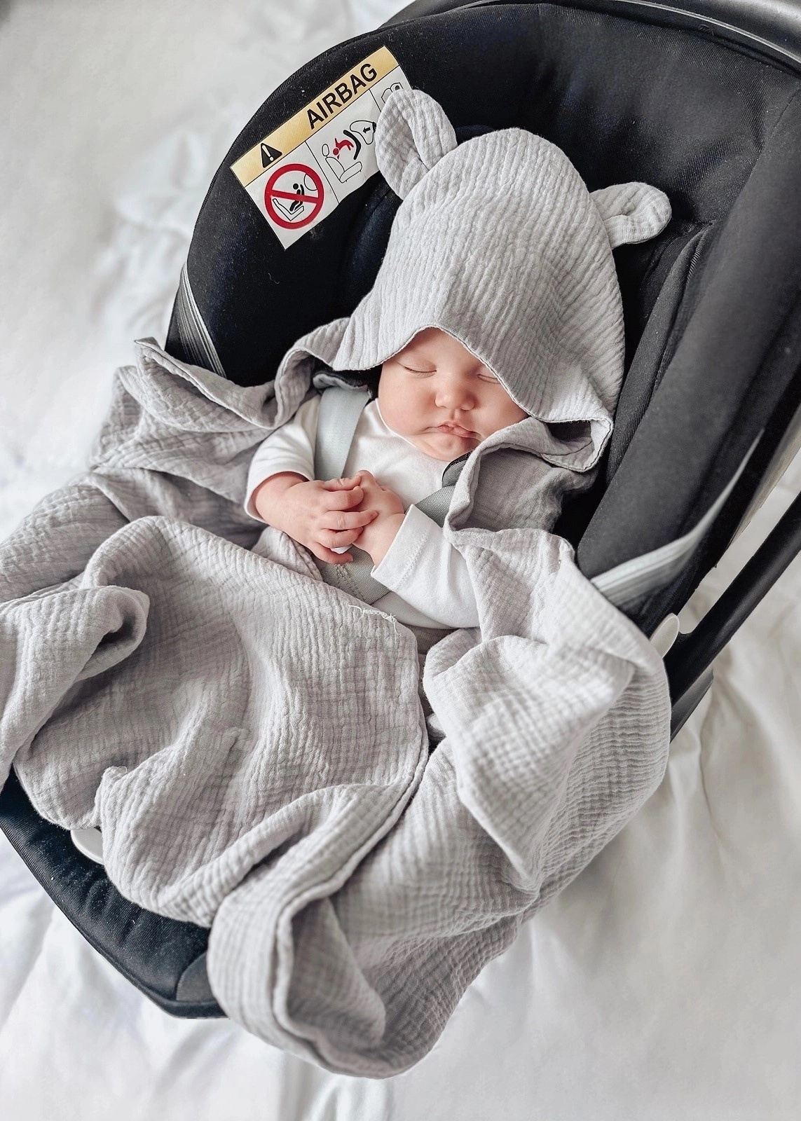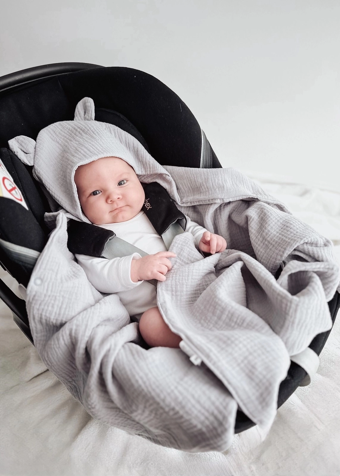 Niezwykle miękki i delikatny otulacz do fotelika, uszyty z najwyższej jakości muślinu bawełnianego double gaze.