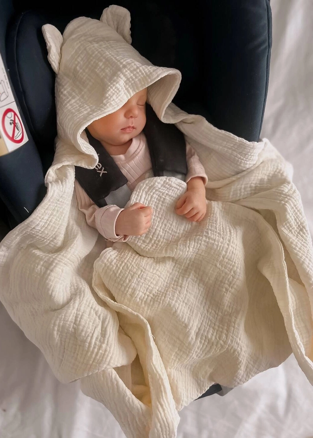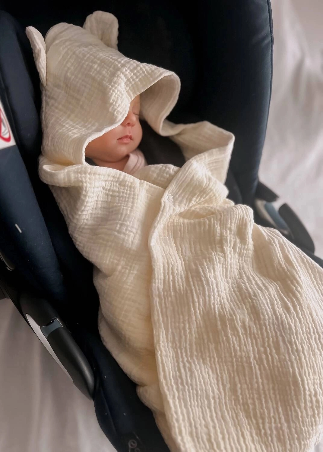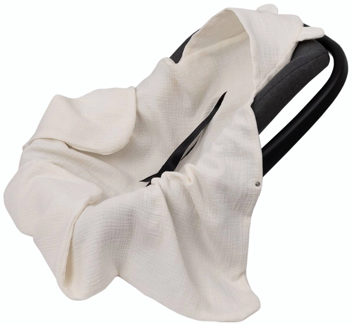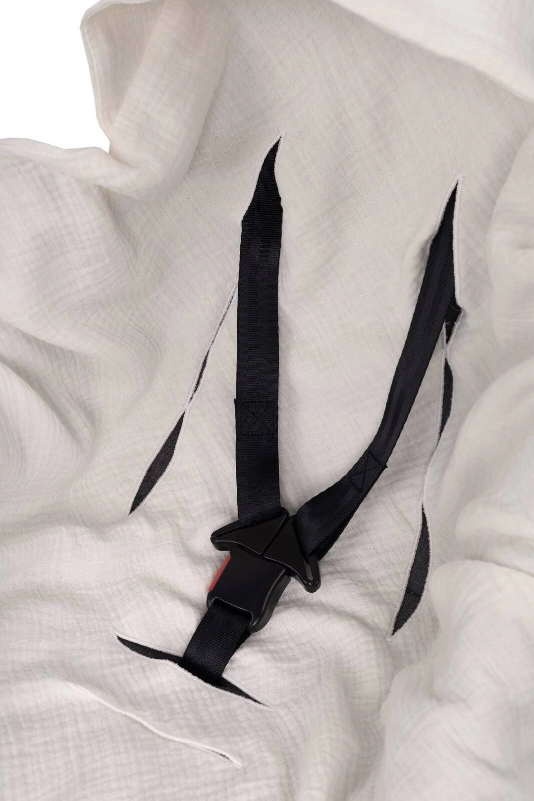 Niezwykle miękki i delikatny otulacz do fotelika, uszyty z najwyższej jakości muślinu bawełnianego double gaze.