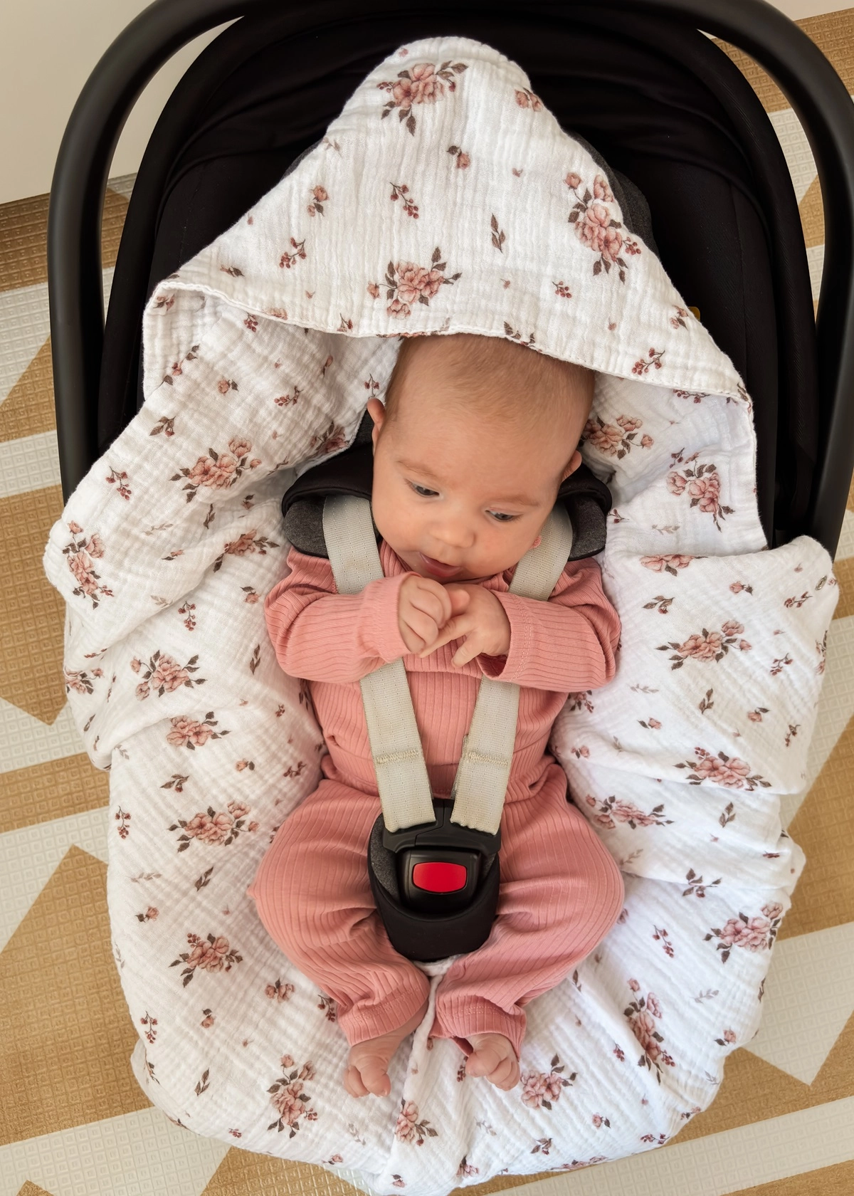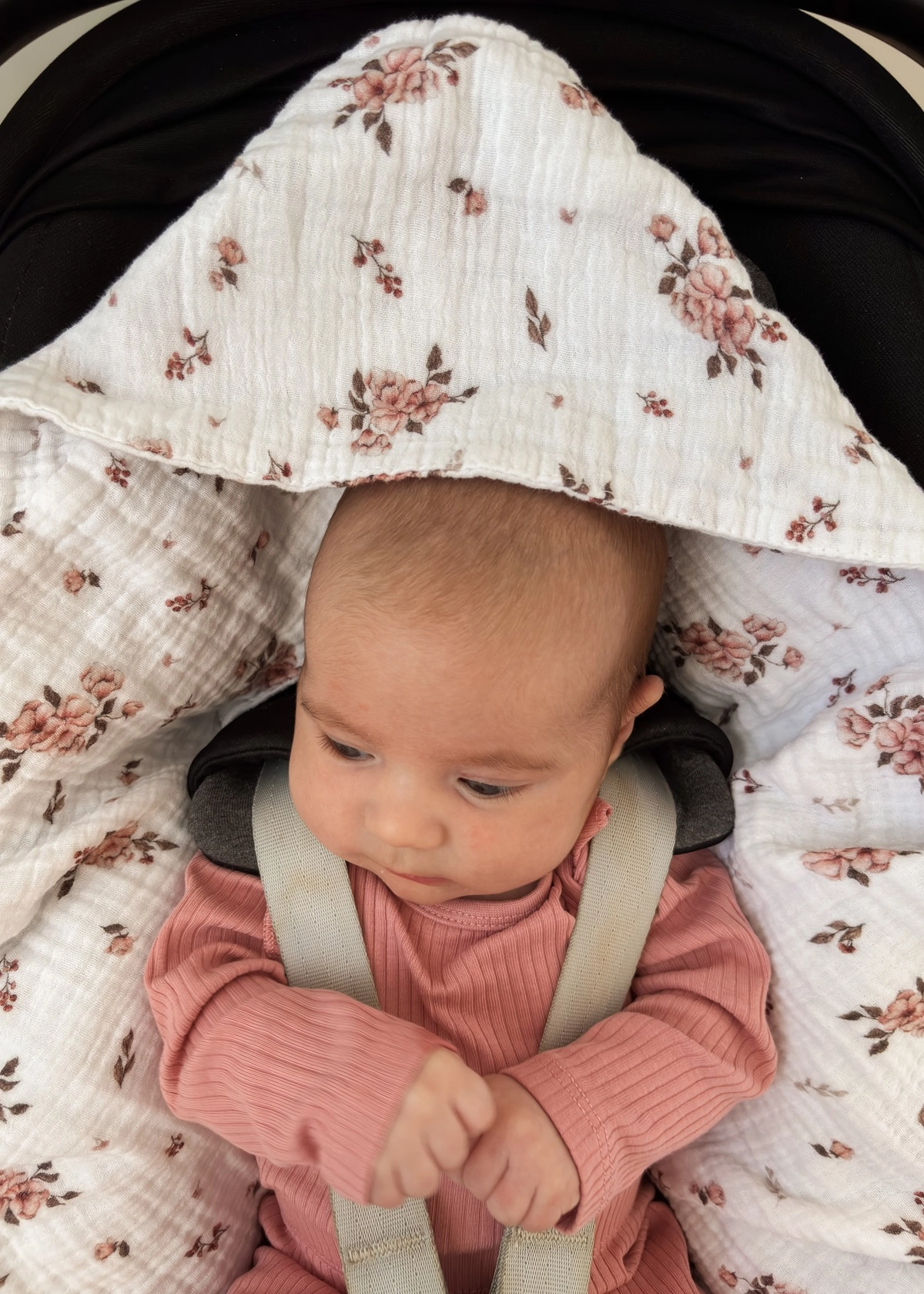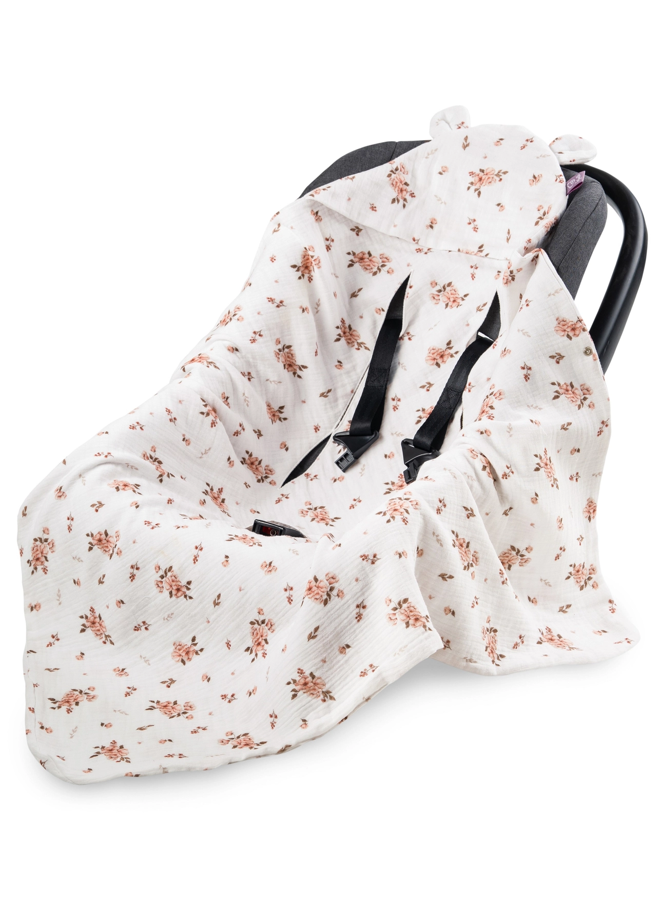 Muślinowy otulacz z kapturkiem do fotelika LITTLE FLOWERS
