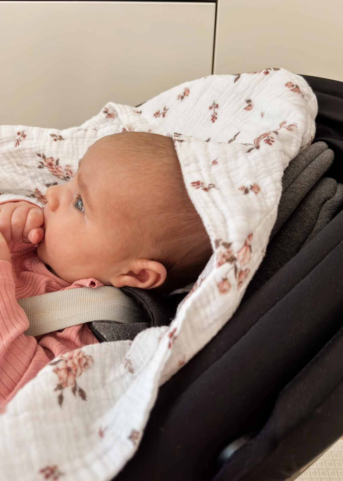 Niezwykle miękki i delikatny otulacz do fotelika, uszyty z najwyższej jakości muślinu bawełnianego double gaze.