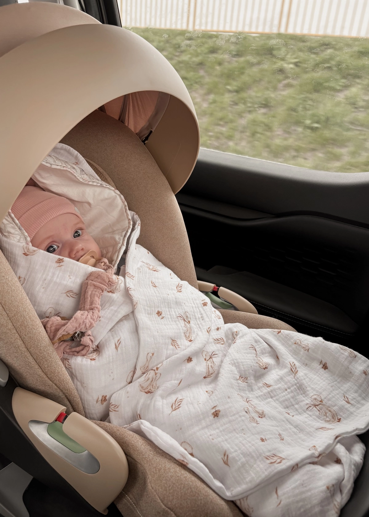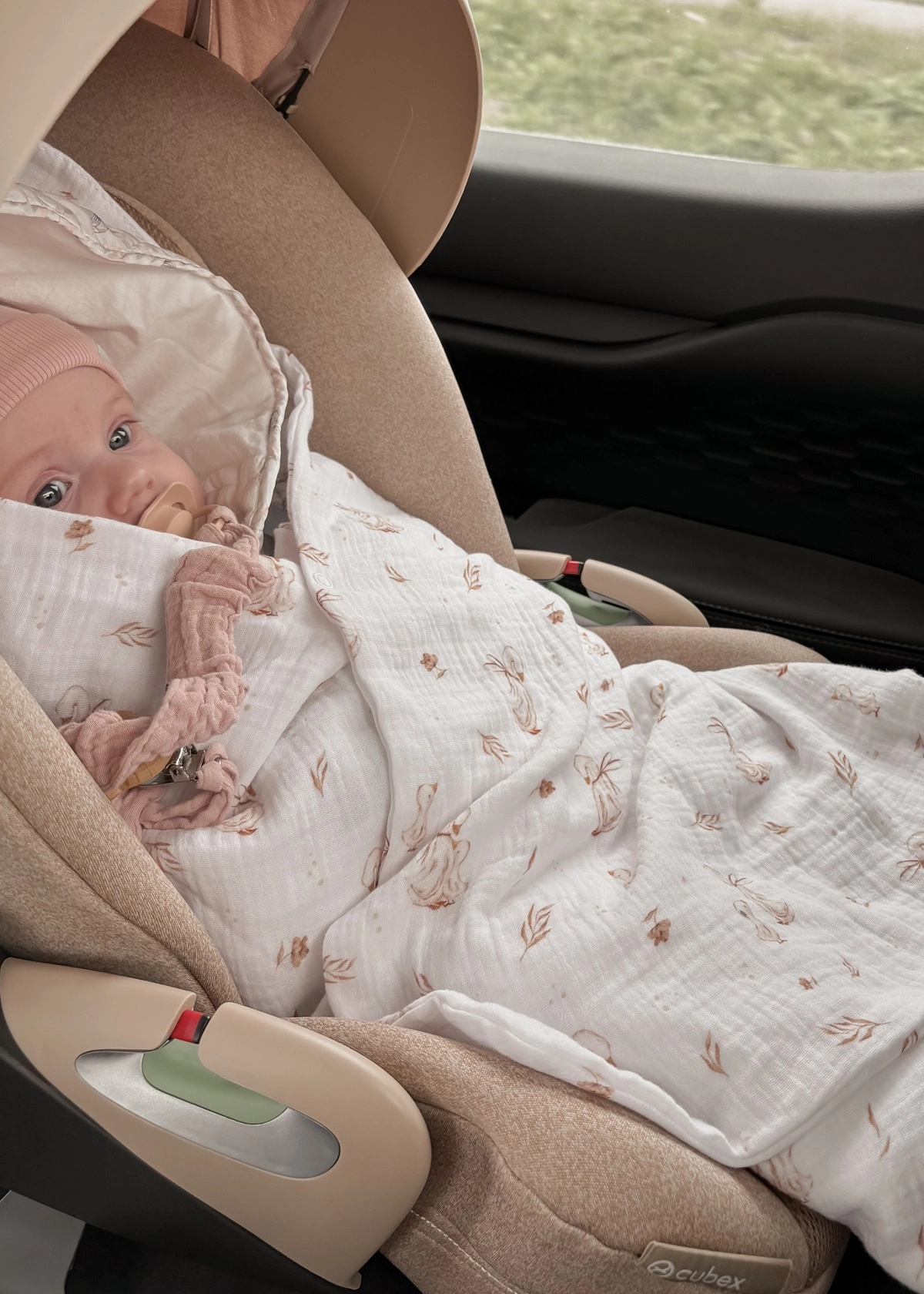 Niezwykle miękki i delikatny otulacz do fotelika, uszyty z najwyższej jakości muślinu bawełnianego double gaze.
