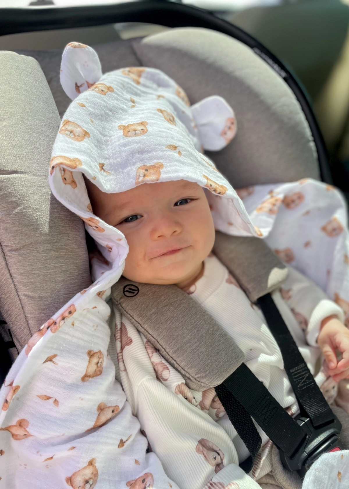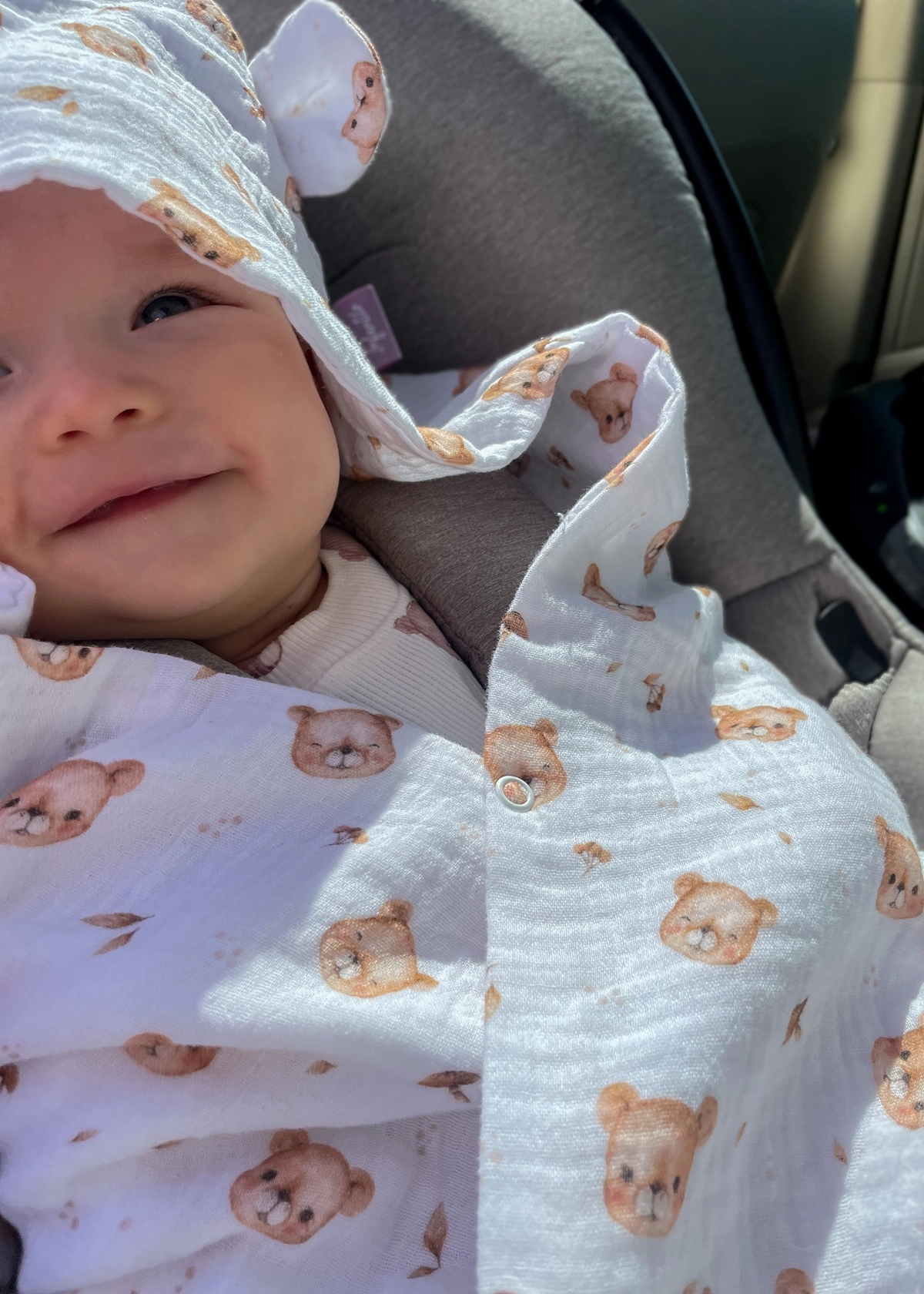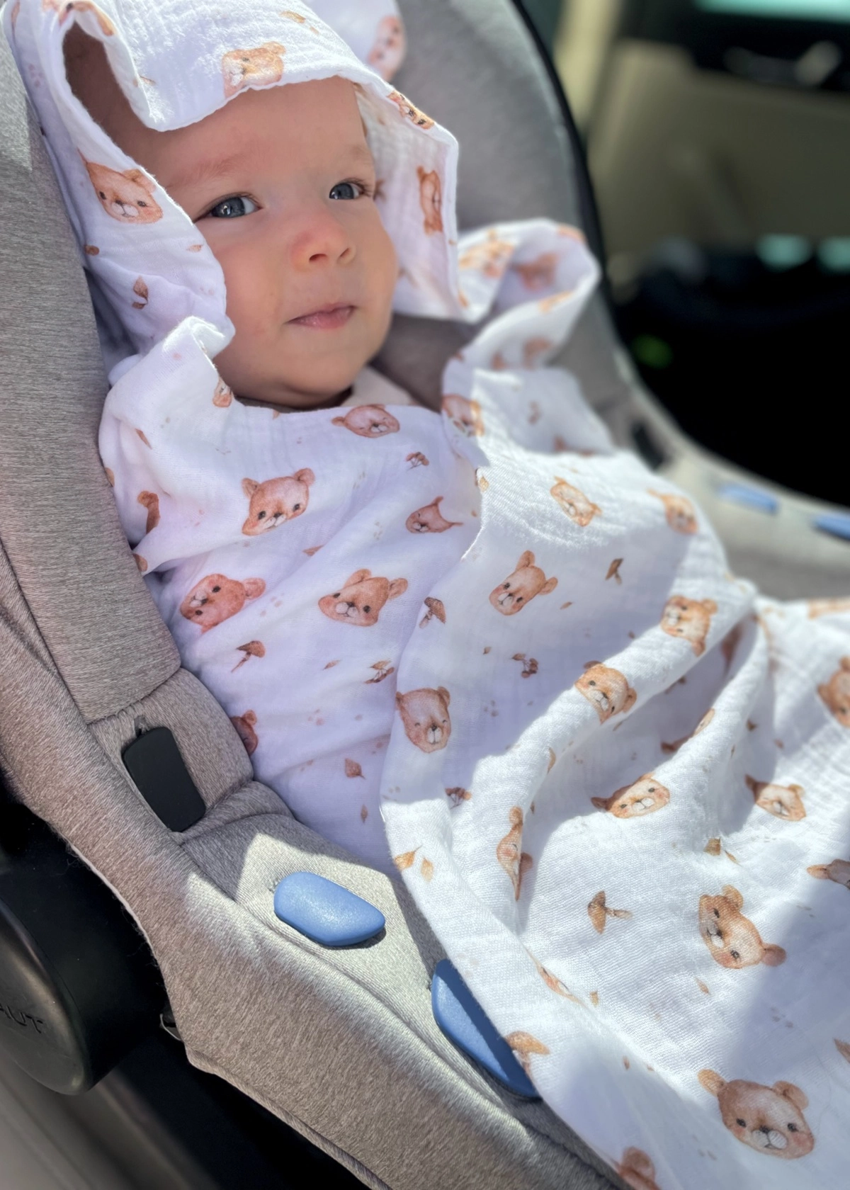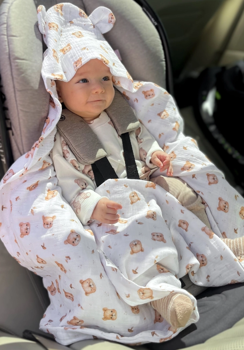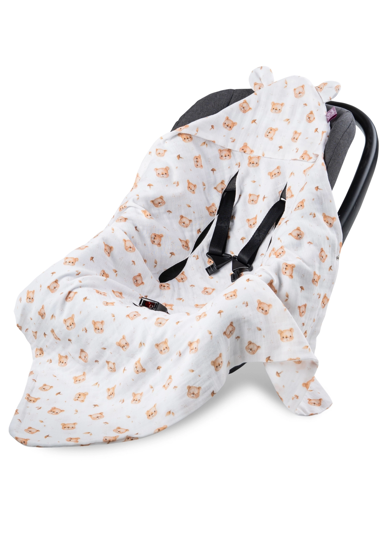 Muślinowy otulacz z kapturkiem do fotelika TEDDY BEAR