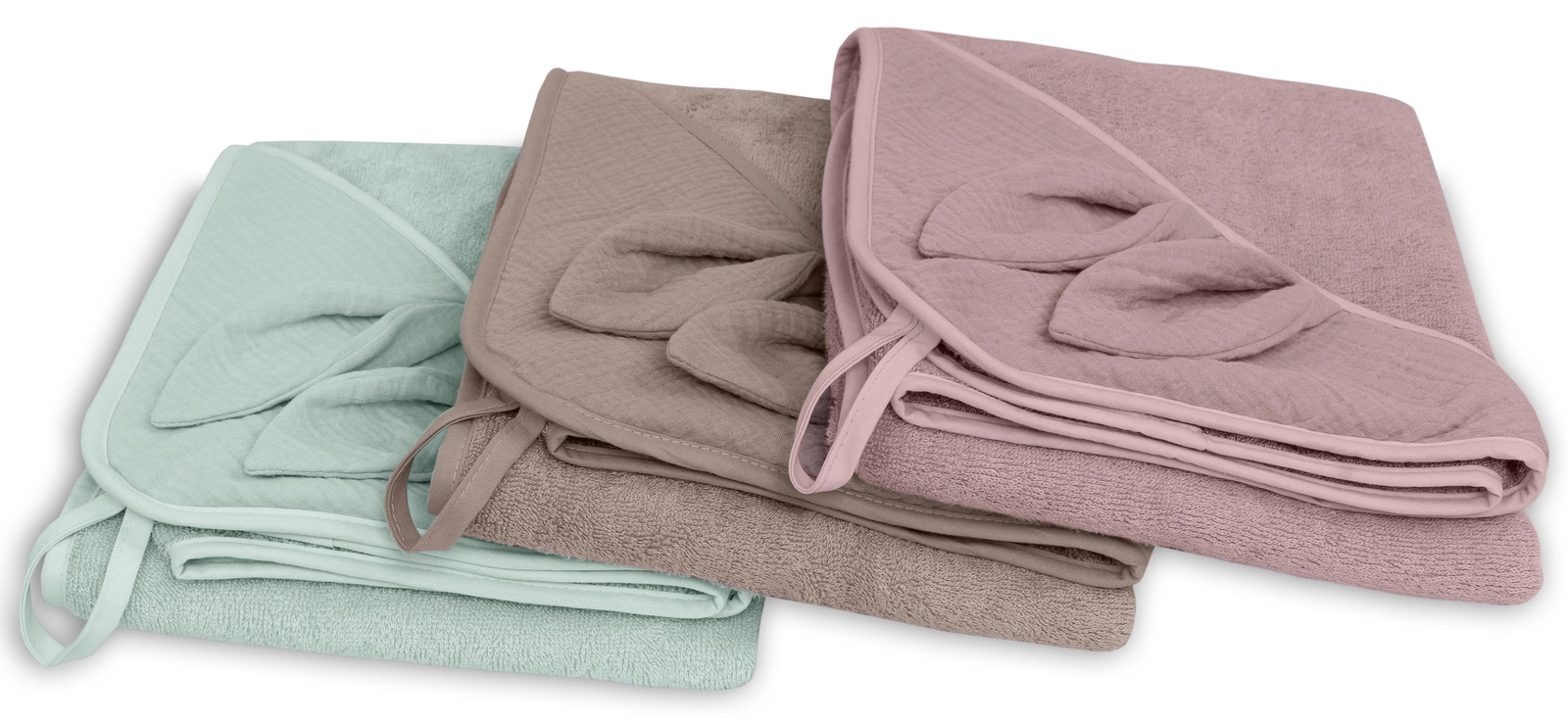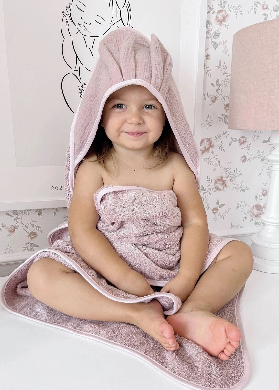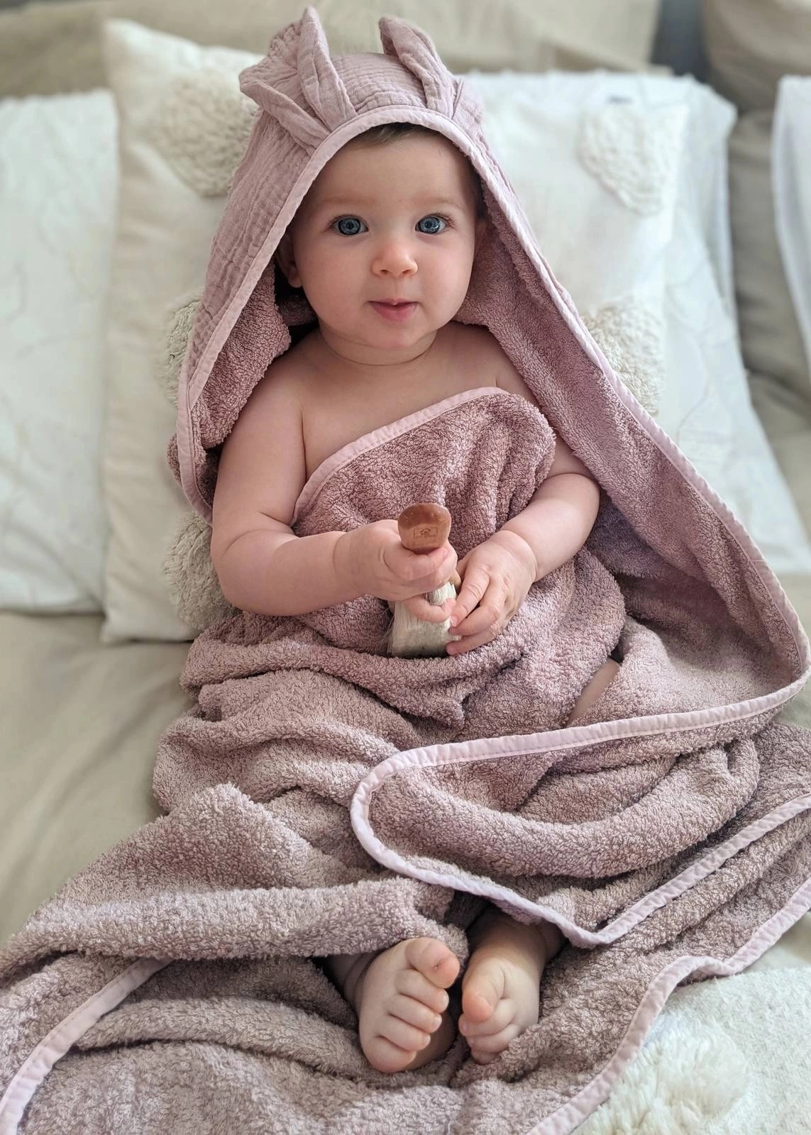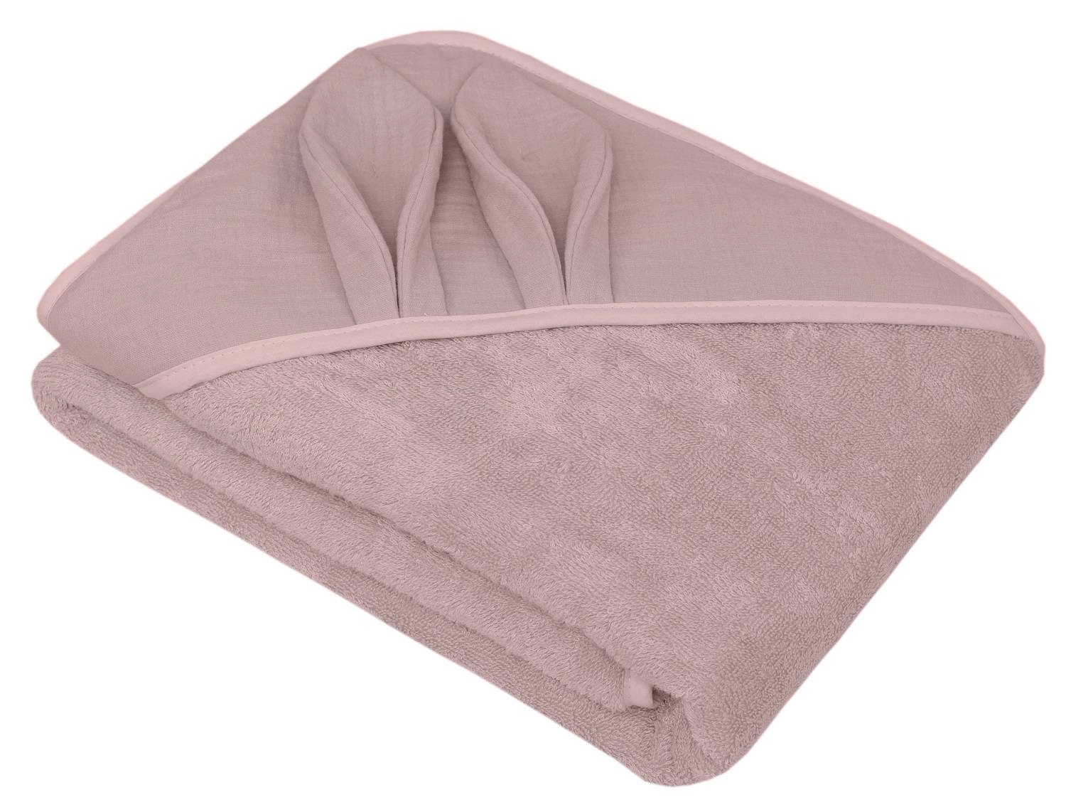 Okrycie kąpielowe uszyte z grubej i mięsistej tkaniny bambusowej i bawełny. Posiada muślinowy kapturek wykończony dekoracyjnymi uszkami.