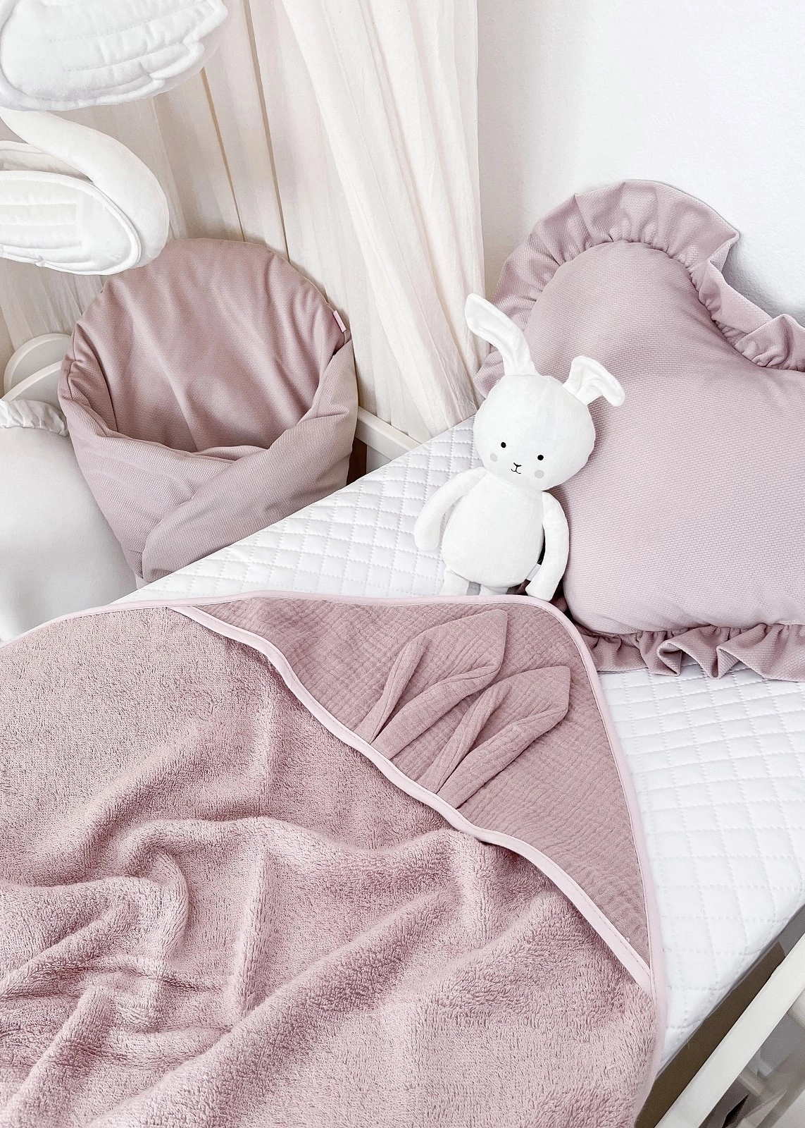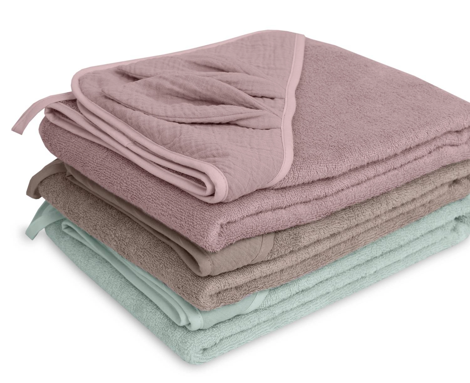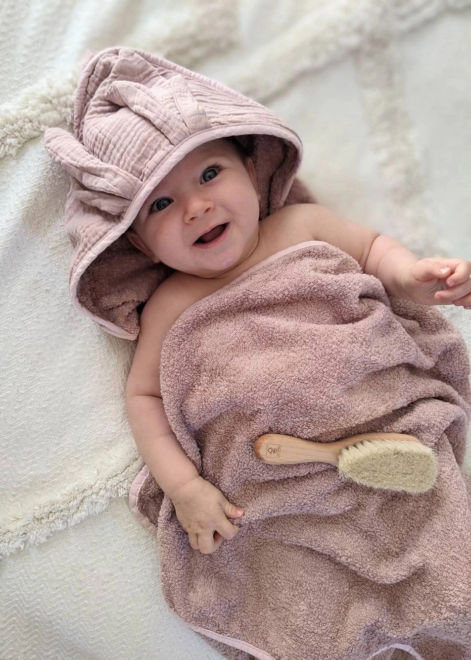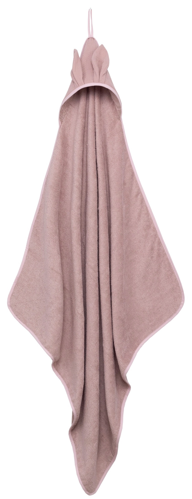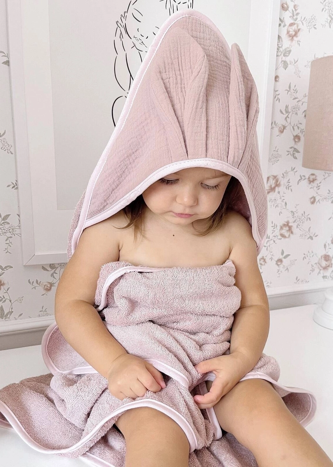 Okrycie kąpielowe uszyte z grubej i mięsistej tkaniny bambusowej i bawełny. Posiada muślinowy kapturek wykończony dekoracyjnymi uszkami.