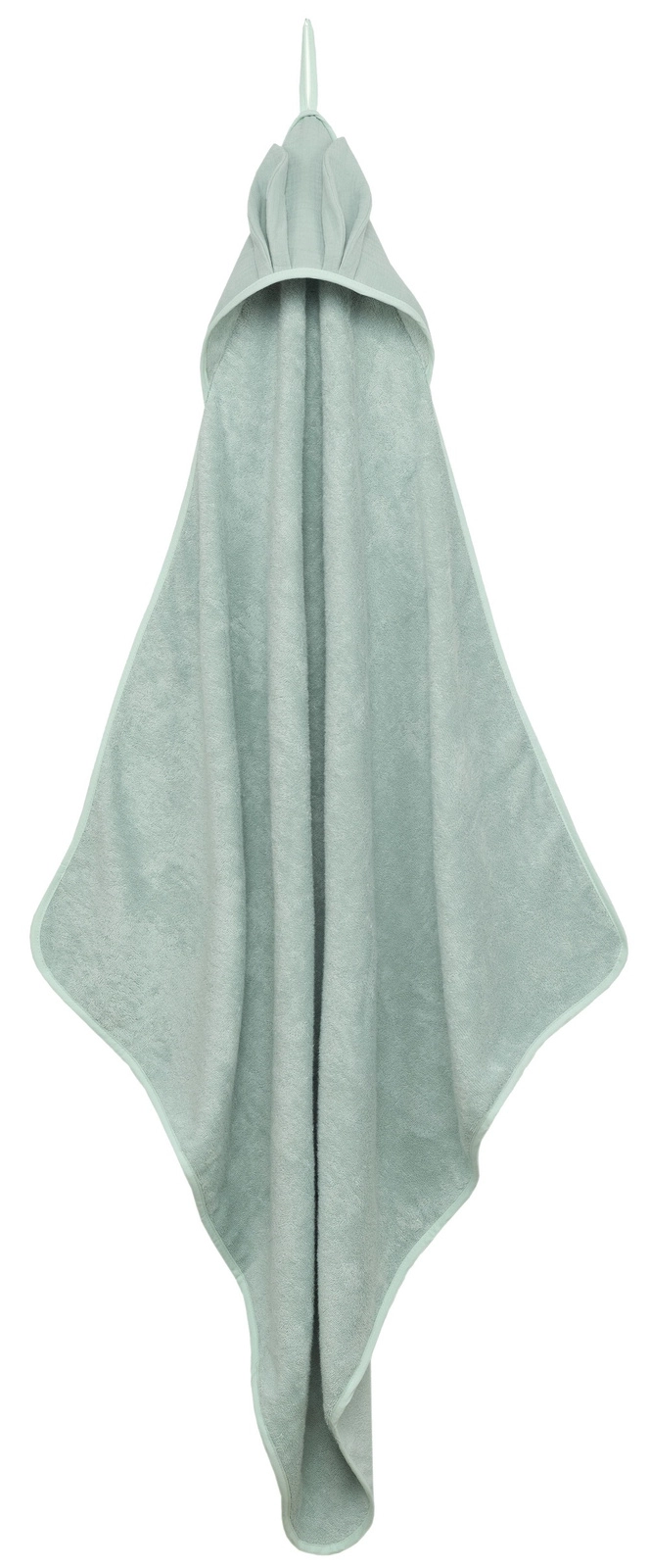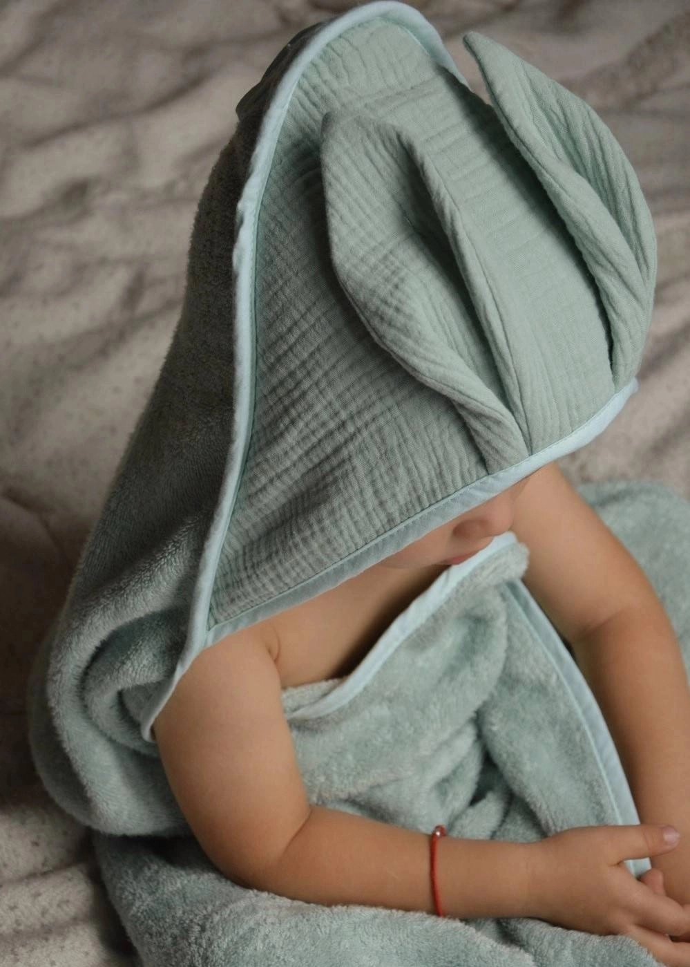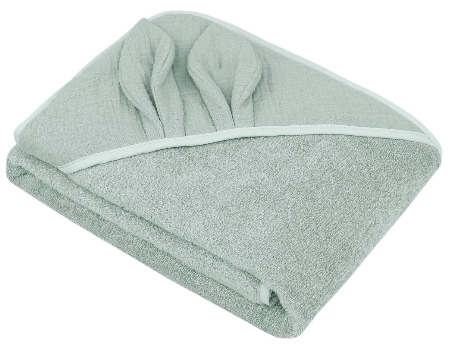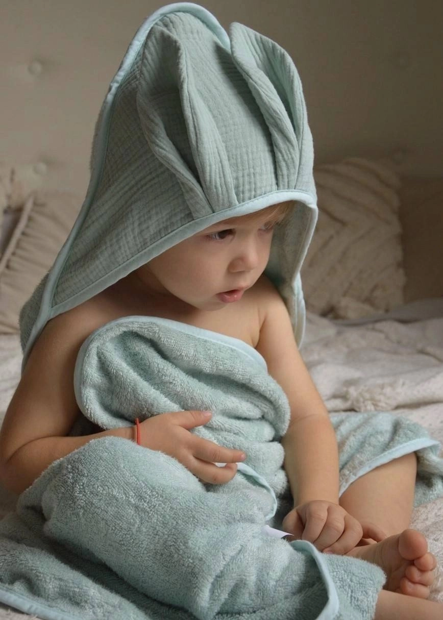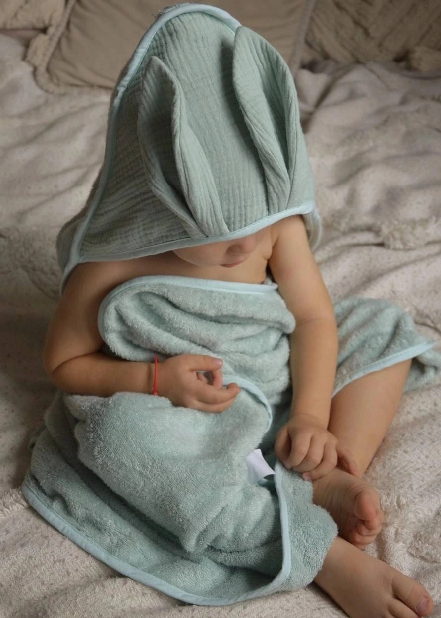 Okrycie kąpielowe uszyte z grubej i mięsistej tkaniny bambusowej i bawełny. Posiada muślinowy kapturek wykończony dekoracyjnymi uszkami.