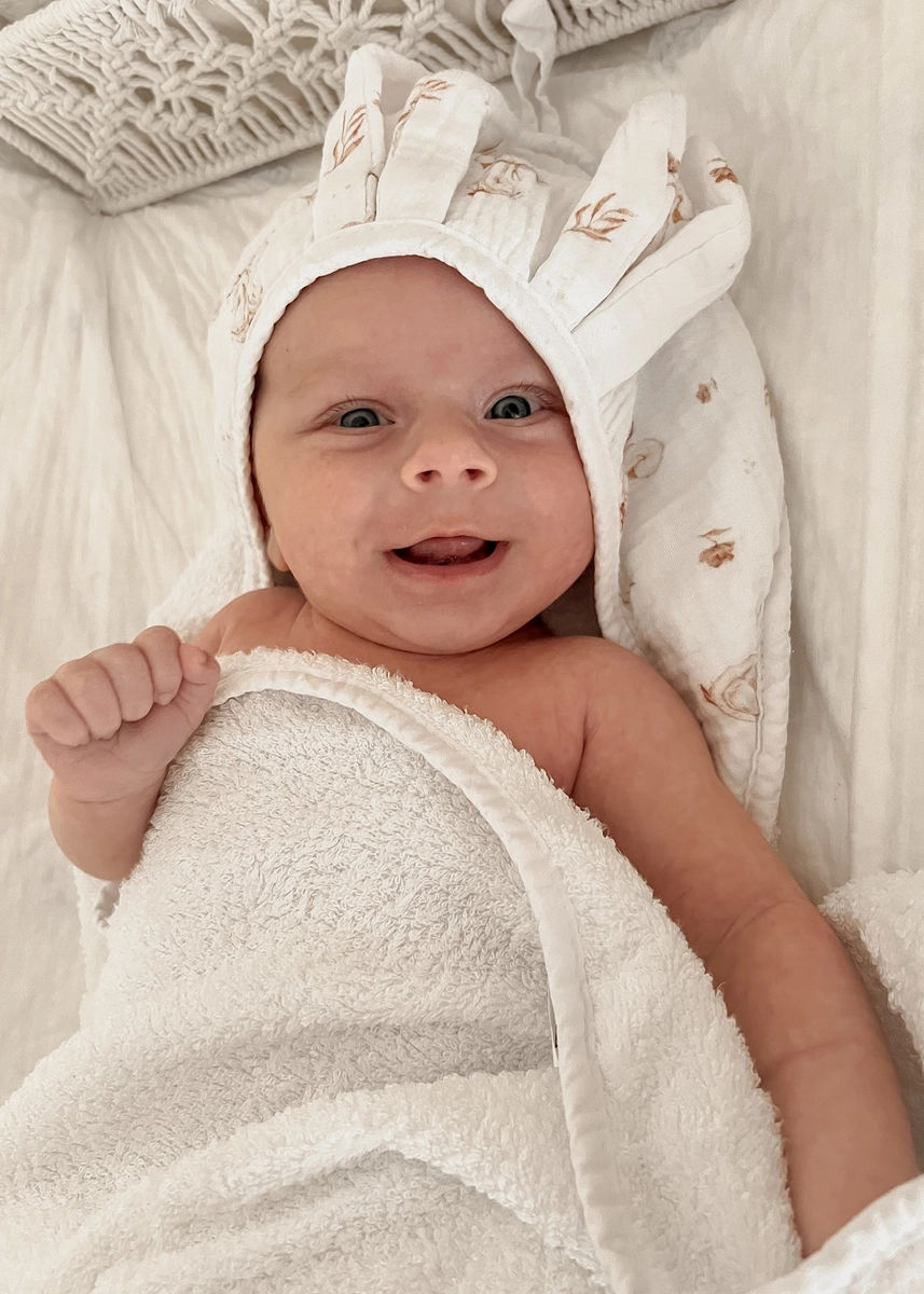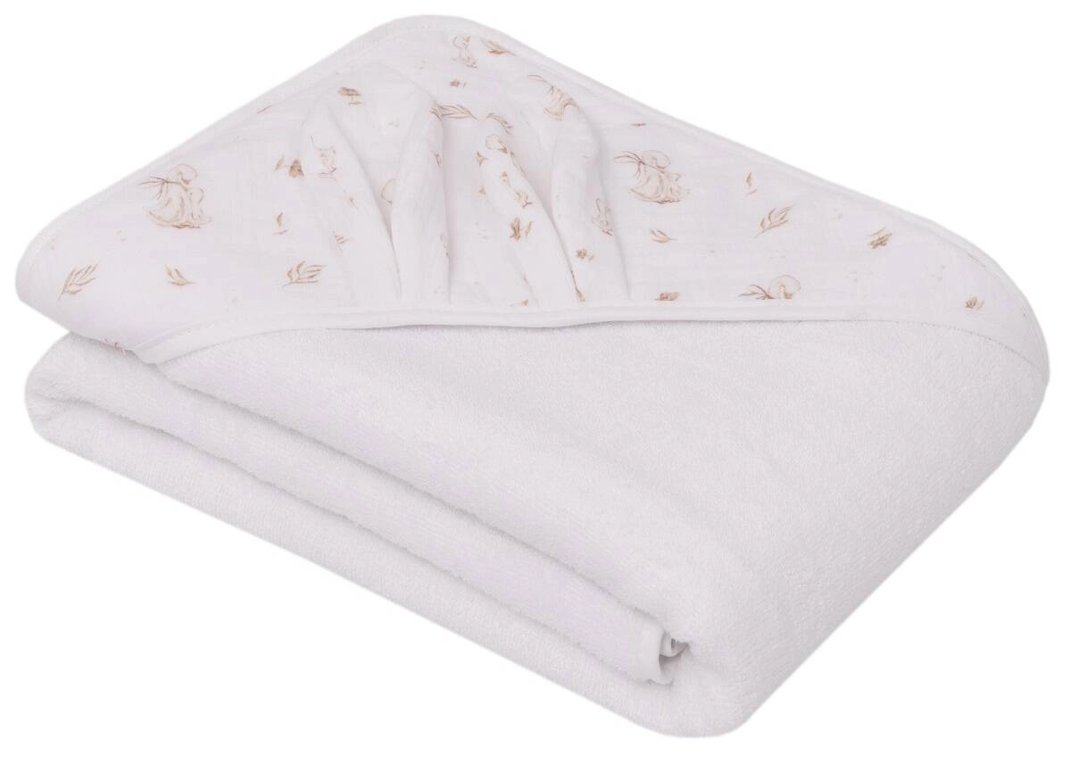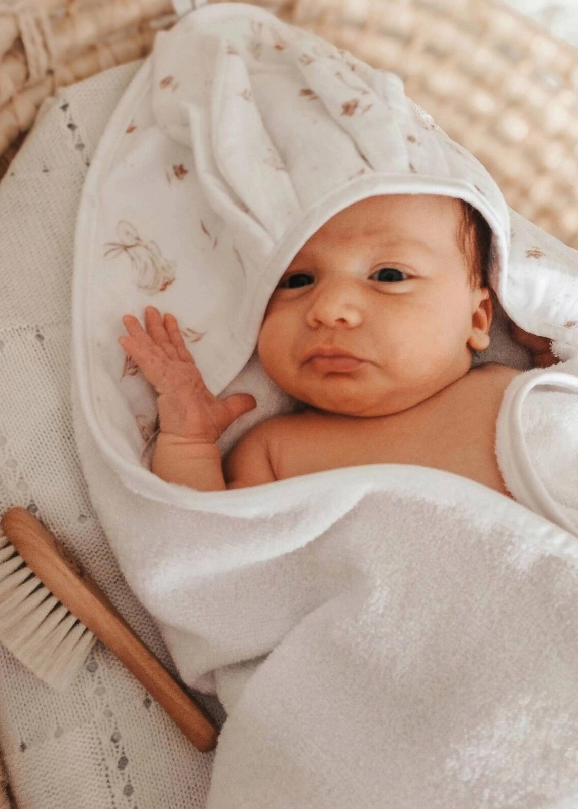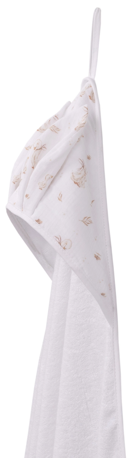 Okrycie kąpielowe uszyte z grubej i mięsistej tkaniny bambusowej i bawełny. Posiada muślinowy kapturek wykończony dekoracyjnymi uszkami.