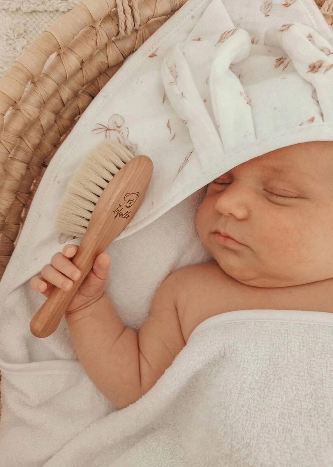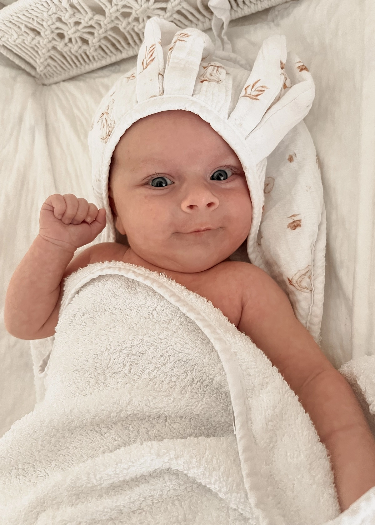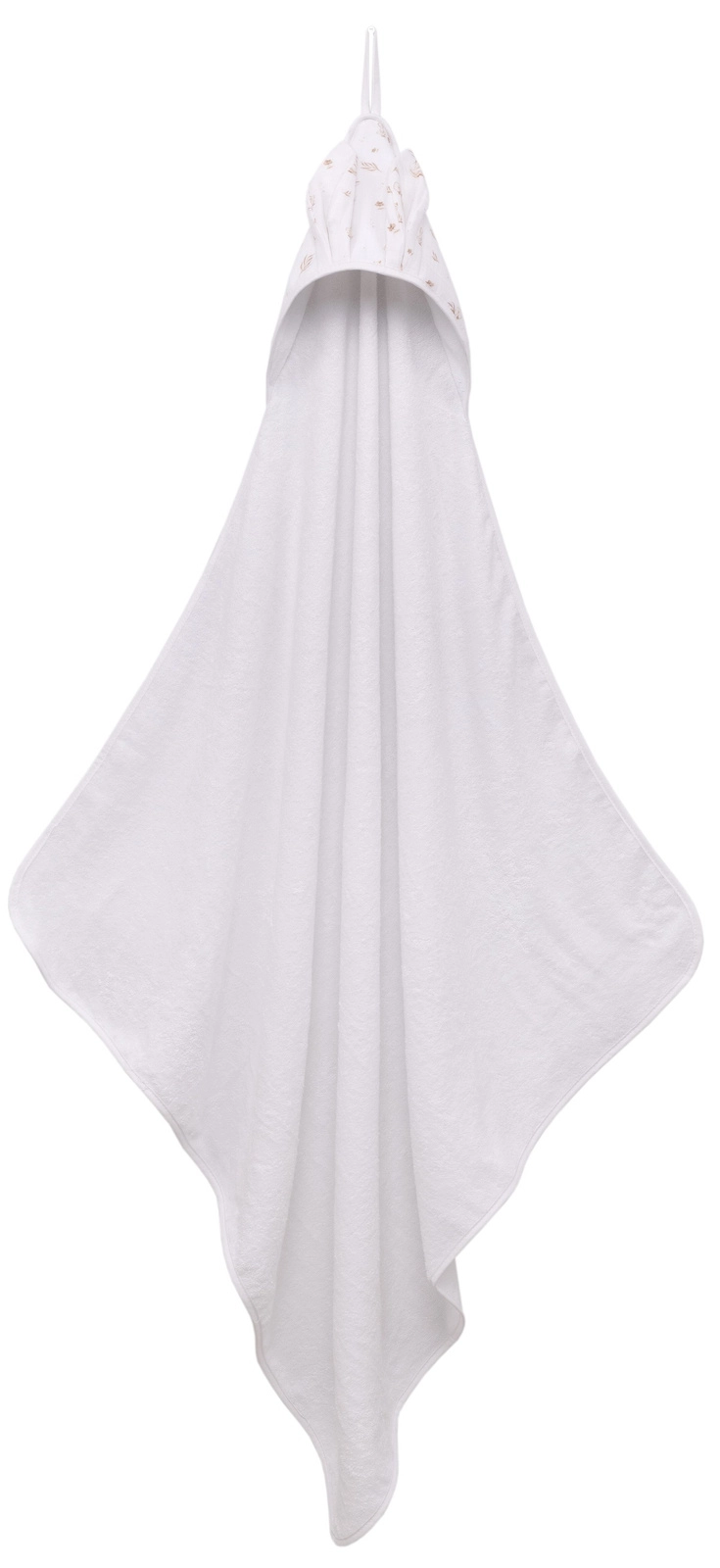 Kapturek okrywający głowę doskonale wchłania wodę, dokładnie osuszając delikatną skórę dziecka.