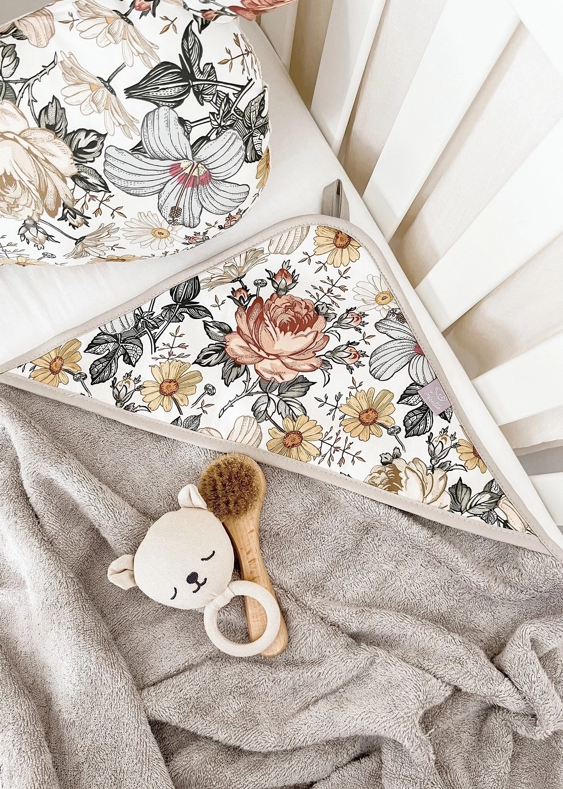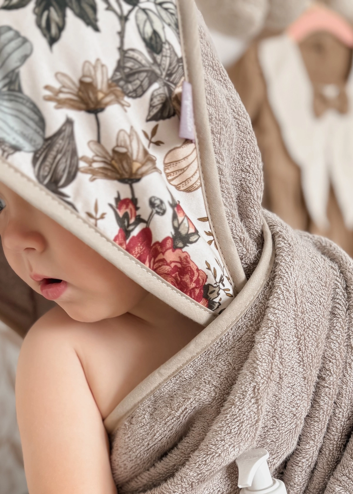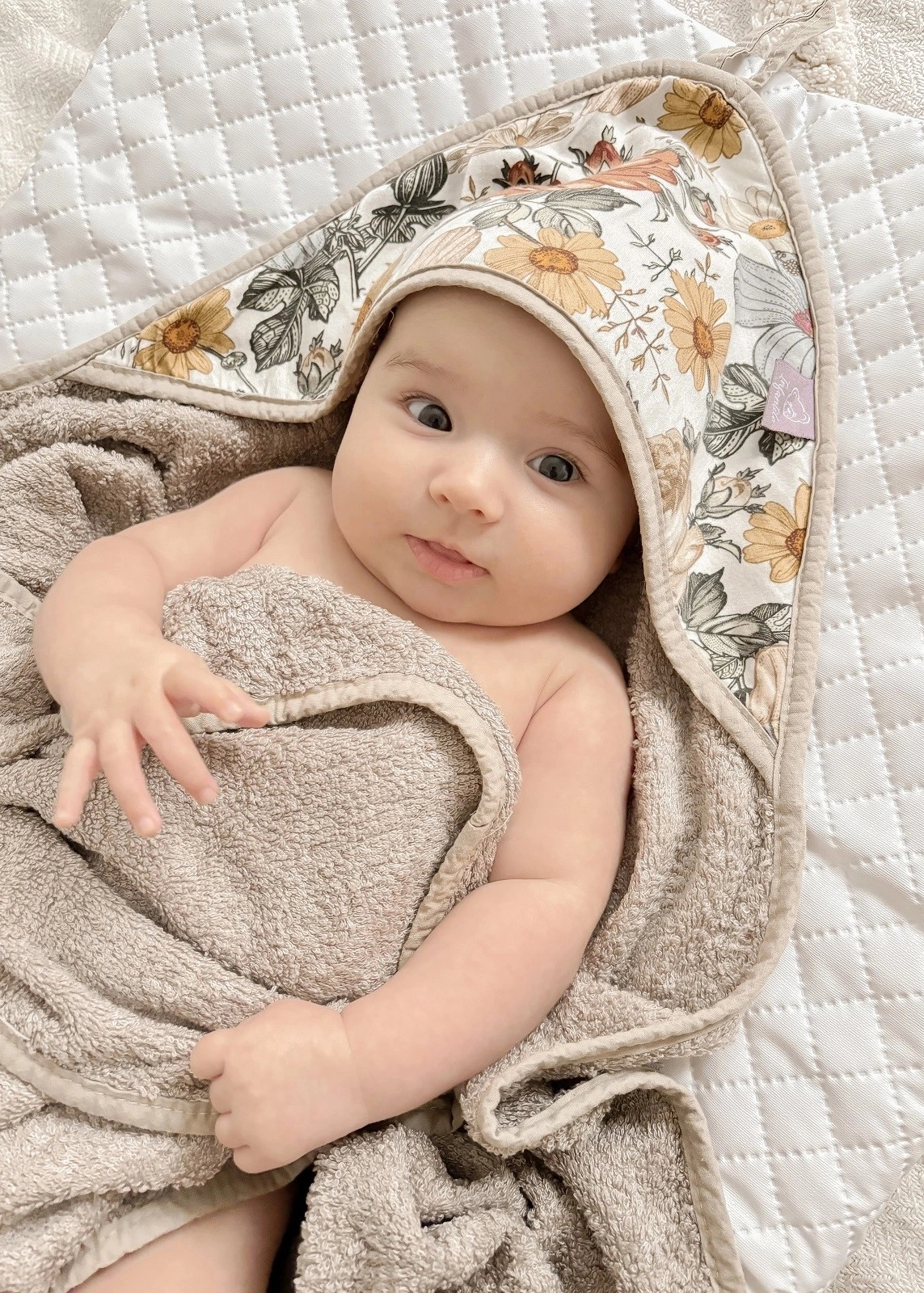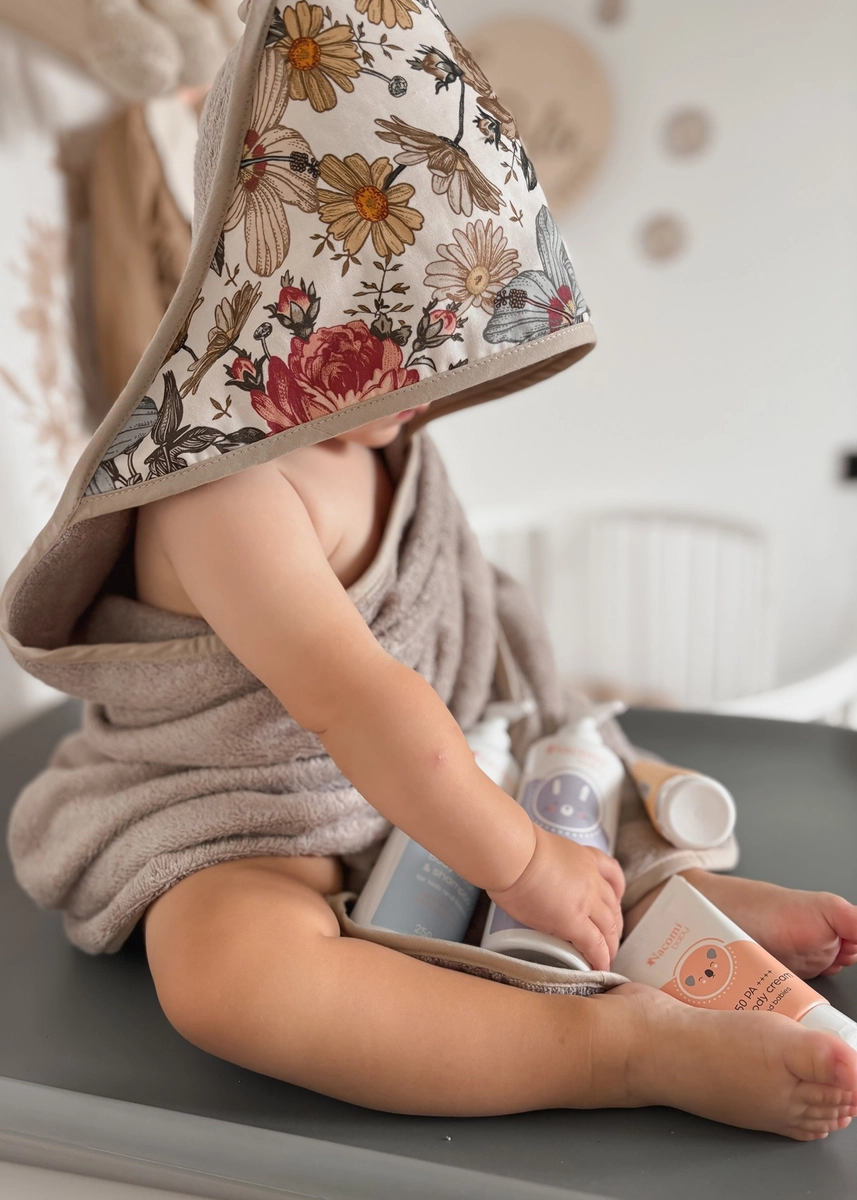 Kapturek okrywający głowę doskonale wchłania wodę, dokładnie osuszając delikatną skórę dziecka.