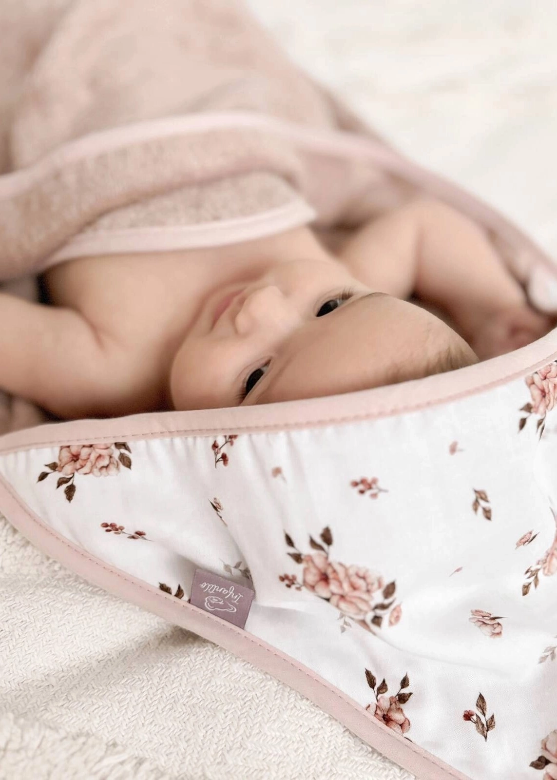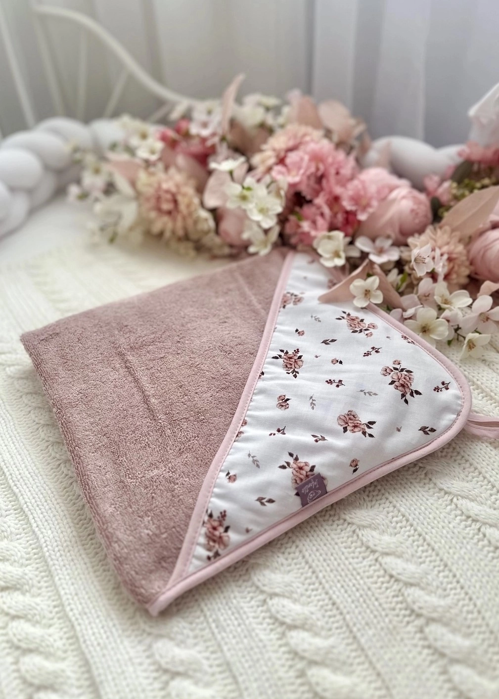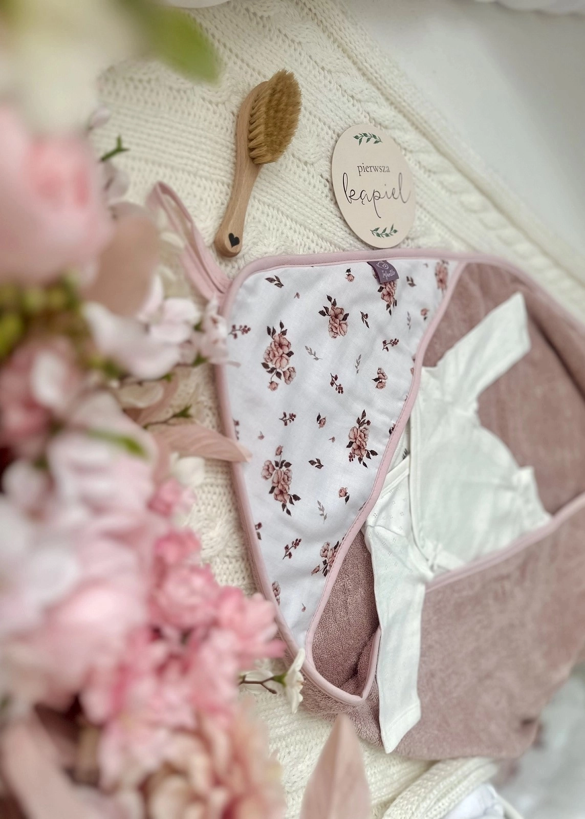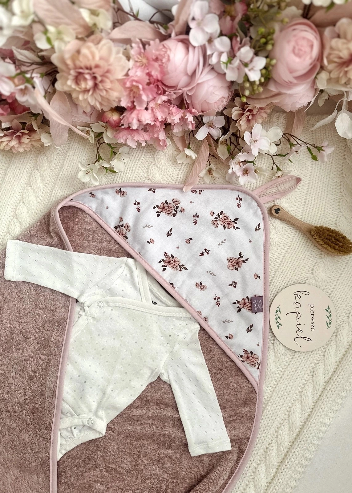 Kapturek okrywający głowę doskonale wchłania wodę, dokładnie osuszając delikatną skórę dziecka.