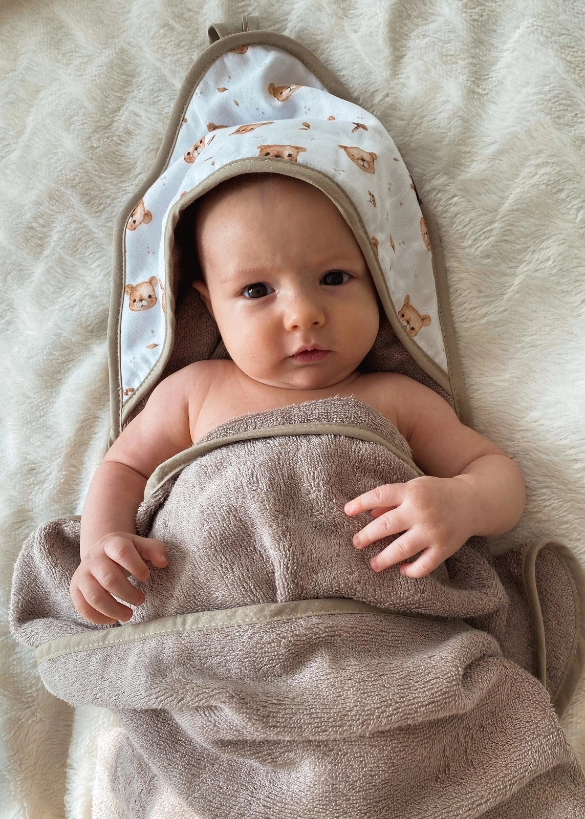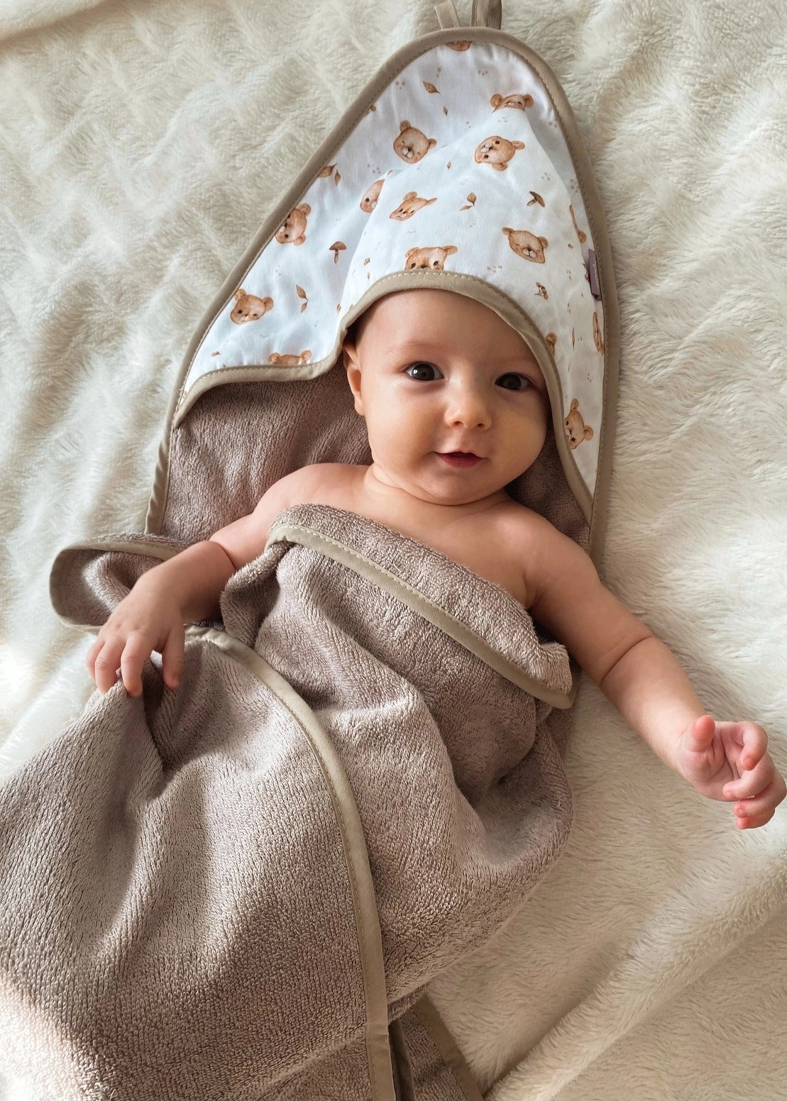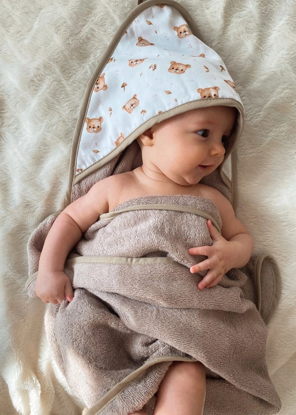 Kapturek okrywający głowę doskonale wchłania wodę, dokładnie osuszając delikatną skórę dziecka.
