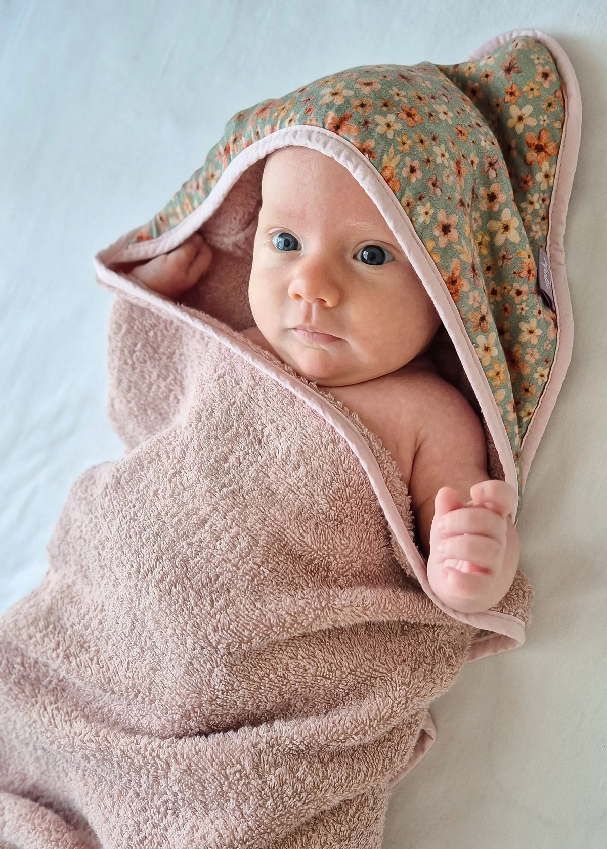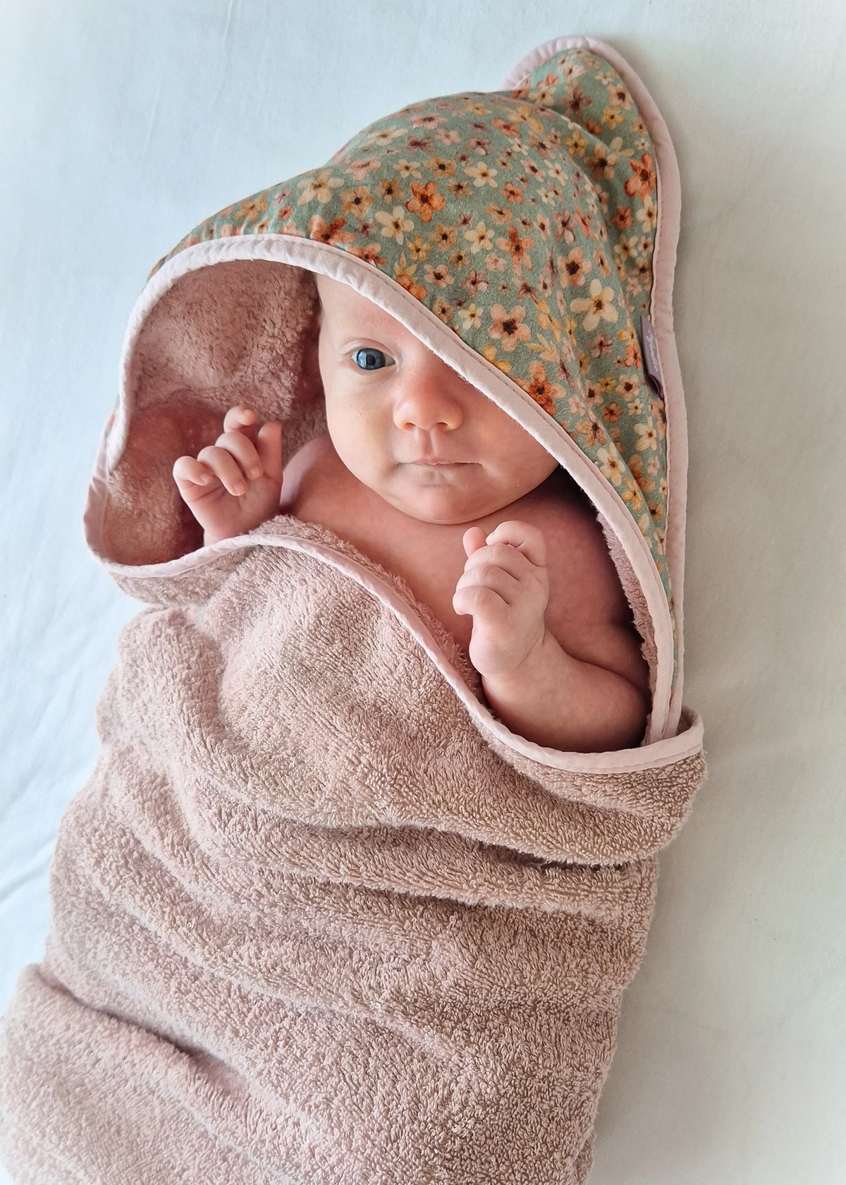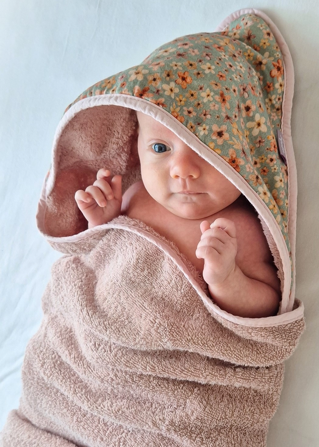 Kapturek okrywający głowę doskonale wchłania wodę, dokładnie osuszając delikatną skórę dziecka.