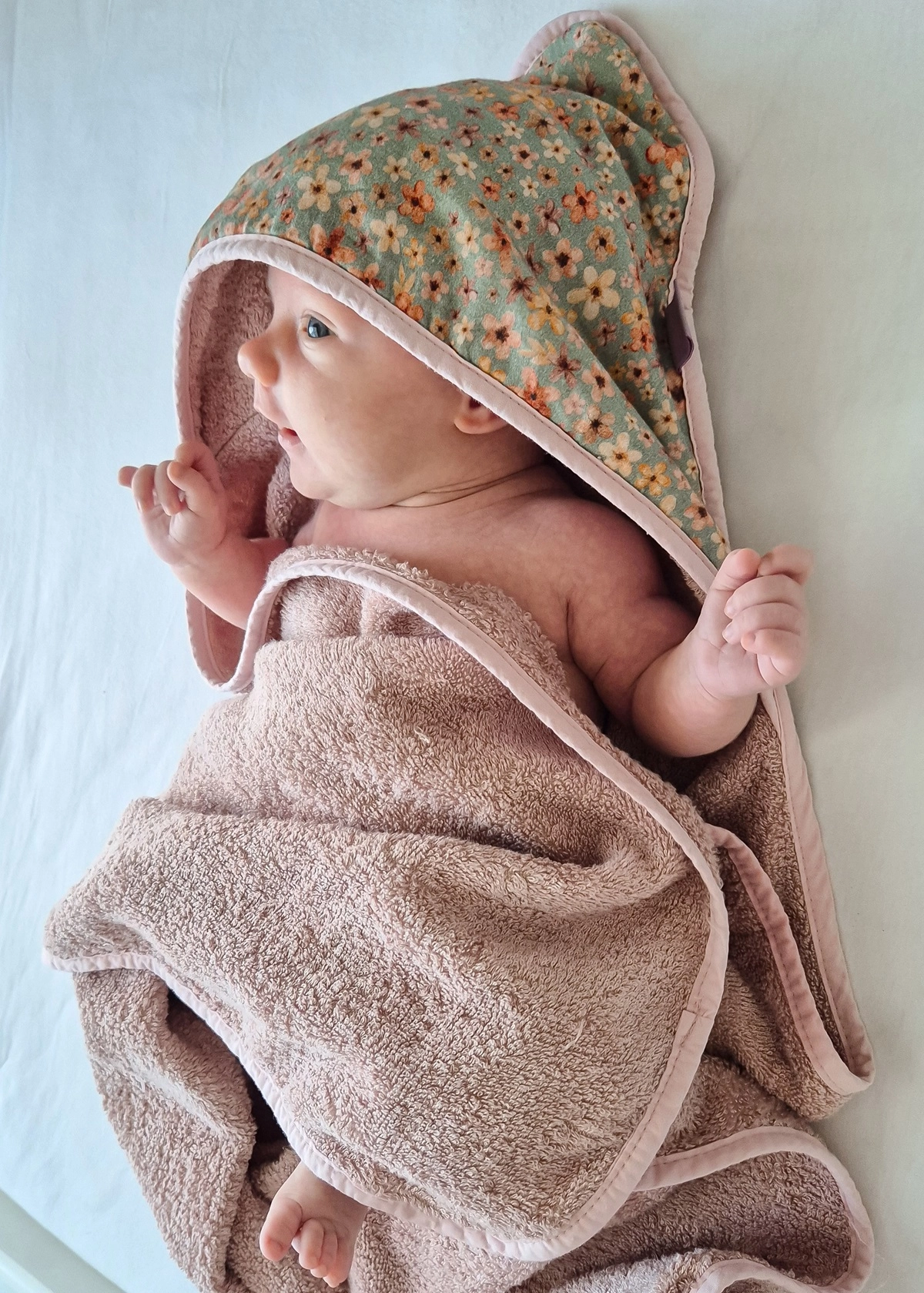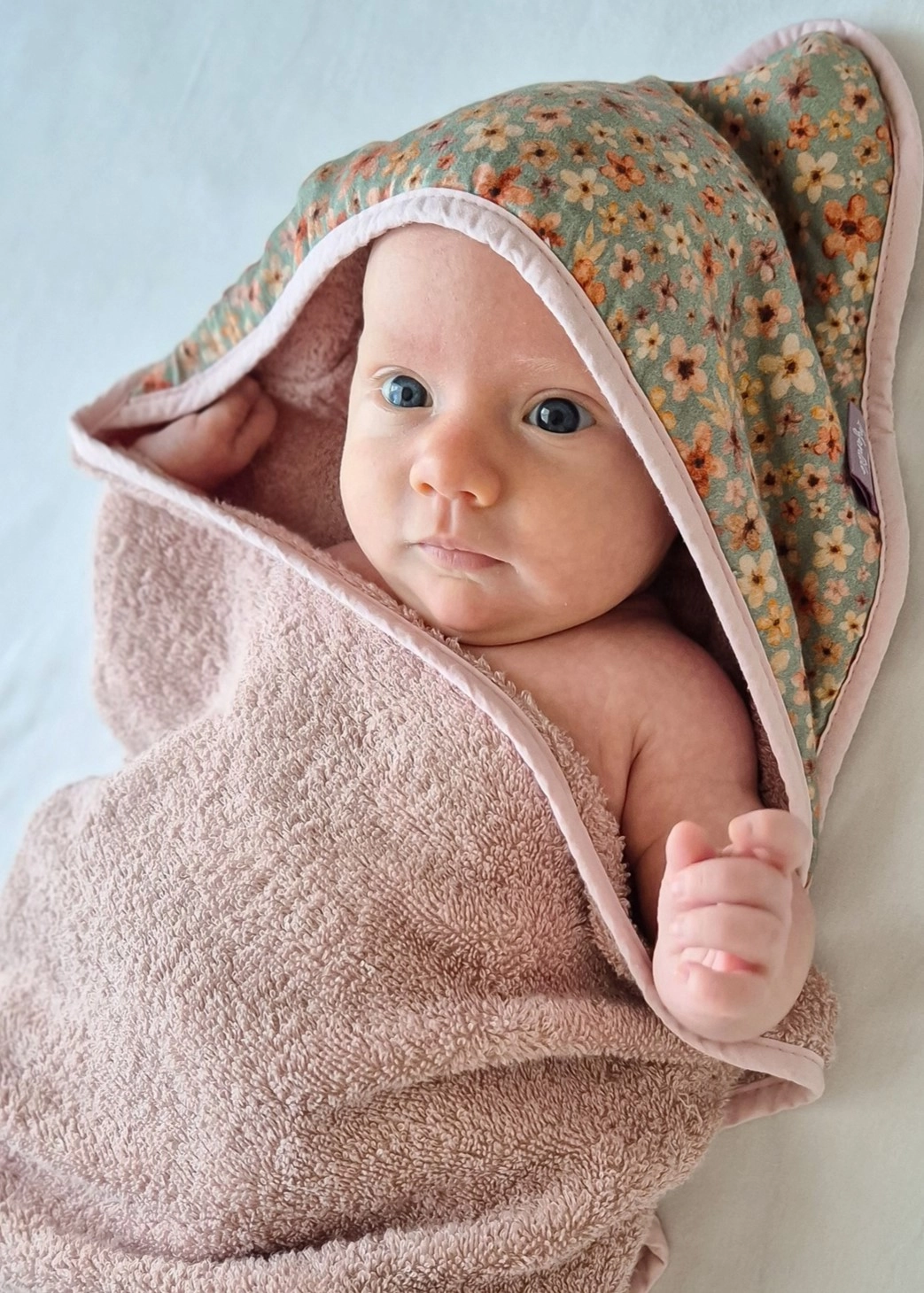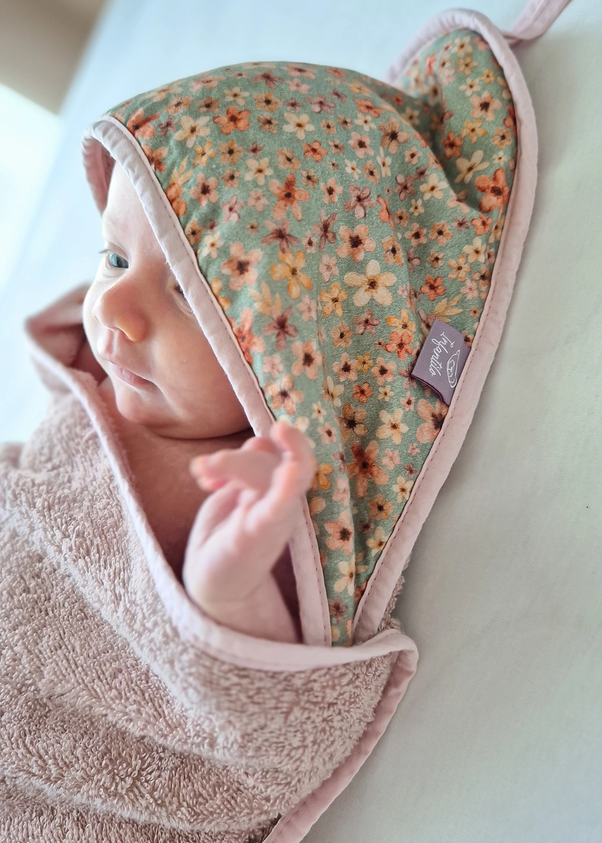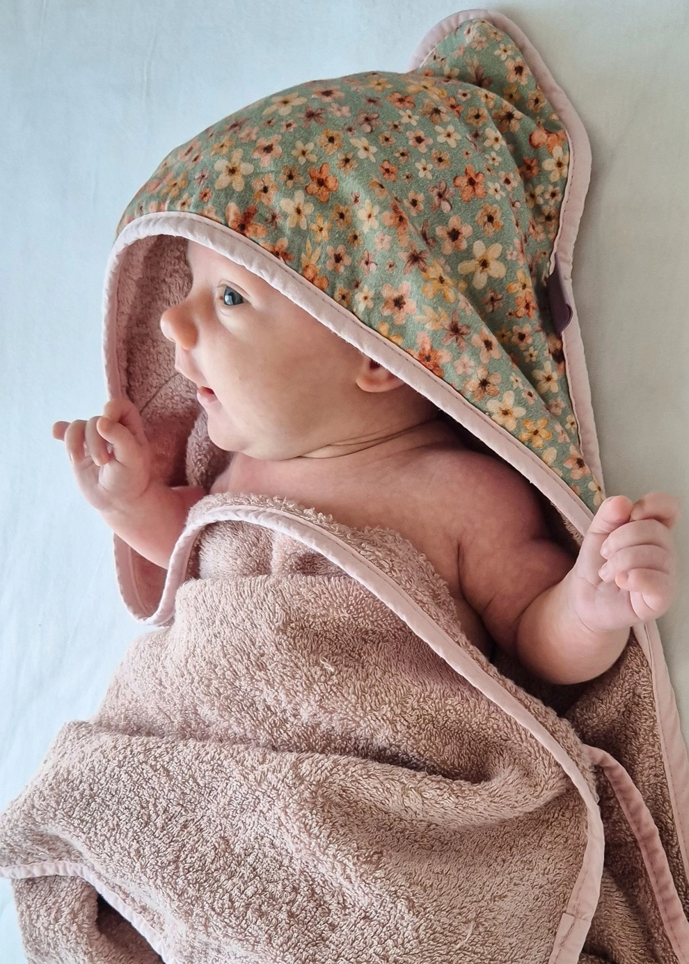 Kapturek okrywający głowę doskonale wchłania wodę, dokładnie osuszając delikatną skórę dziecka.