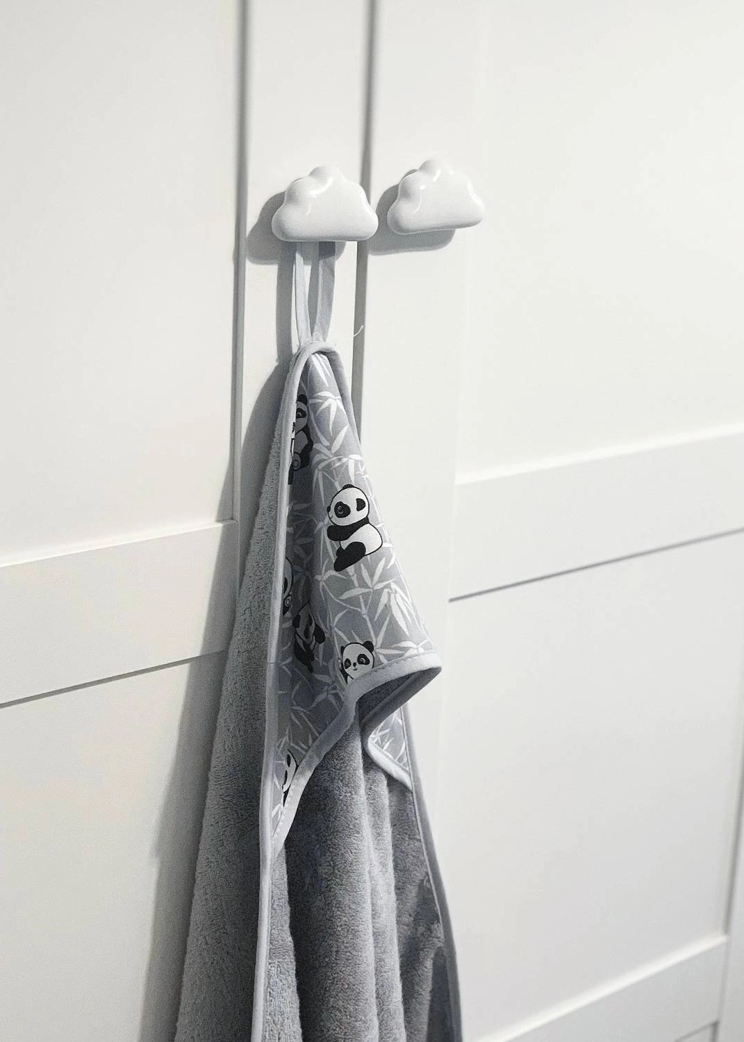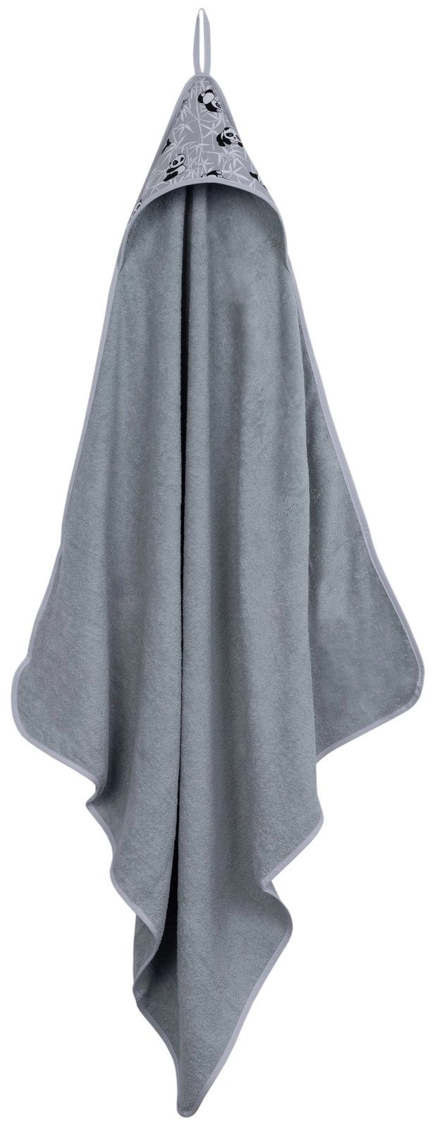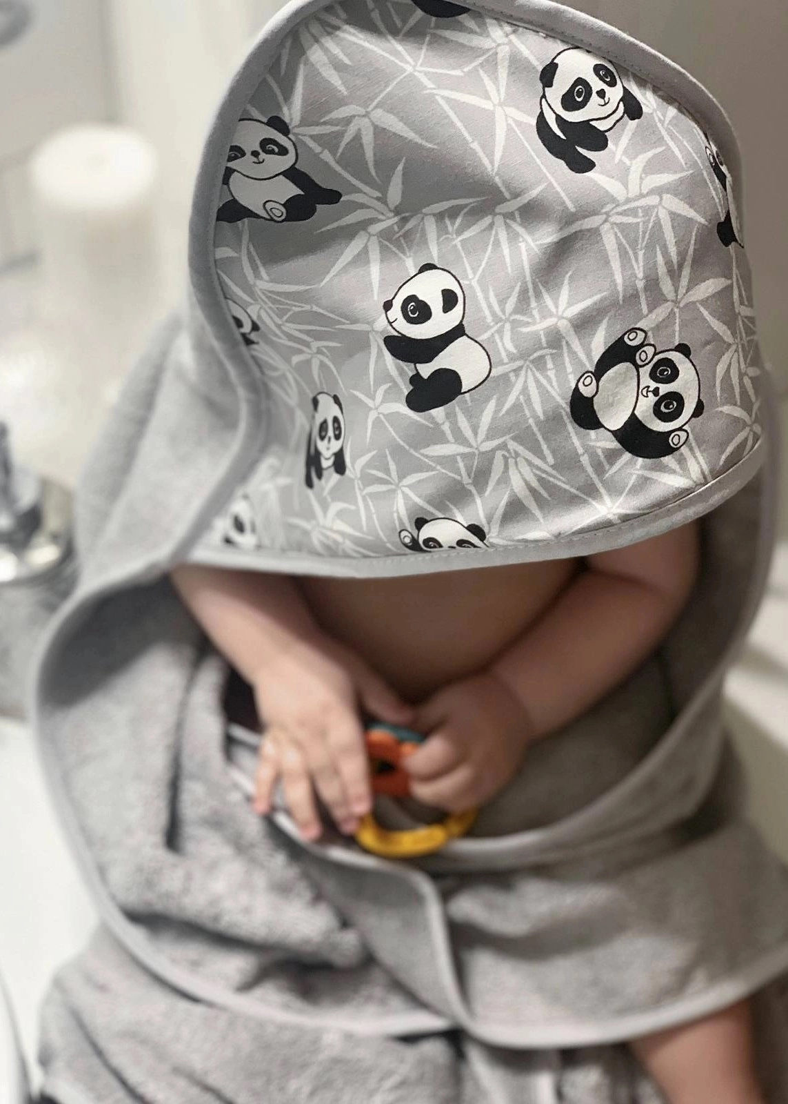 Kapturek okrywający głowę doskonale wchłania wodę, dokładnie osuszając delikatną skórę dziecka.