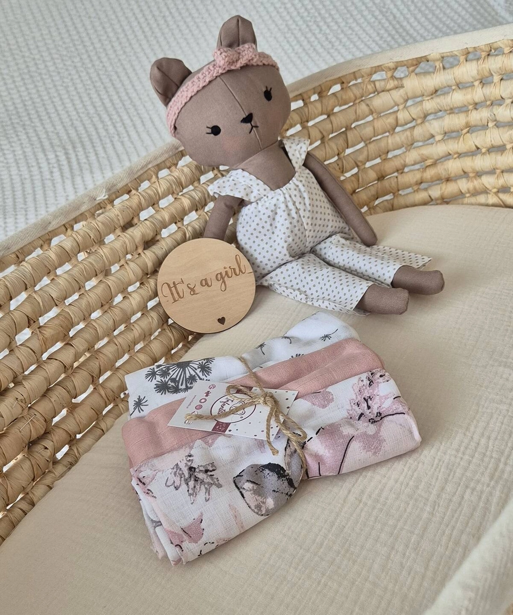 • Muślin jest to dwuwarstwowa tetra z 100% bawełny, cechująca się niezwykłą lekkością i przewiewnością. Pieluszki z tego materiału mogą