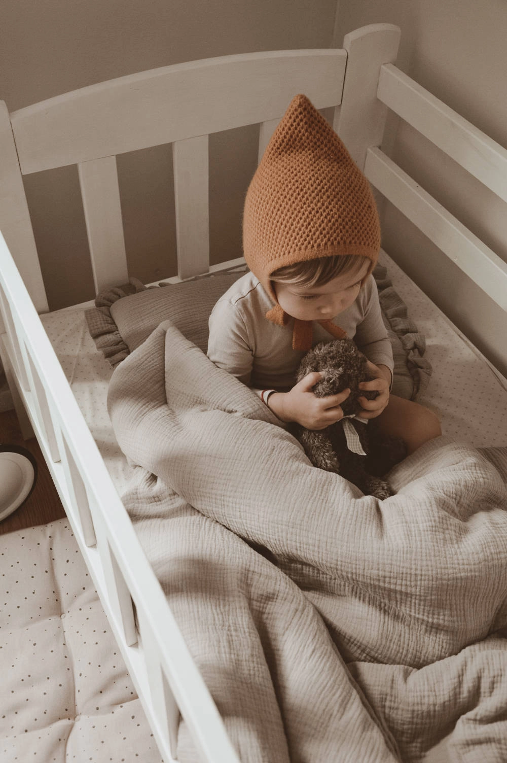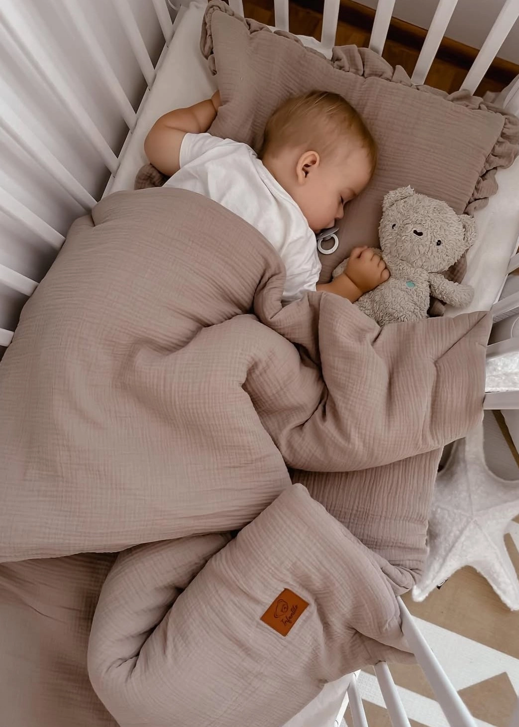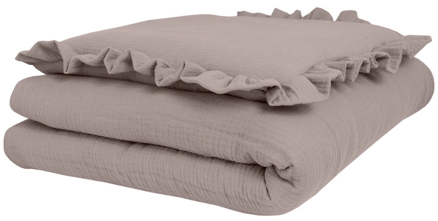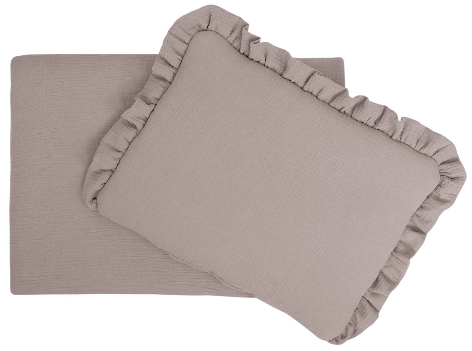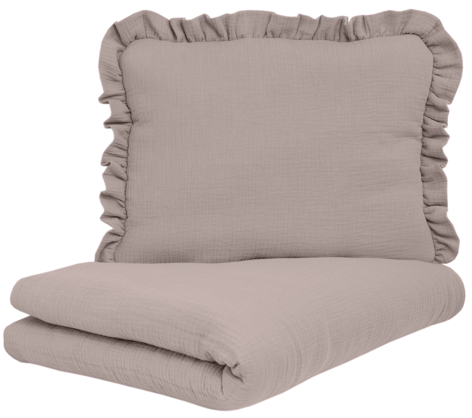 Komplet pościeli uszyty z najwyższej jakości muślinu bawełnianego double gaze. Składa się z poduszki w rozmiarze 40x50cm obszytej dekoracyjną falbanką oraz kołderki 120x90cm.