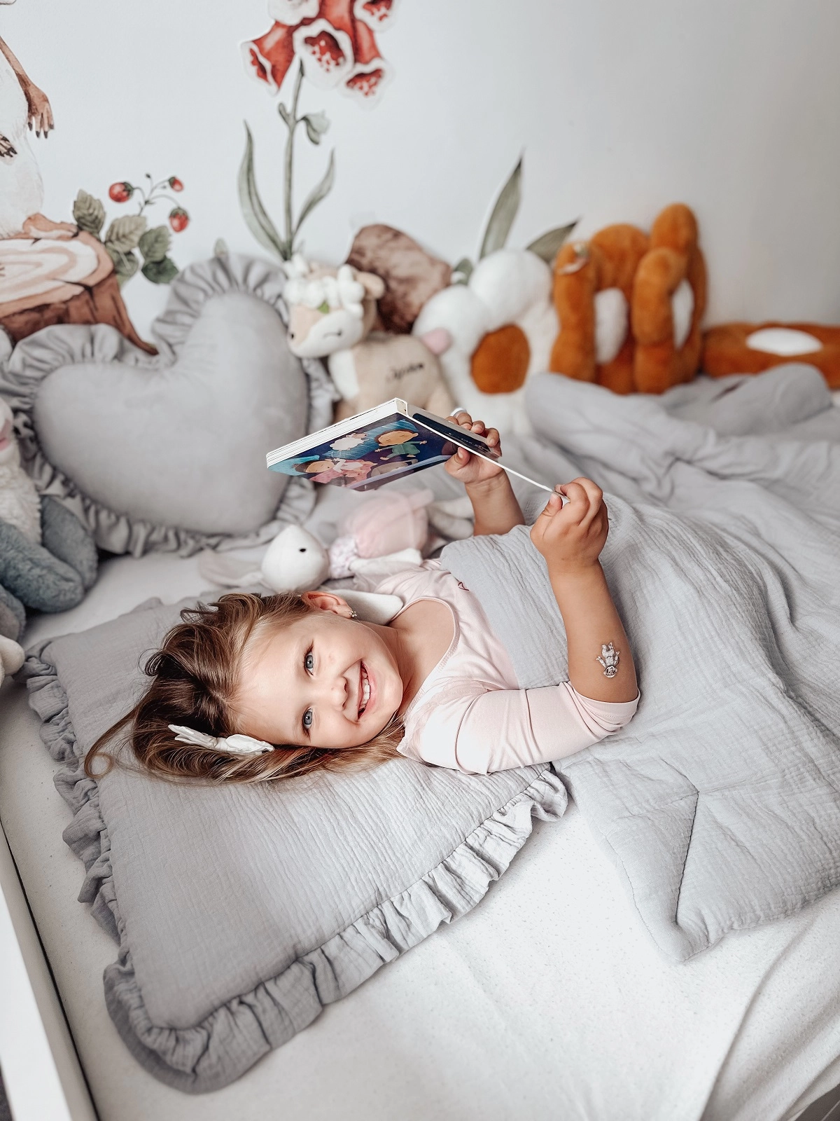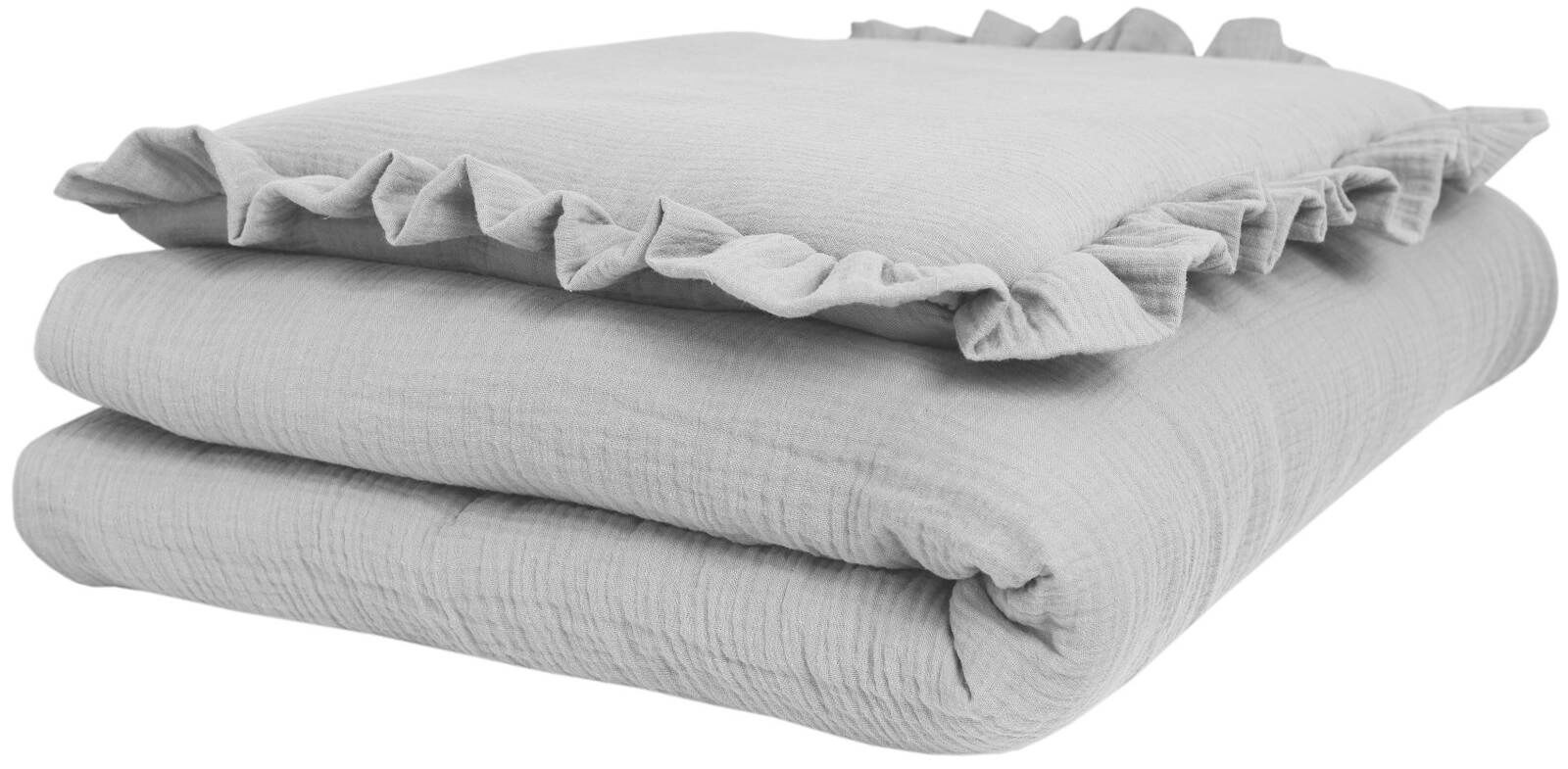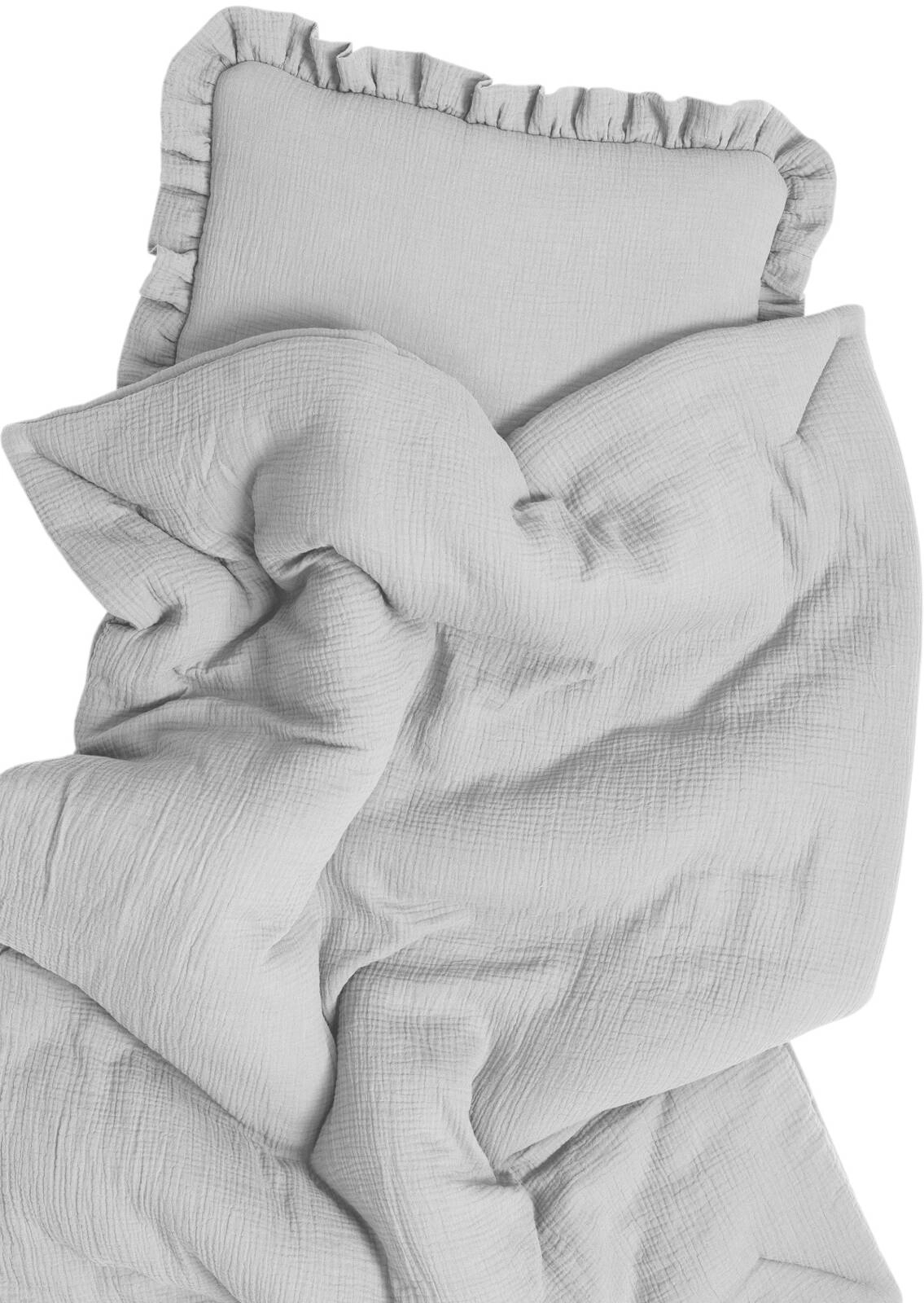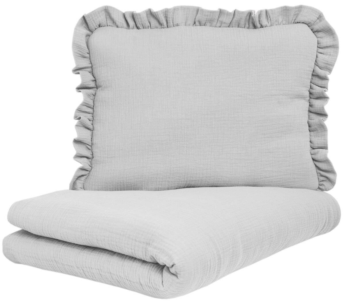 Komplet pościeli uszyty z najwyższej jakości muślinu bawełnianego double gaze. Składa się z poduszki w rozmiarze 40x50cm obszytej dekoracyjną falbanką oraz kołderki 120x90cm.