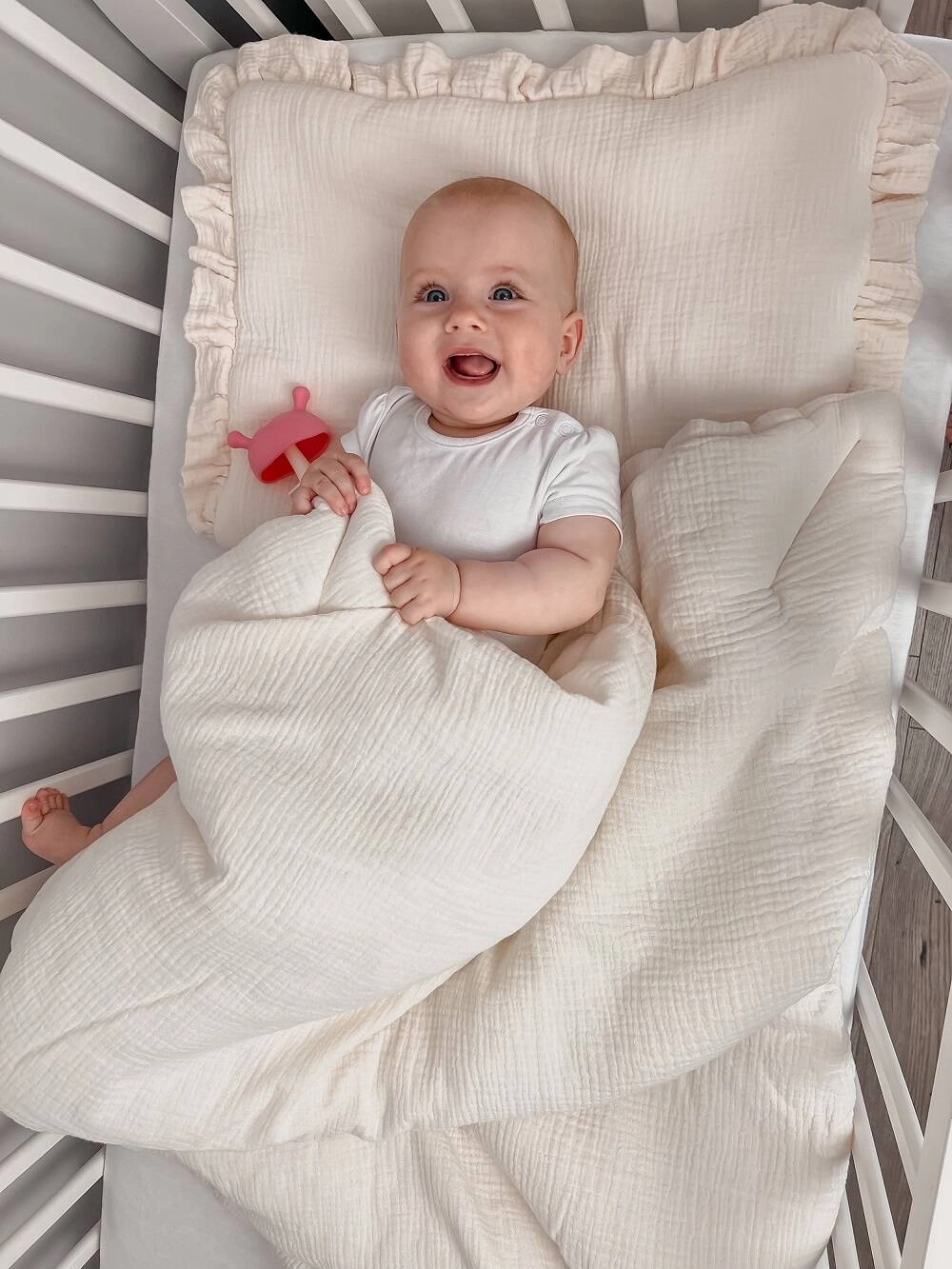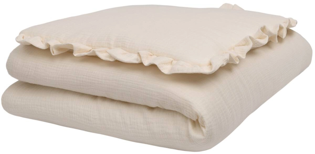 Komplet pościeli uszyty z najwyższej jakości muślinu bawełnianego double gaze. Składa się z poduszki w rozmiarze 40x50cm obszytej dekoracyjną falbanką oraz kołderki 120x90cm.