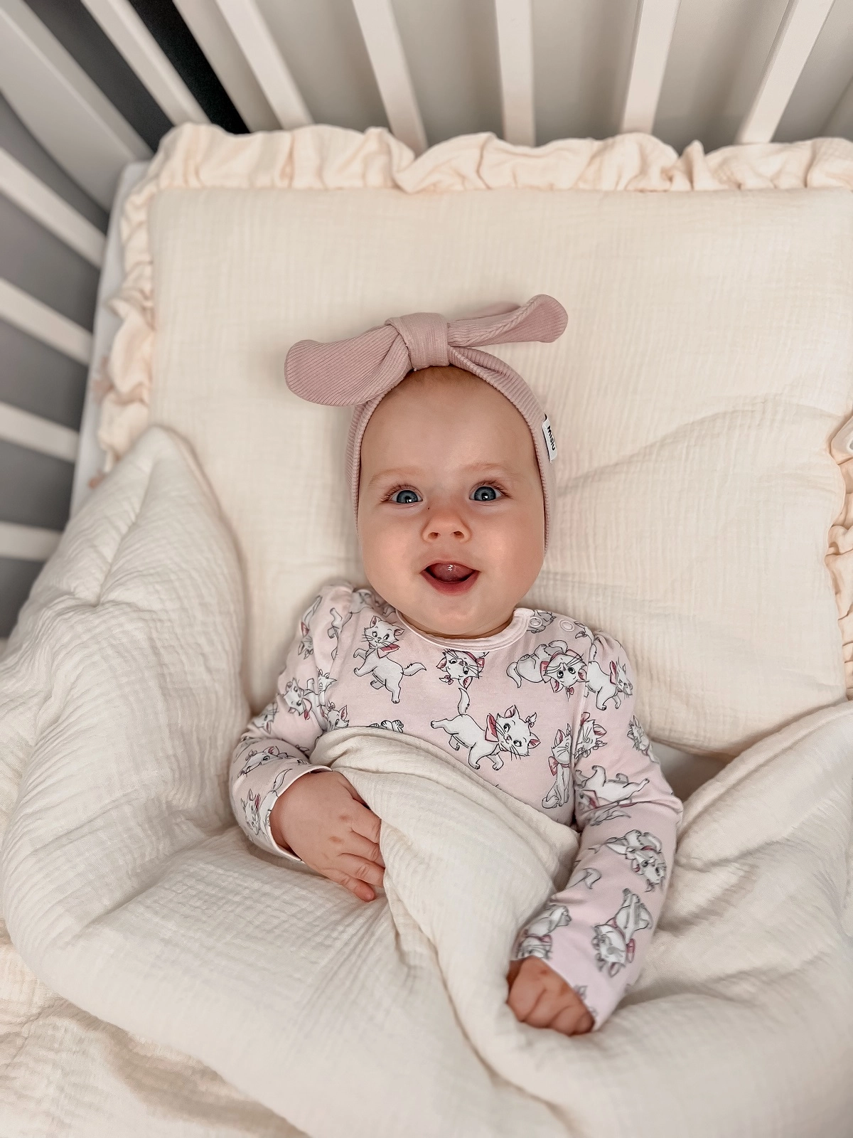 Poduszka posiada wszyte na stałe wypełnienie. Jest ono płaskie +/- 3cm, dzięki temu idealnie sprawdzi się dla maluszków już od pierwszych dni życia. Poduszka jest obszyta z trzech stron dekoracyjną falbanką.