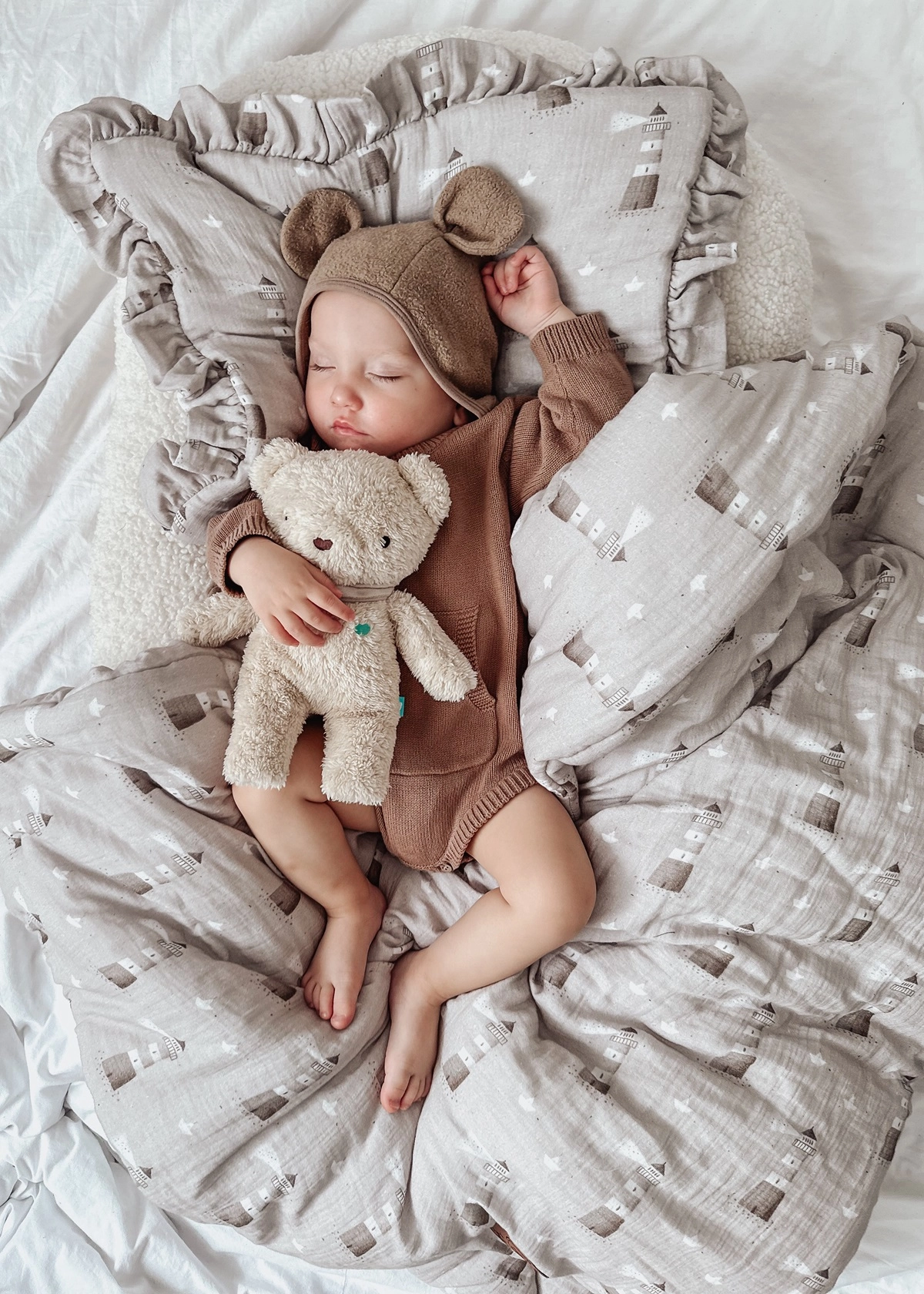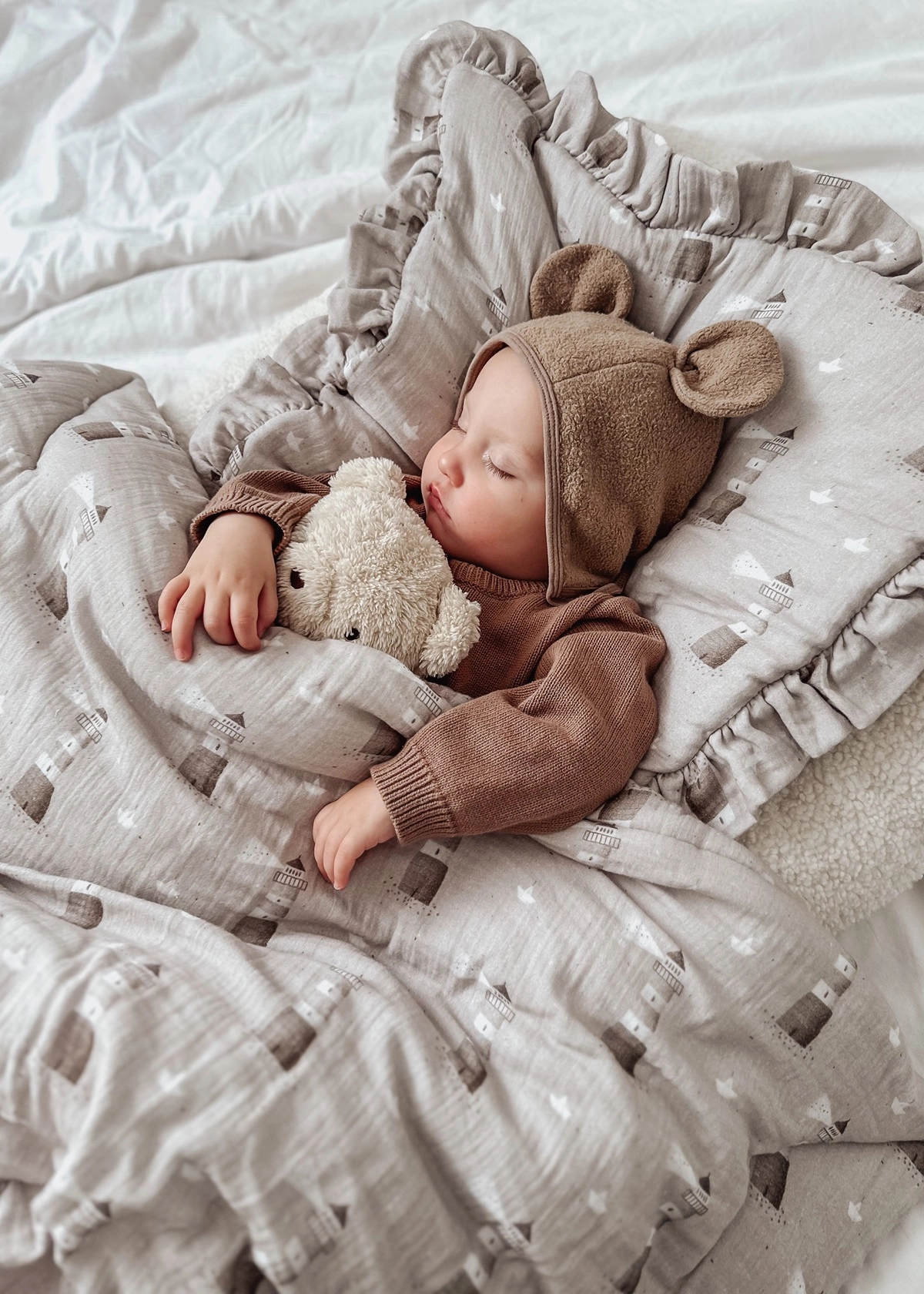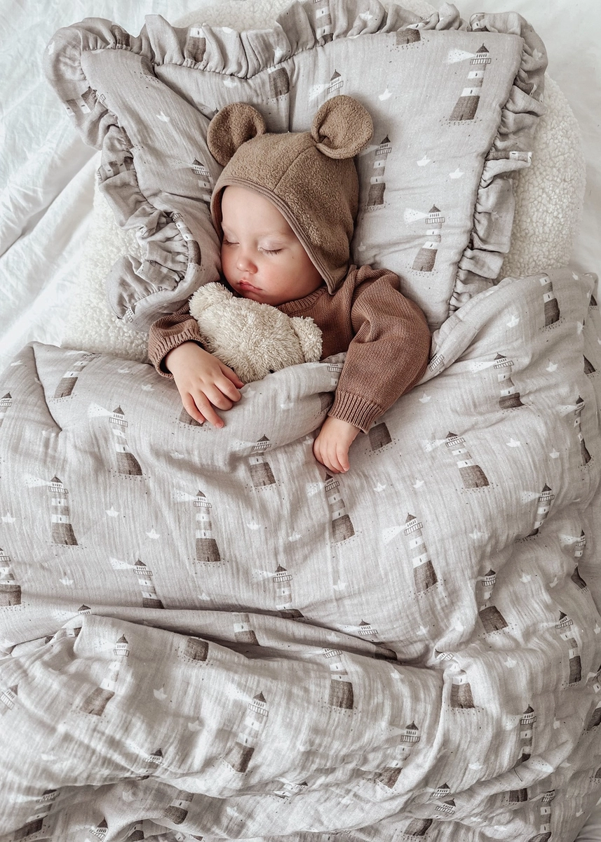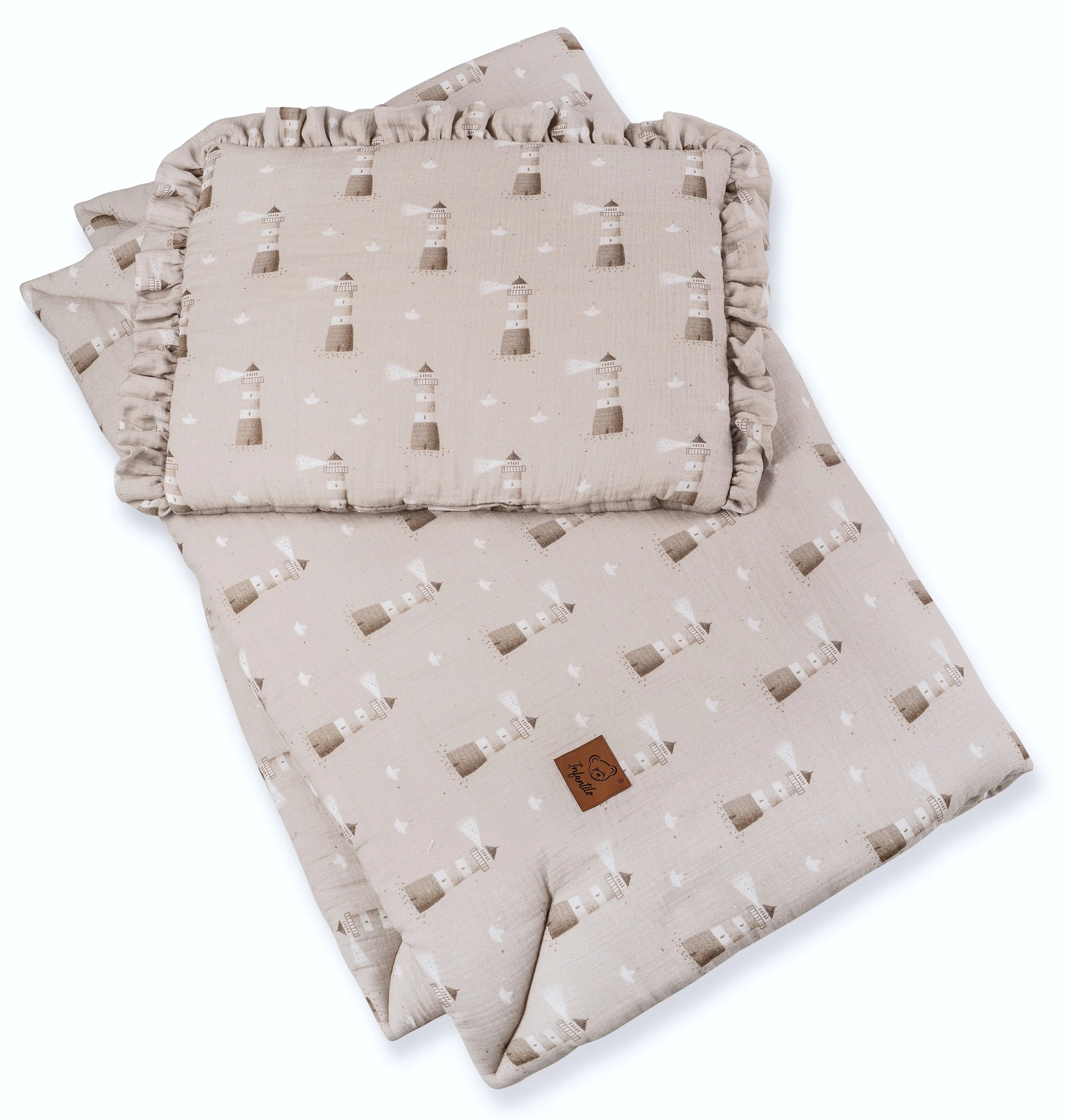 Komplet pościeli uszyty z najwyższej jakości muślinu bawełnianego double gaze. Składa się z poduszki w rozmiarze 40x50cm obszytej dekoracyjną falbanką oraz kołderki 120x90cm.