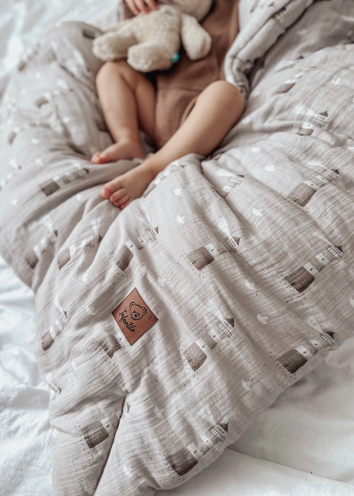 Kołderka muślinowa z wszytym na stałe wypełnieniem zapewni ciepły i spokojny sen maluszkowi. Wypełnienie jest wszyte w szwy oraz dodatkowo przeszyte w rogach , aby nie ulegało przemieszczeniu podczas prania i użytkowania.