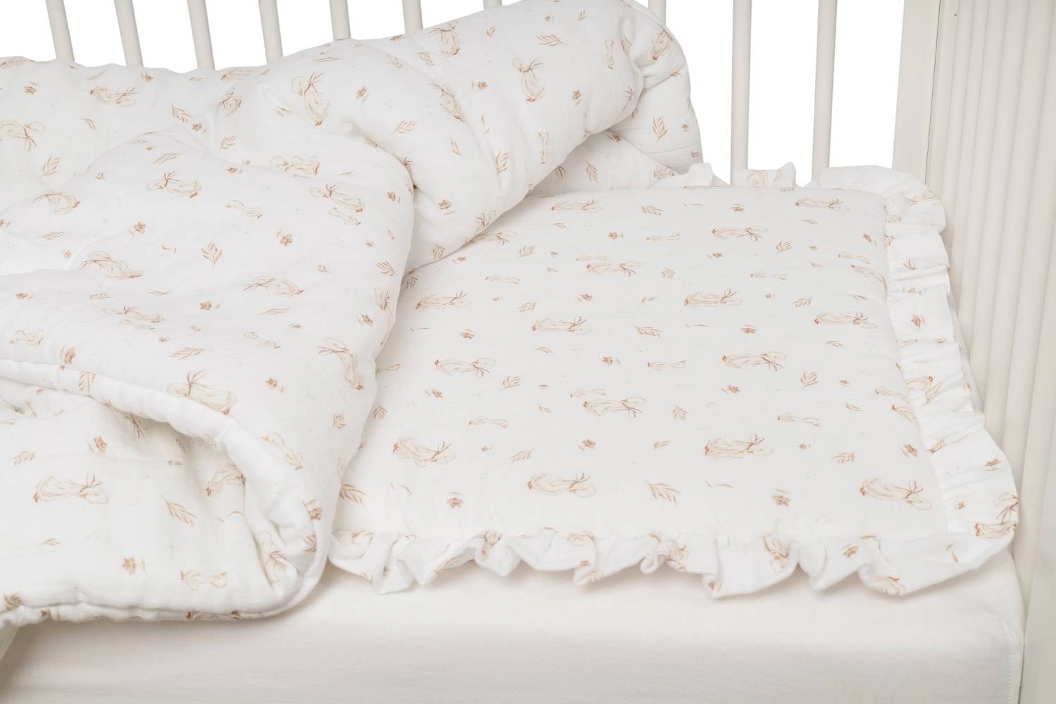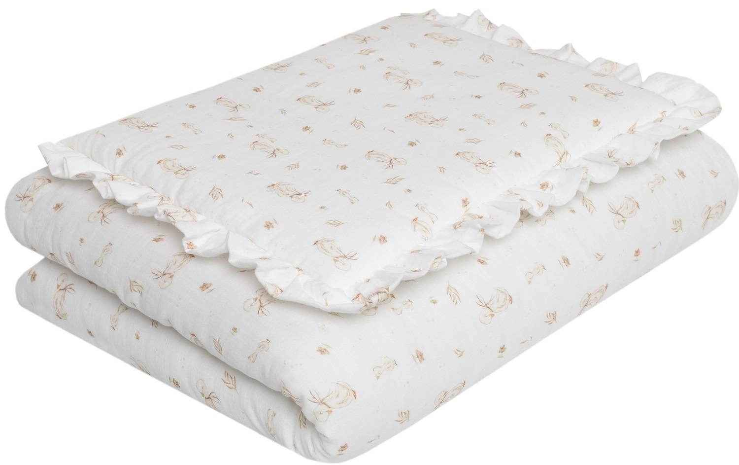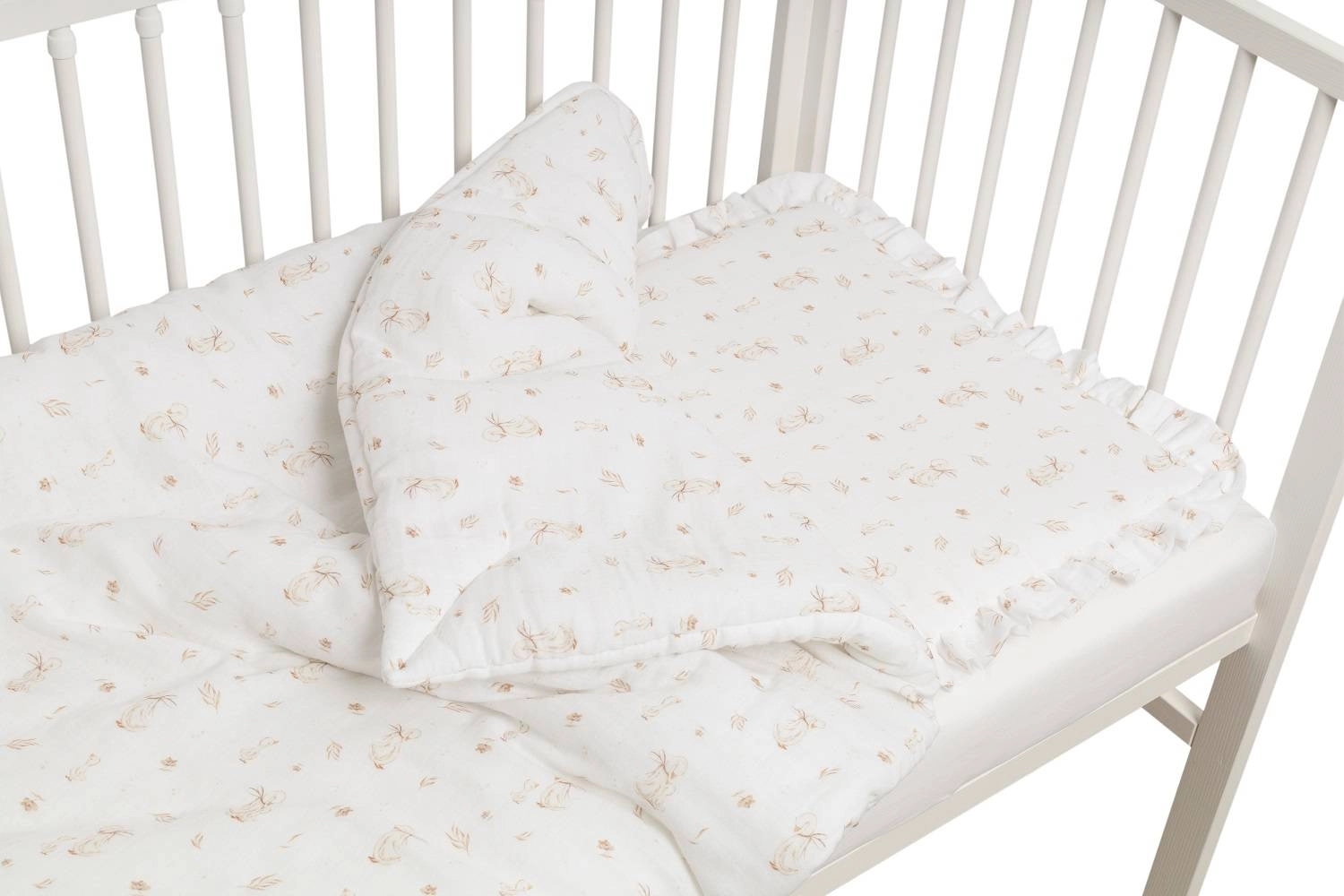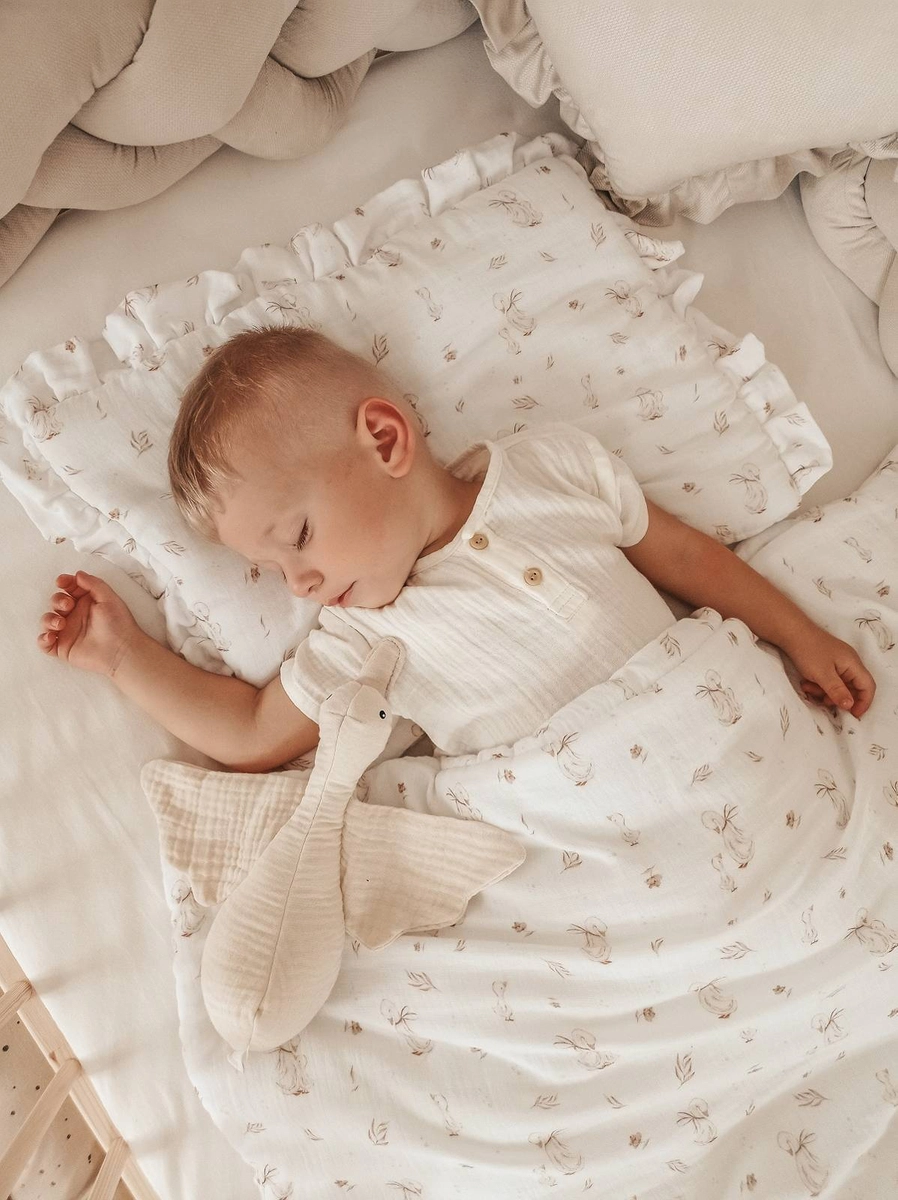 Komplet pościeli uszyty z najwyższej jakości muślinu bawełnianego double gaze. Składa się z poduszki w rozmiarze 40x50cm obszytej dekoracyjną falbanką oraz kołderki 120x90cm.