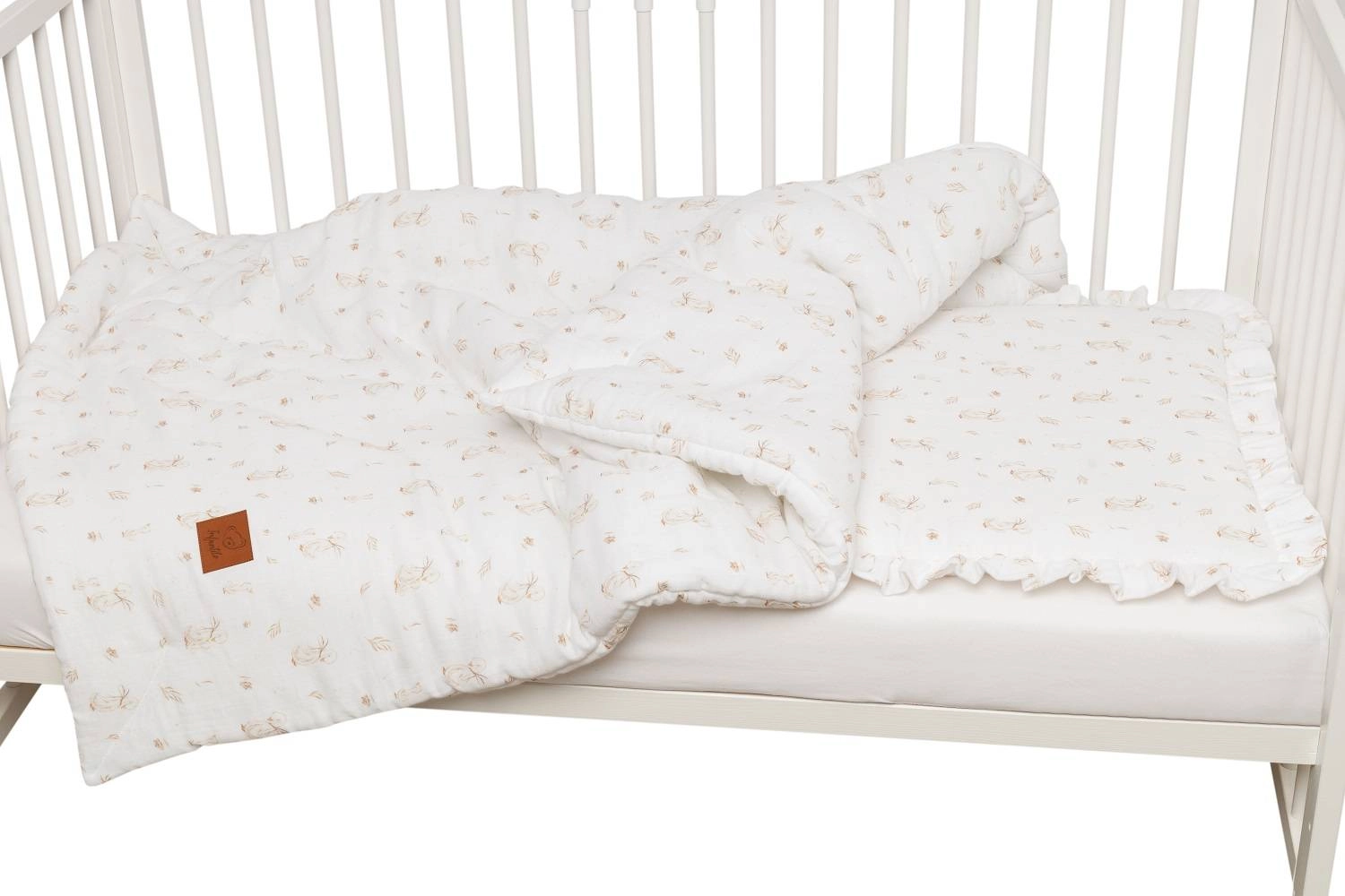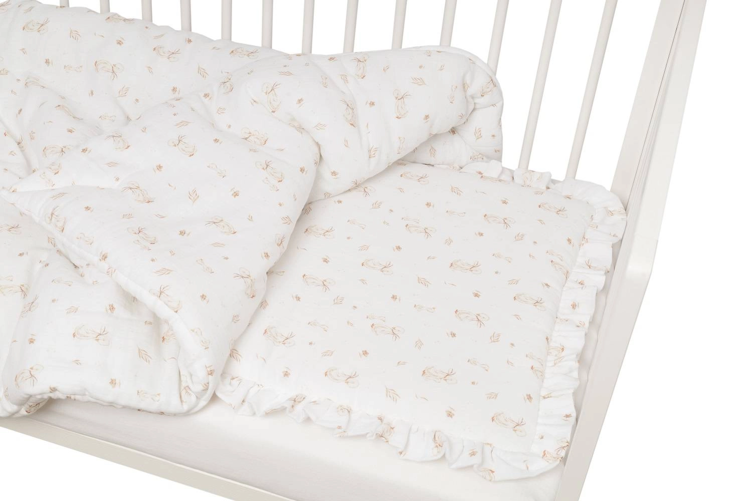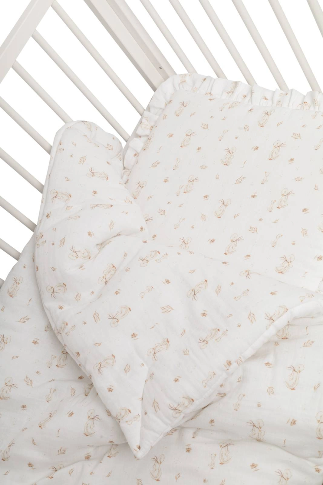 Komplet pościeli uszyty z najwyższej jakości muślinu bawełnianego double gaze. Składa się z poduszki w rozmiarze 40x50cm obszytej dekoracyjną falbanką oraz kołderki 120x90cm.