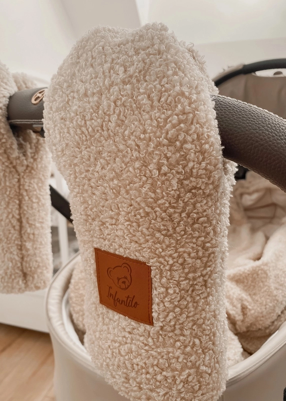 Stylowy komplet do wózka - Rękawice doskonale komponują się z innymi produktami z naszej kolekcji – śpiworkiem do wózka, kocykiem z kapturkiem czy pościelą, uszytymi z tej samej tkaniny o strukturze baranka boucle.