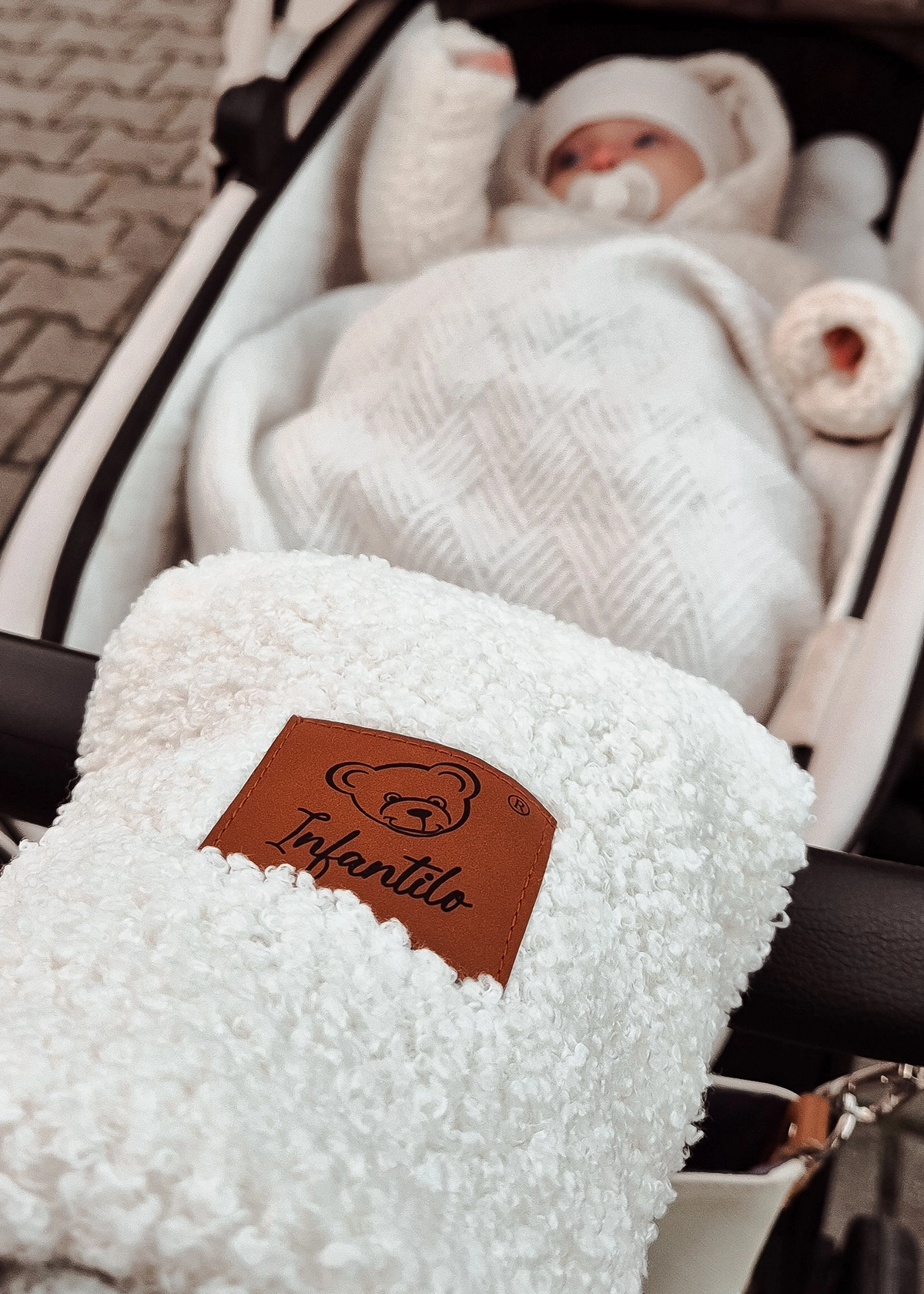 Stylowy komplet do wózka - Rękawice doskonale komponują się z innymi produktami z naszej kolekcji – śpiworkiem do wózka, kocykiem z kapturkiem czy pościelą, uszytymi z tej samej tkaniny o strukturze baranka boucle.