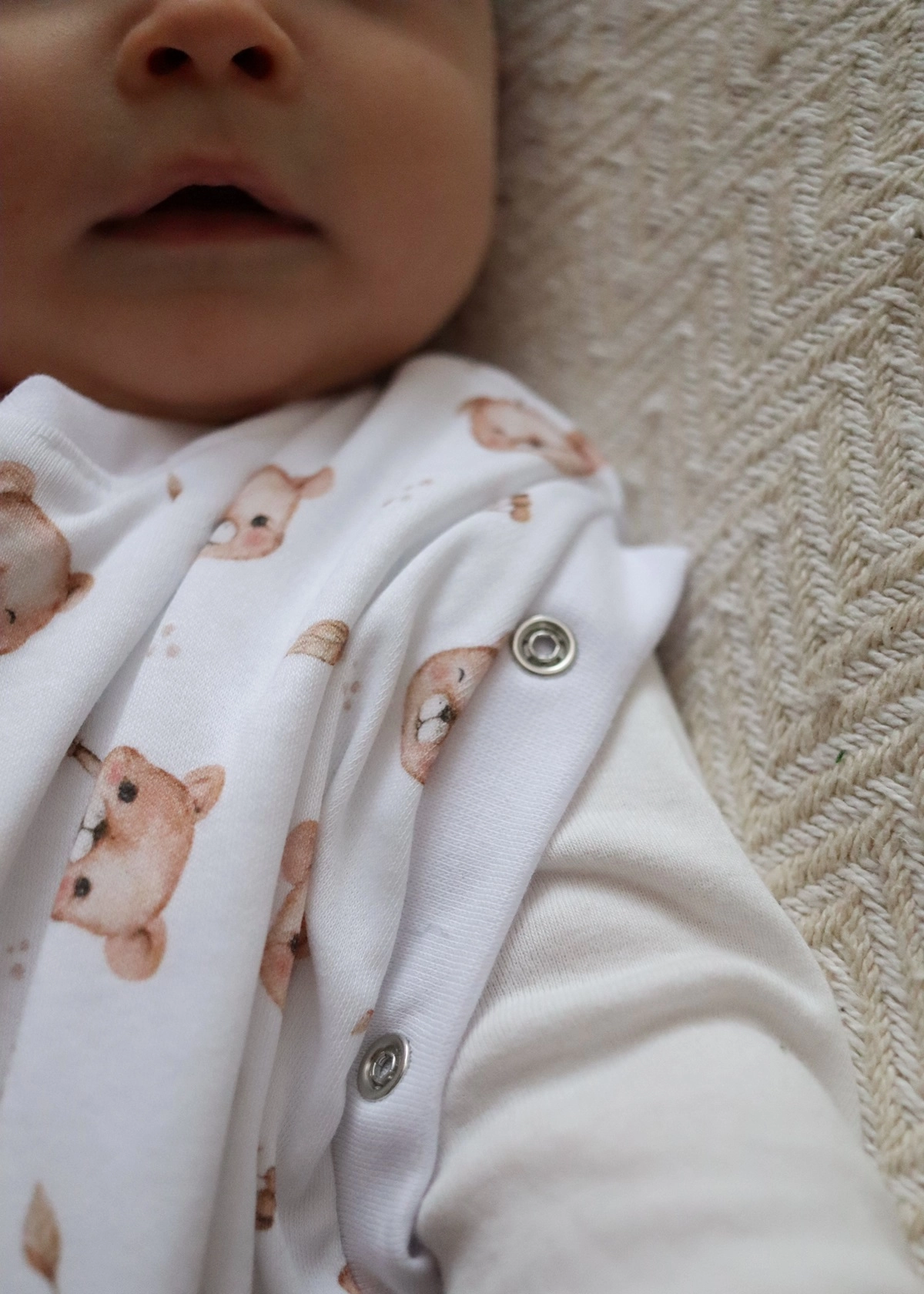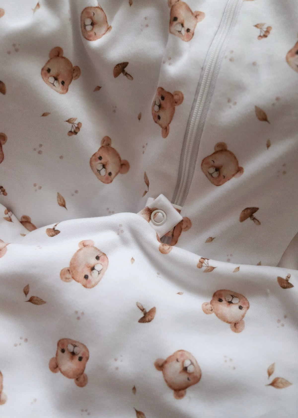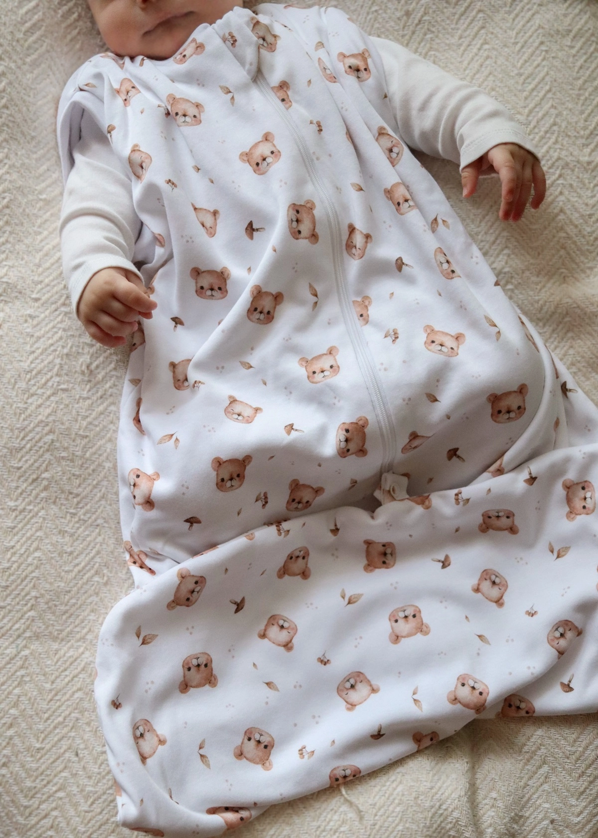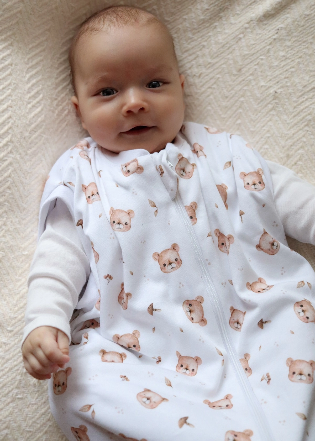 - Regulowana długość - w śpiworku dla noworodka możemy podpiąć dolną cześć, zapewniając maluszkowi poczucie otulenia całego ciała.