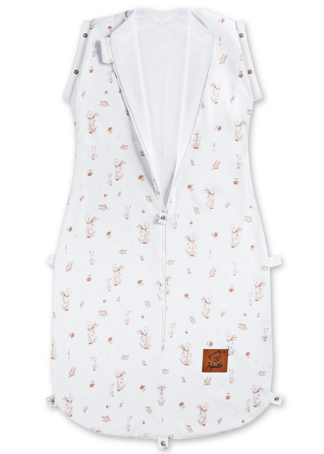 Idealny na cały rok – lekki, elastyczny i przyjemnie otulający, śpiworek utrzymuje optymalną temperaturę ciała dziecka bez ryzyka przegrzania. Śpiworek zasuwany jest na dwustronny suwak, z możliwością rozsunięcia od góry lub tylko od dołu, np. w celu zmiany pieluszki śpiącemu dziecku. Specjalny kształt śpiworka oraz zapięcie na napki w miejscu rączek dziecka pozwala na stworzenie otulacza, który zapewnia noworodkom poczucie bezpieczeństwa. Dzięki temu, że rączki dziecka znajdują się blisko ciała, zapobiega odruchowi Moro (to niekontrolowane ruchy rączkami, które wybudzają dziecko i wywołują płacz). W miarę rozwoju dziecka, w pierwszym etapie możemy rozpiąć tylko jeden "rękawek" tak, aby jedna rączka nadal pozostała schowana w śpiworku. Dzięki temu niemowlę stopniowo przyzwyczaja się do spania w wolnej przestrzeni.