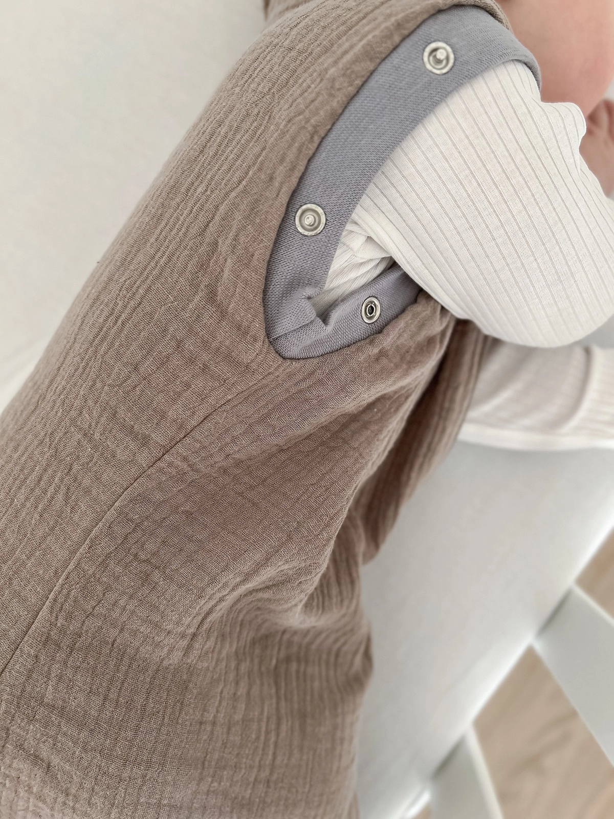 Otulacz i śpiworek w jednym - napki przy ramionkach pozwalają na stworzenie otulającego kroju, który daje niemowlęciu poczucie bezpieczeństwa.
