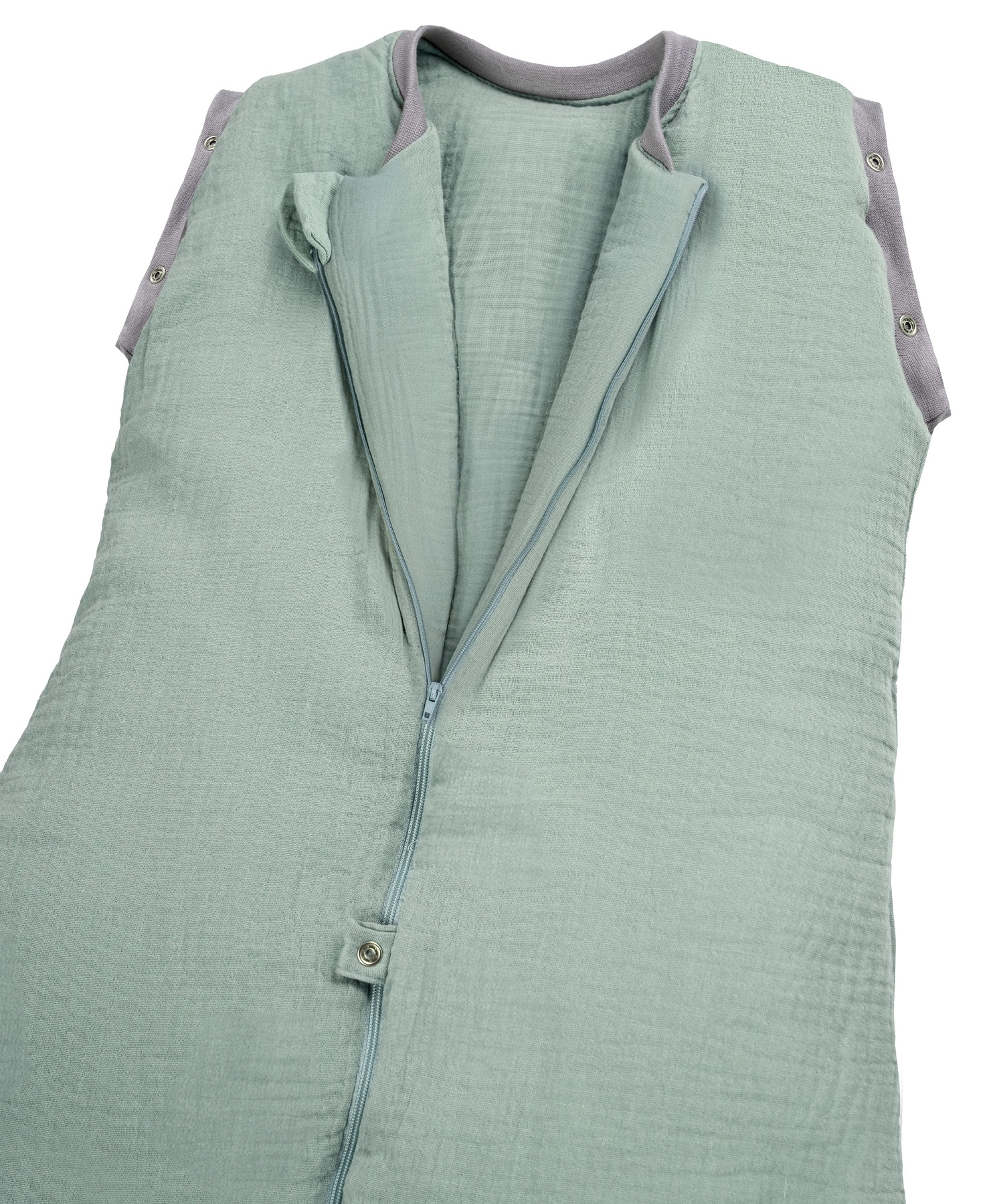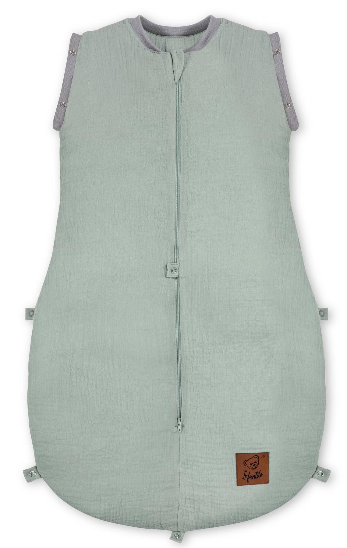 - Regulowany rozmiar – śpiworek „rośnie” razem z dzieckiem. Dzięki napom w dolnej części można łatwo dostosować długość do wieku maluszka.