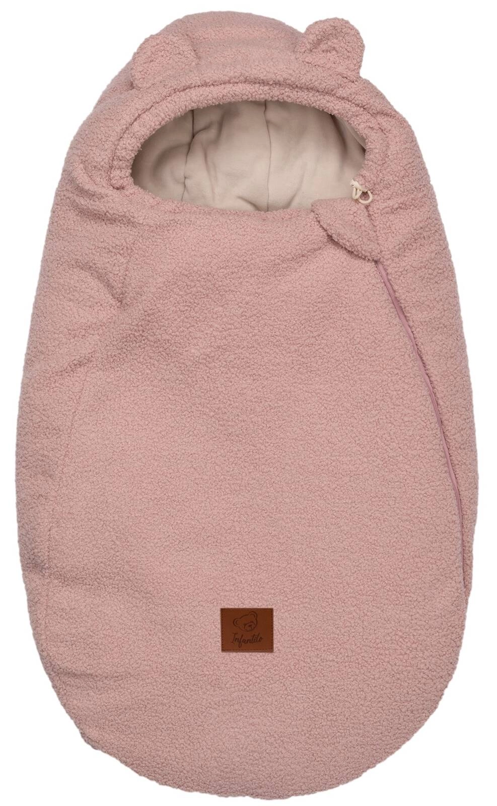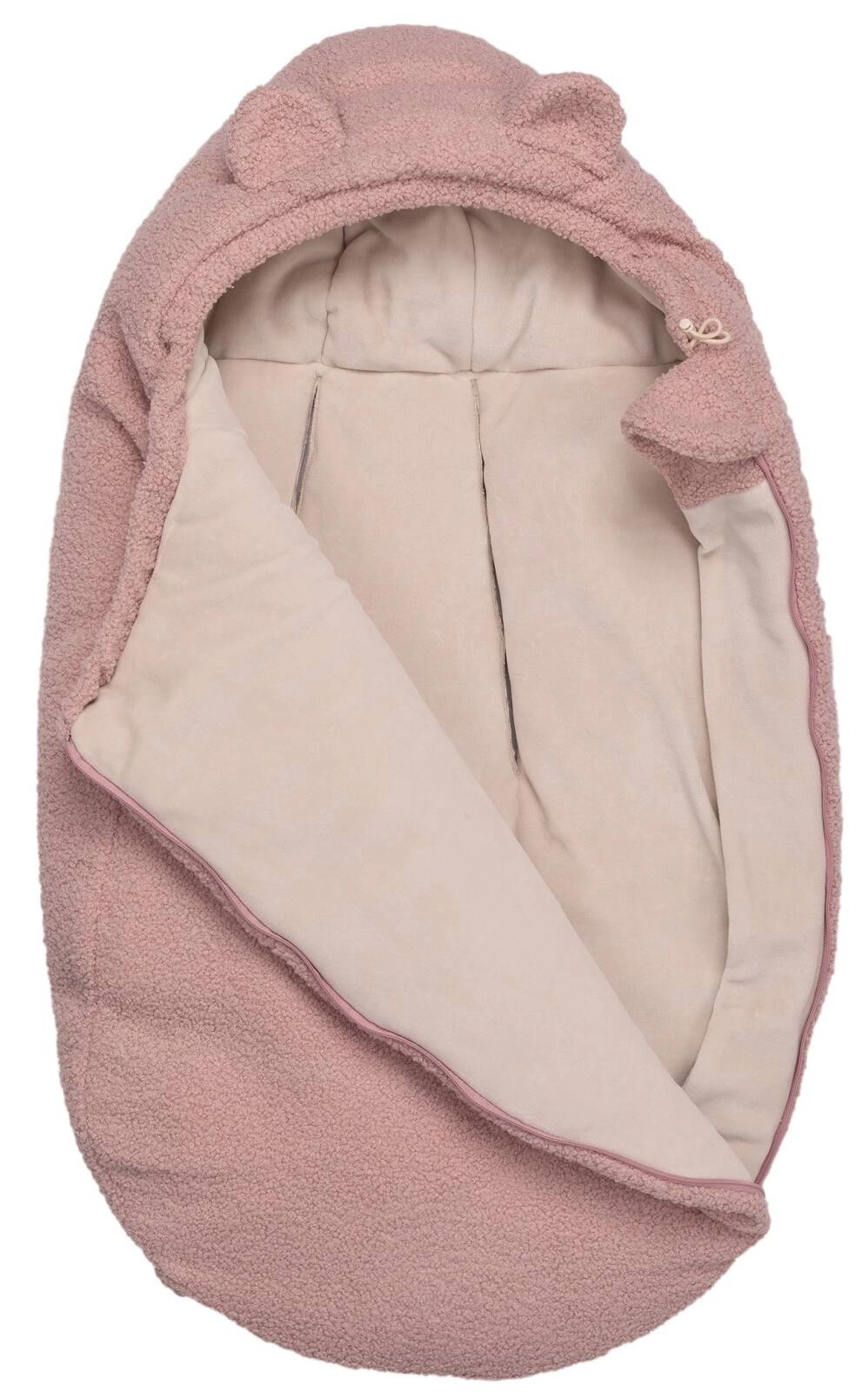 Wnętrze śpiworka wykonane jest z miękkiego weluru bawełnianego, który jest przyjazny dla skóry dziecka. Zewnętrzna warstwa to elegancka tkanina boucle o strukturze baranka. Wypełnienie stanowi antyalergiczna włóknina silikonowa, wszyta w szwy, co zapobiega jej przesuwaniu się podczas prania i użytkowania.