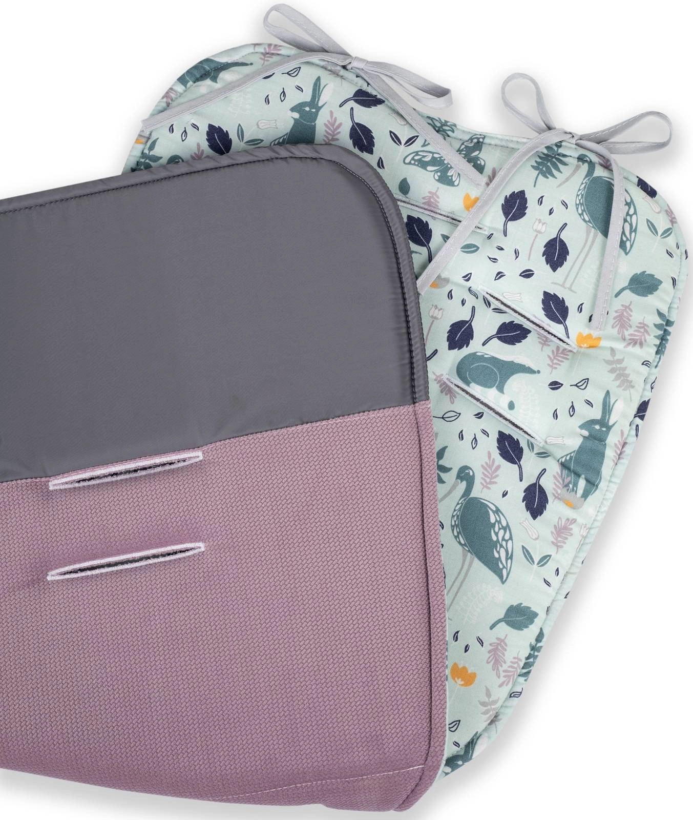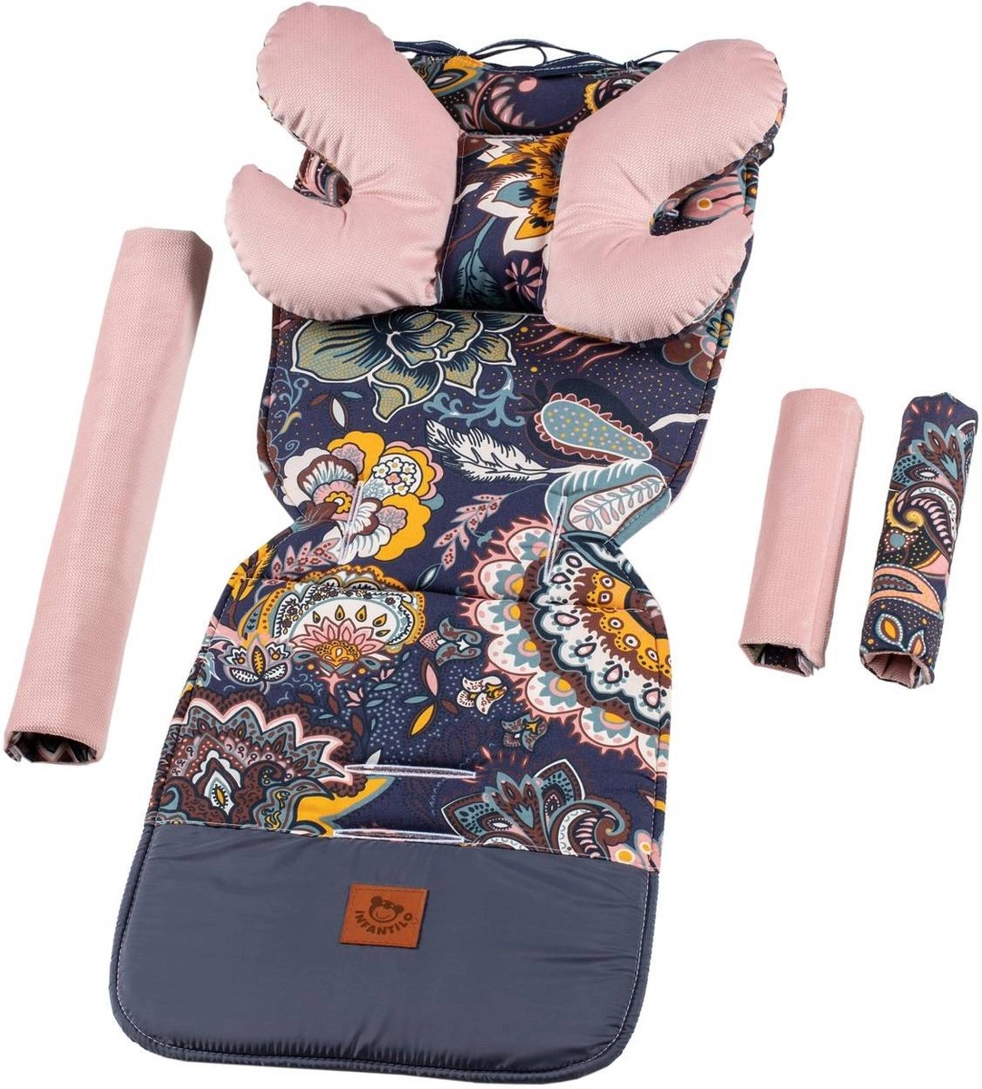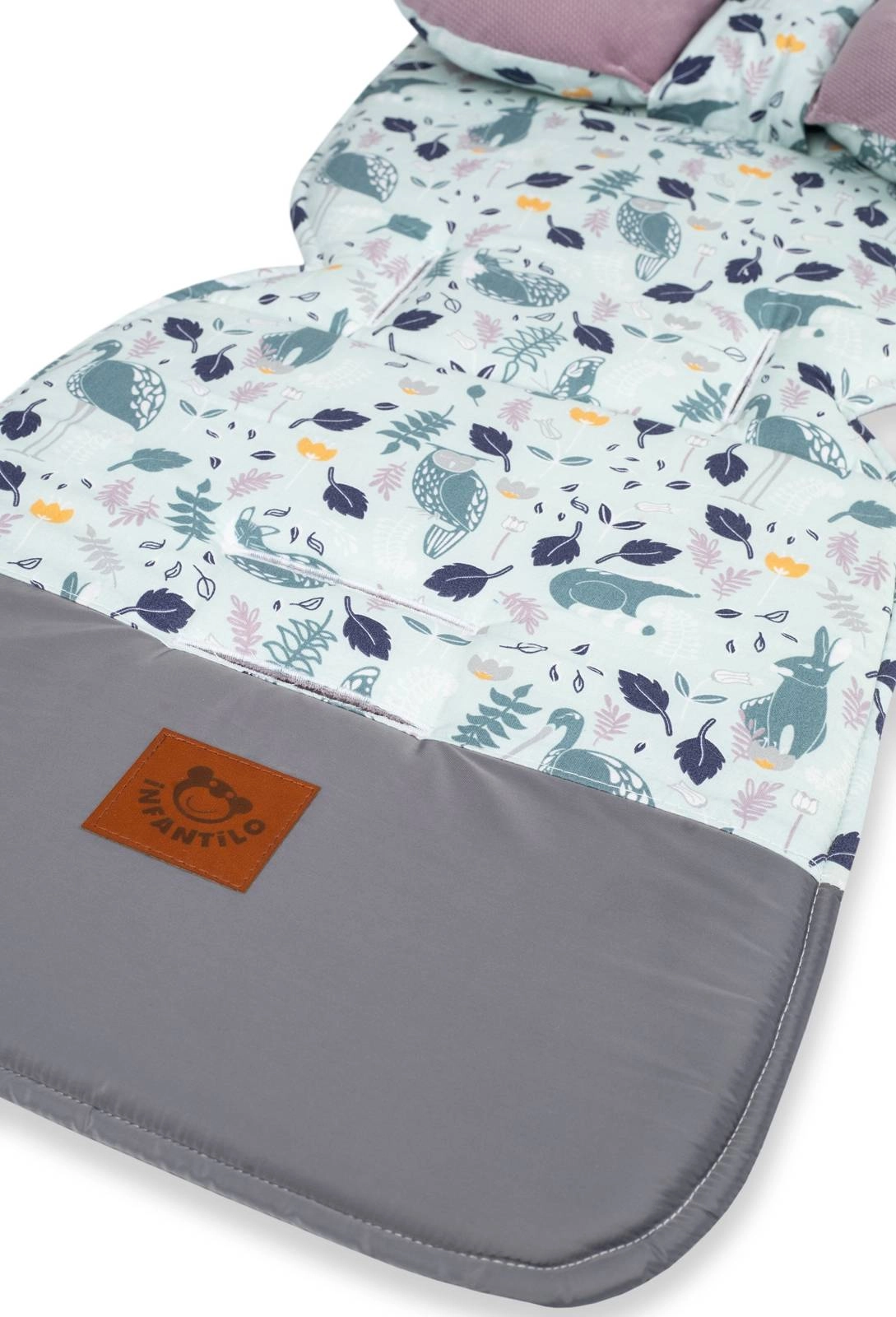 Dwustronną wkładkę do spacerówki wyposażoną w troczki do przymocowania na wózku, co zapobiega jej zsuwaniu się.